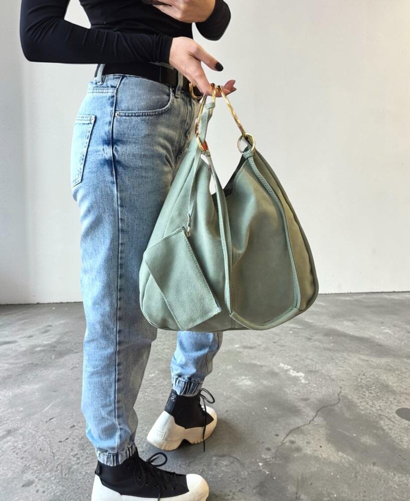 Praktická, športovo elegantná taško-kabelka v jemnej zelenej farbe z brúsenej kože s veľkými kovovými kruhmi – ušami. Kabelka väčšej veľkosti s dlhým ramienkom na rameno či krížom cez plece. Praktická no štýlová kabelka pre moderné ženy.