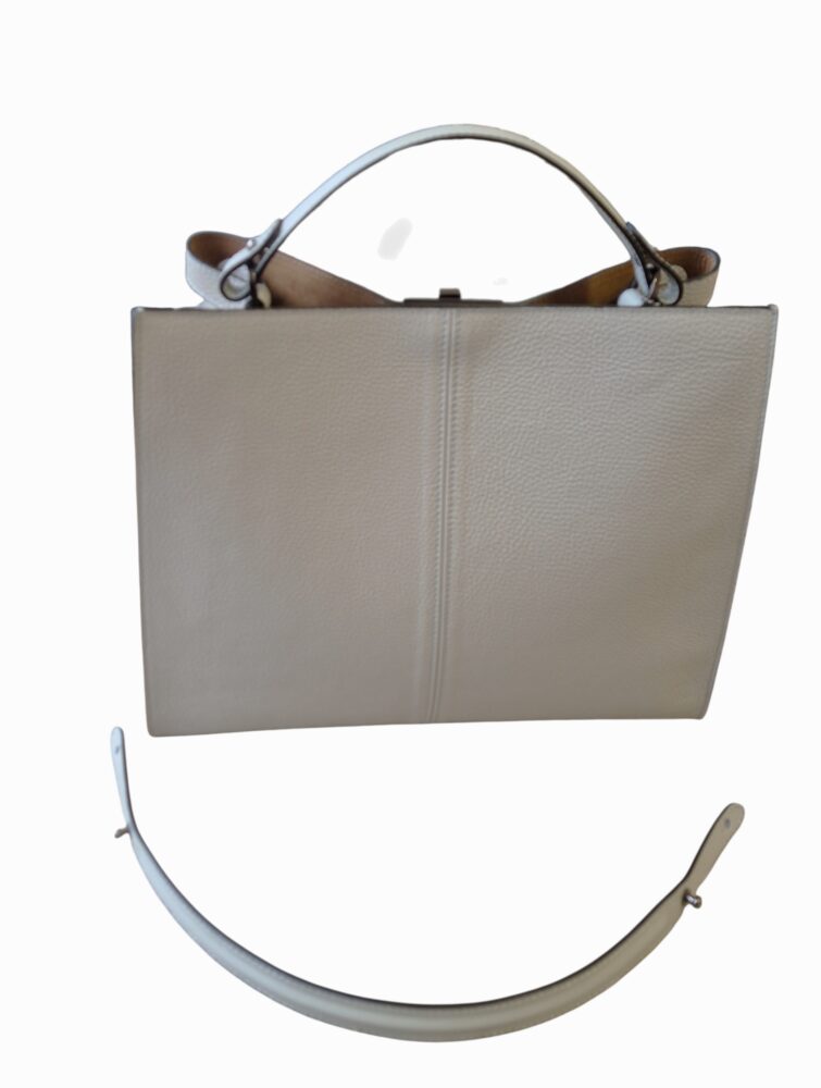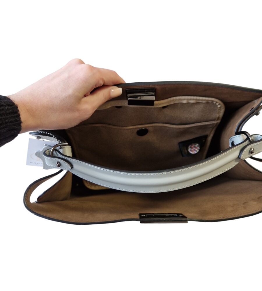 Elegantná dámska kožená kabelka v šedo sivej farbe vo formáte A4. S jedným uškom do ruky a náhradným dlhším ramienkom do ruky na plece. Vnútro kabelky obsahuje brúsenú kožu s jedným vreckom ktoré má zapínanie na magnet. Kabelka je väčšej veľkosti, takže sa do nej zmestí i A4 formát. Moderný dizajn a kvalitné spracovanie kože. Vyrobené na Slovensku.