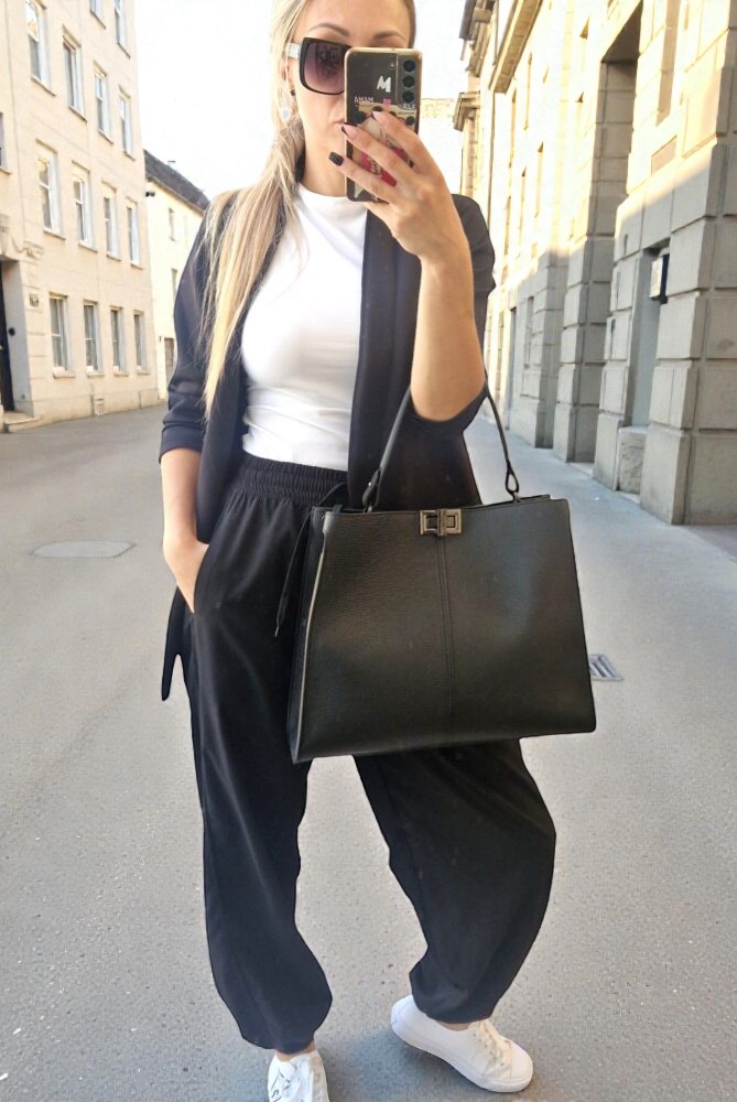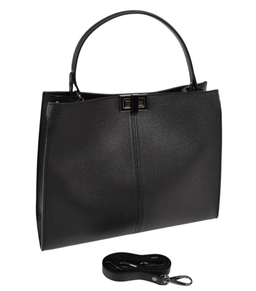 Praktická, štýlová dámska kožená kabelka v čiernej farbe s jedným uškom do ruky a náhradným dlhším uškom na nosenie na ramene. Vnútro kabelky obsahuje brúsenú kožu s jedným vreckom ktoré má zapínanie na magnet. Kabelka je väčšej veľkosti, takže sa do nej zmestí i A4 formát. Moderný dizajn a kvalitné spracovanie kože. Kabelka slovenskej kvality.