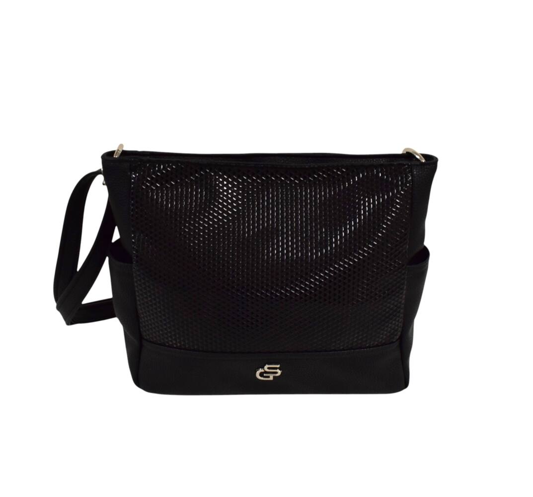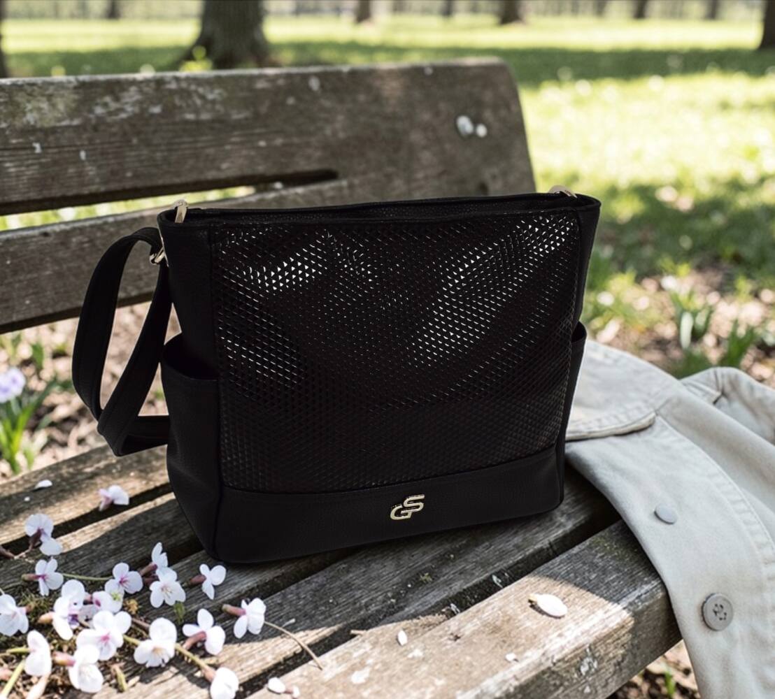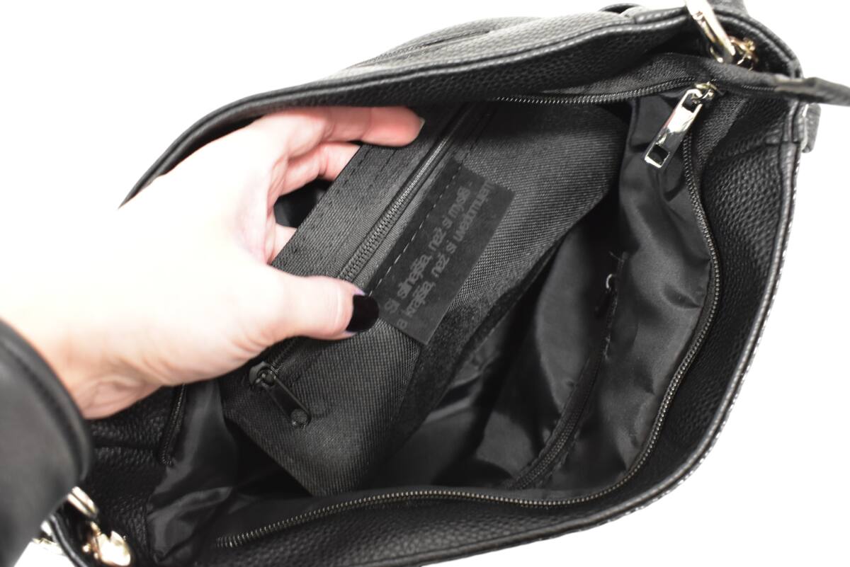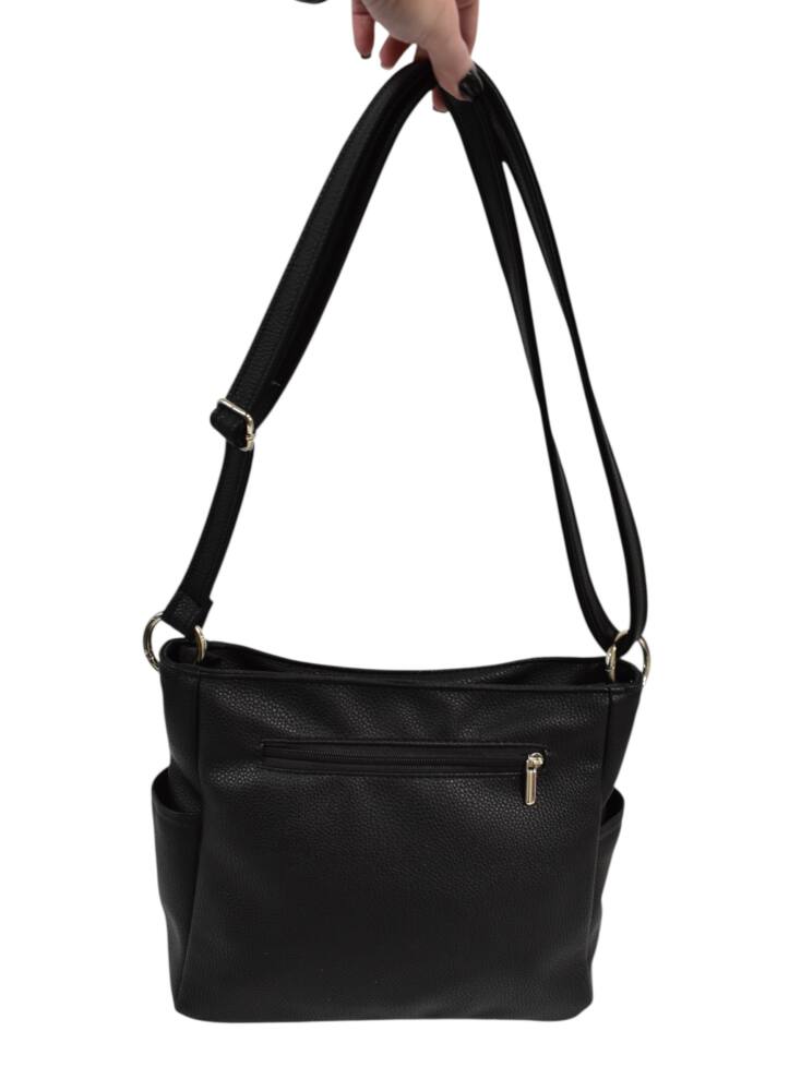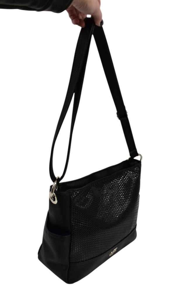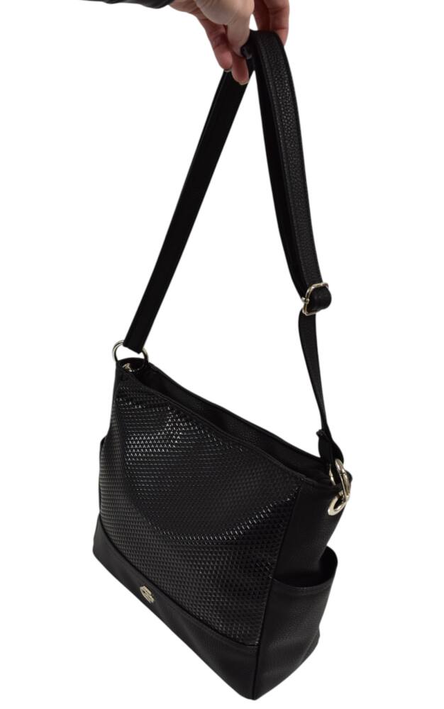 Športovo elegantná dámska kabelka v čiernej farbe so strieborným kovaním. Praktická kabelka v stednej veľkosti s nastaviteľným ramienkom na rameno alebo krížom cez plece. Vhodná na bežné, každodenné nosenie k rôznemu štýlu oblečenia. Vnútro podšité čiernou látkou s vreckami na drobnosti. Kvalitné spracovanie a moderný dizajn od značky GROSSO šitých na Slovensku.