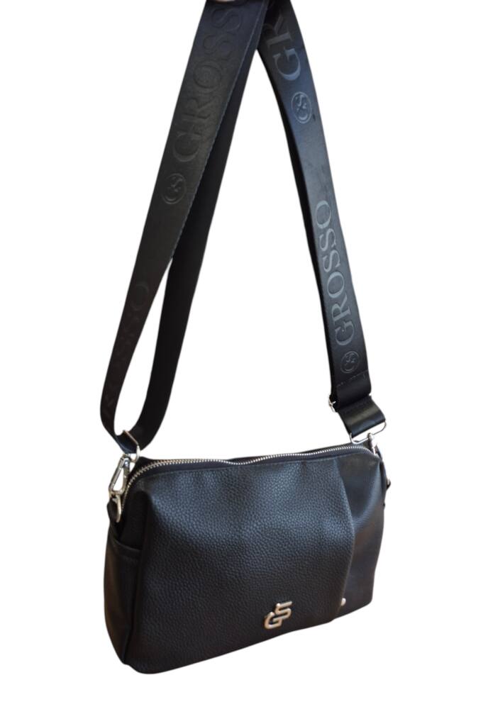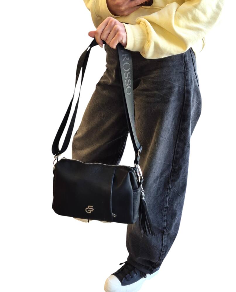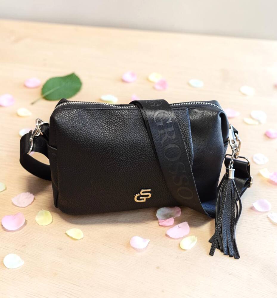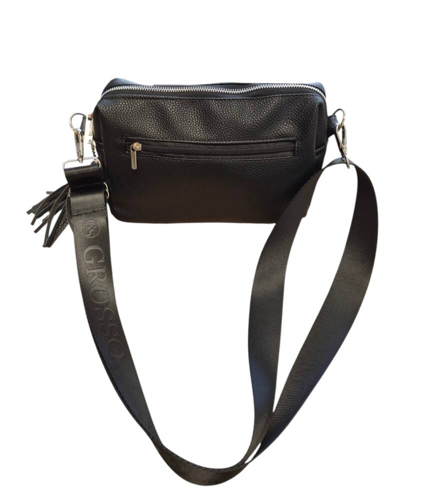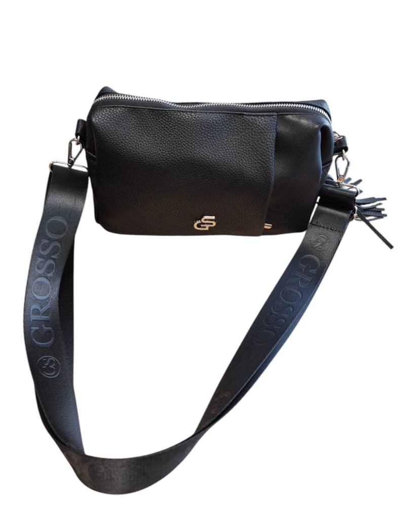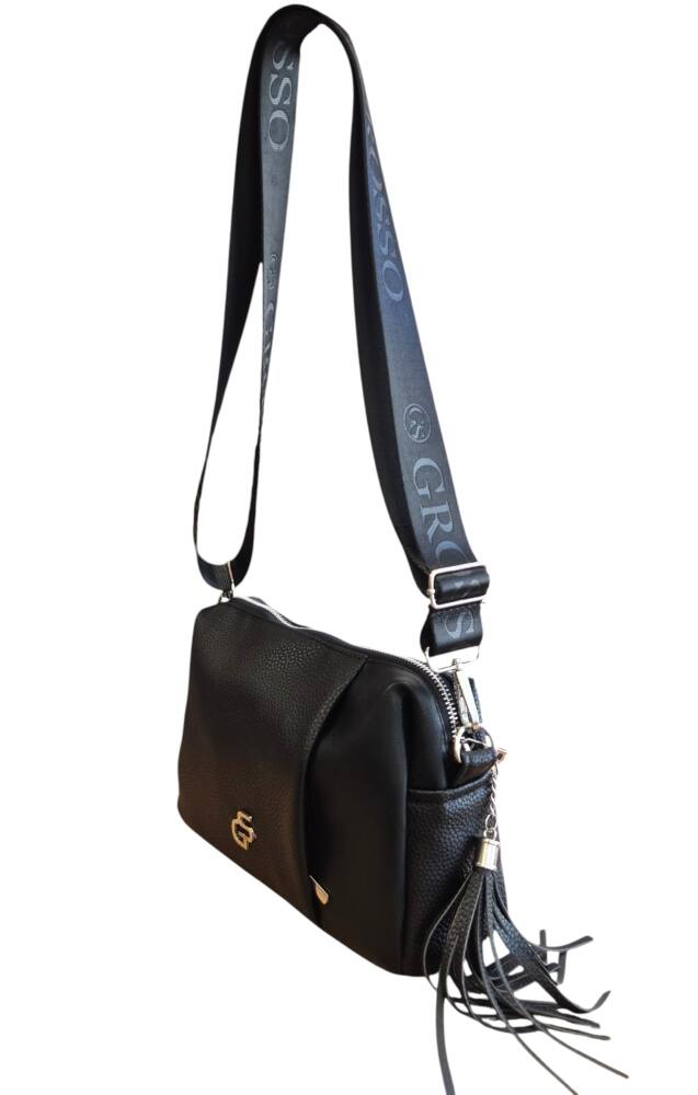 Športovo elegantná dámska menšia kabelka v čiernej farbe so strapcom. Kabelka s nastaviteľným ramienkom vhodná na nosenie na ramene ale aj krížom cez telo ako crossbody. Kabelka sa hodí k rôznemu štýlu oblečenia, či už sa chystáte niekam do spoločnosti, do práce alebo na výlet. Kvalitné spracovanie a moderný dizajn od značky GROSSO, šitých na Slovensku.