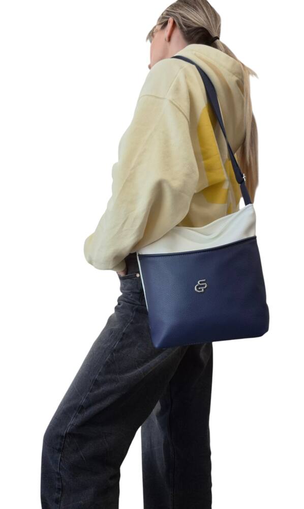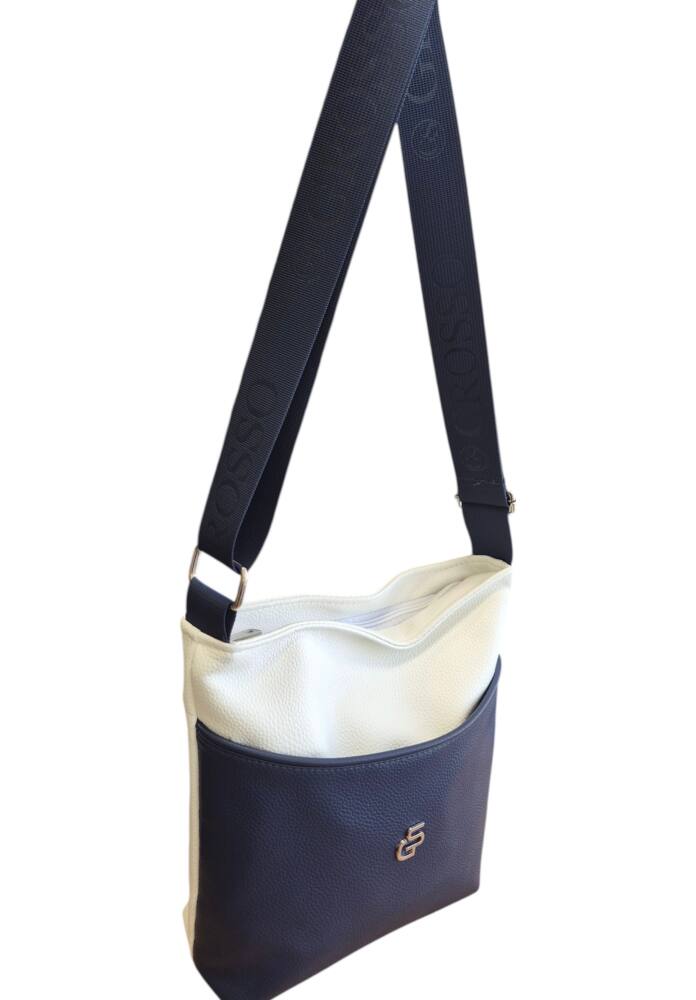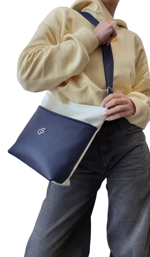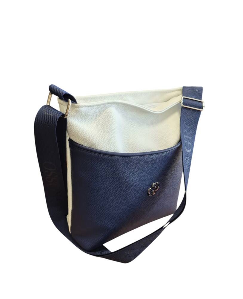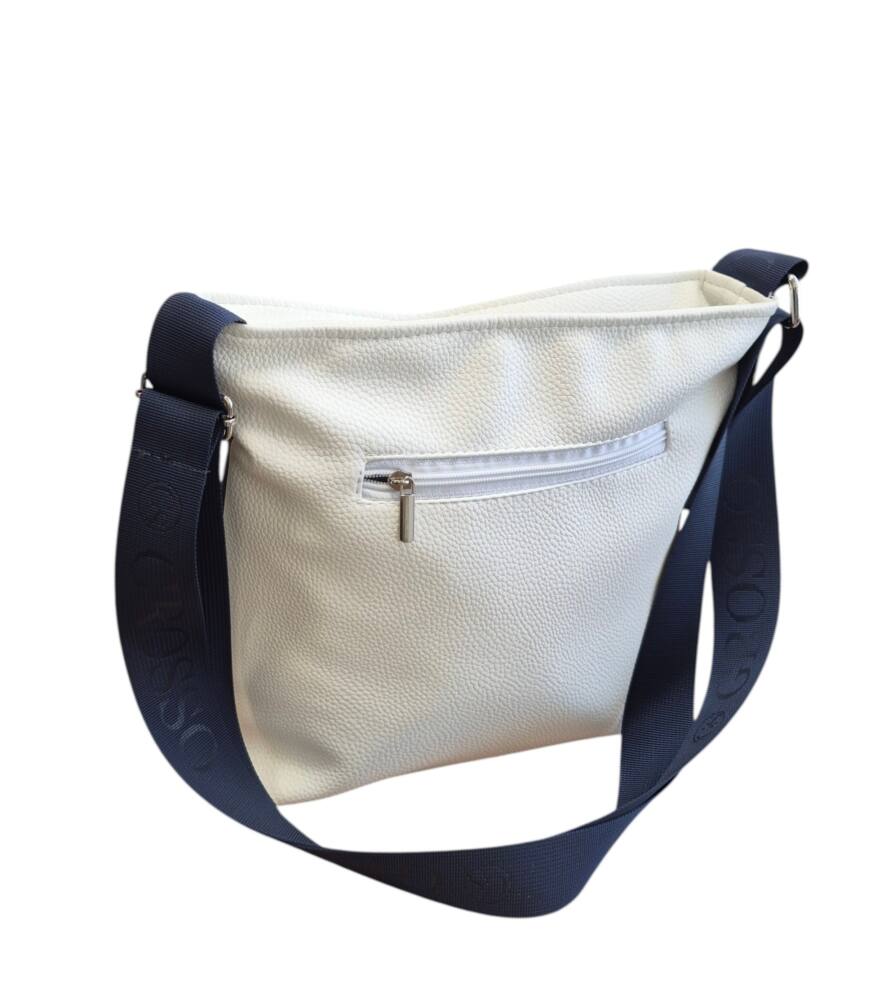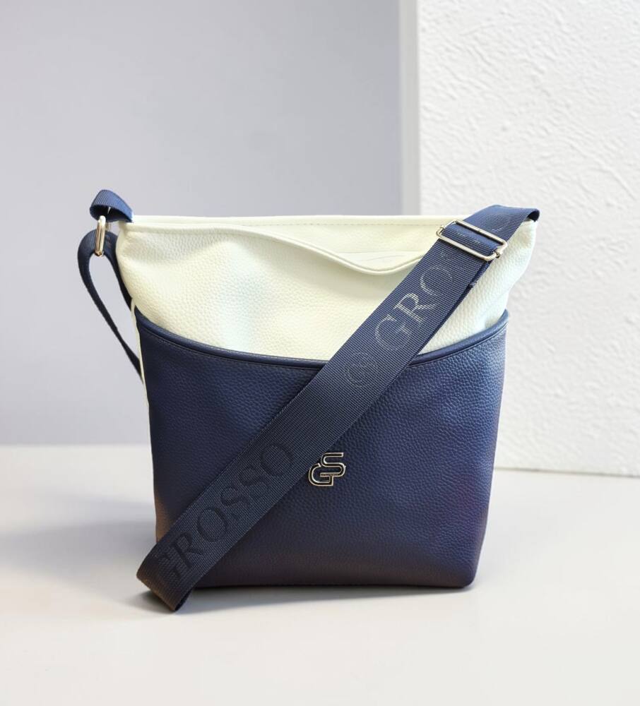 Dámska, praktická kabelka v modro bielej farbe s nastaviteľným ramienkom. Kabelka v menšej veľkosti, vhodná na každodenné nosenie, do práce, do mesta na kávu alebo na prechádzku či výlet. Elegantný dizajn a kvalitné spracovanie od značky GROSSO šitých na Slovensku.