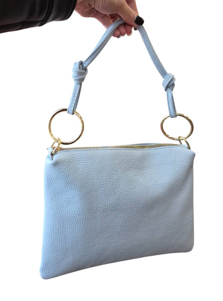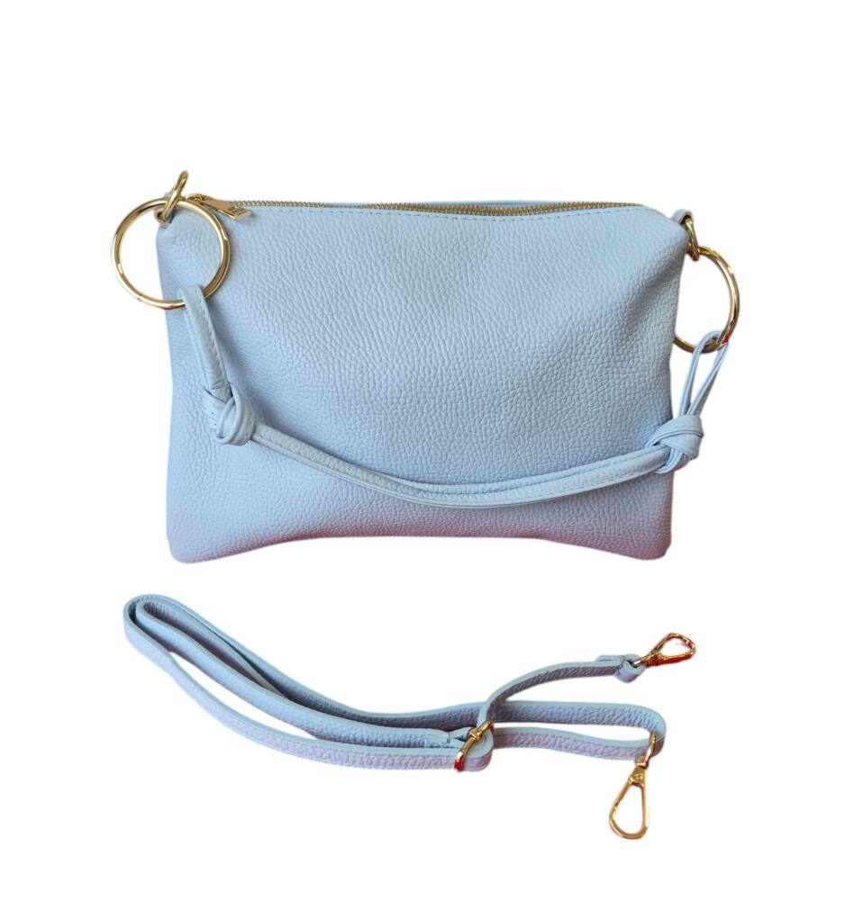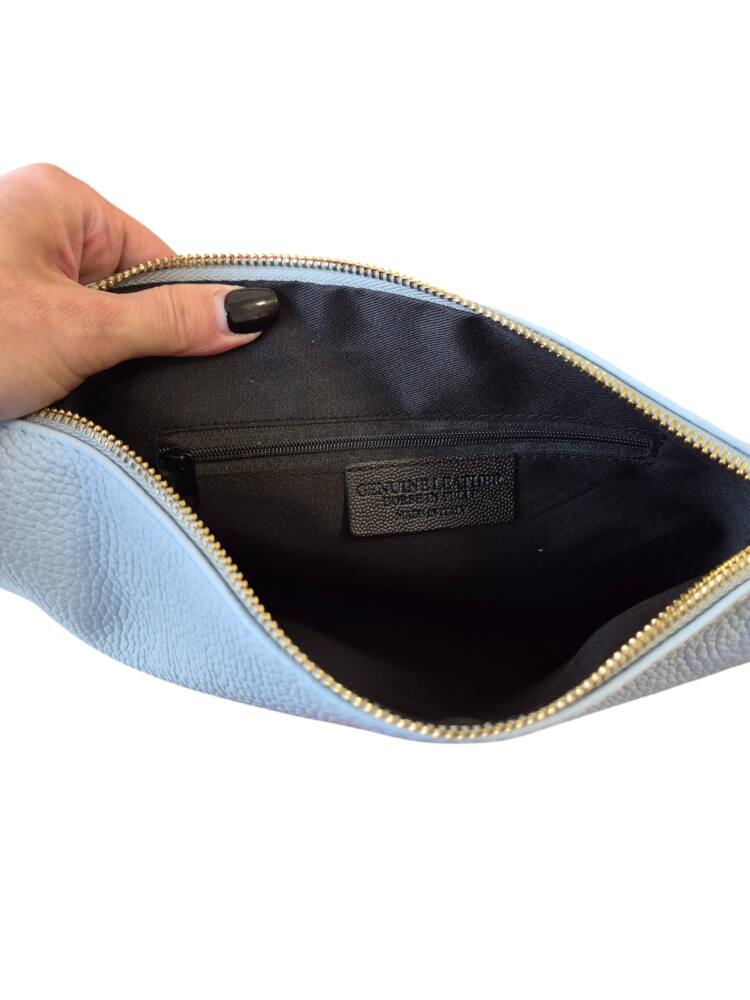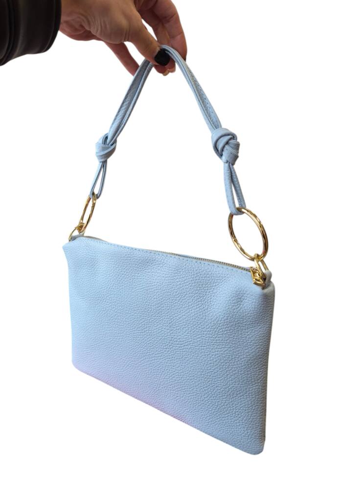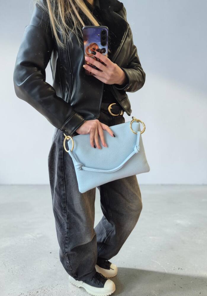 Športovo elegantná dámska väčšia listová kabelka v bledo modrej farbe (baby blue). Kabelku môžete nosiť ako listovú, ako crossbody – krížom cez plece s dlhým prídavným ramienkom, alebo len do ruky s kratším uškom. Kabelka vhodná na každý deň k rôznemu štýlu oblečenia ale aj do spoločnosti k šatom či lodičkám. Kvalitné spracovanie kože z Talianskej dielne.