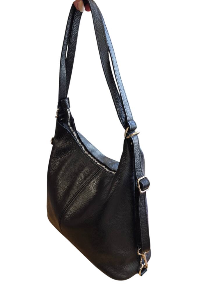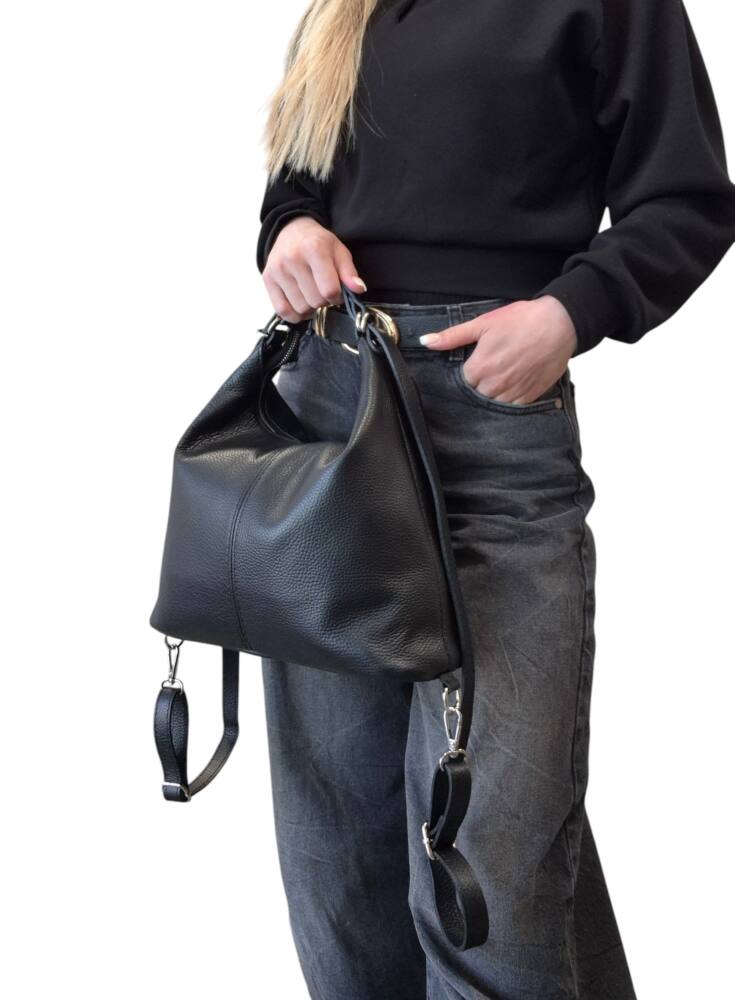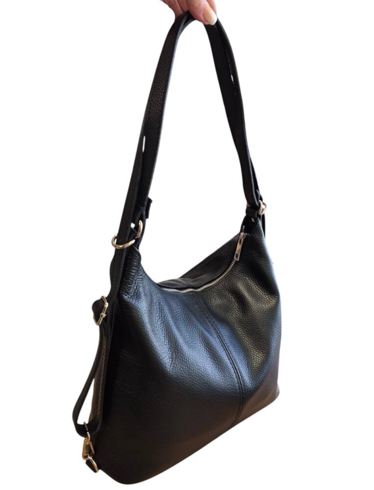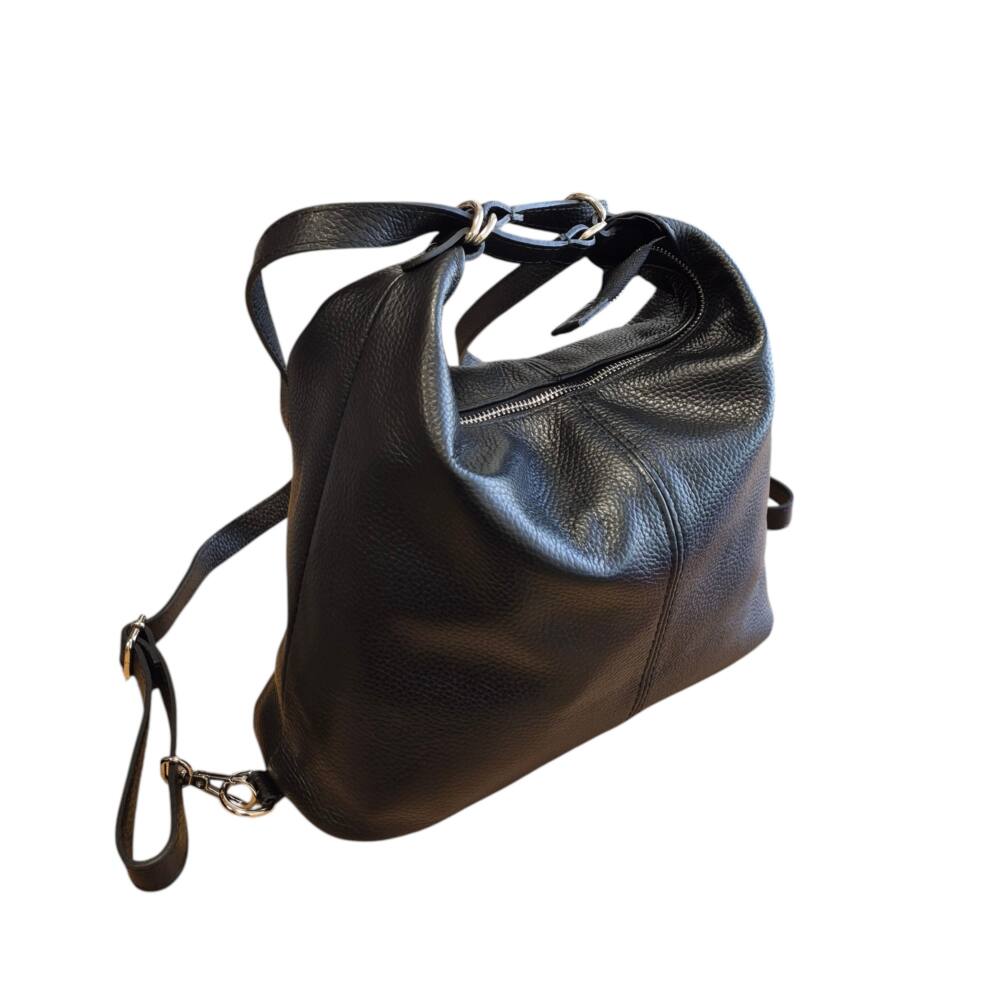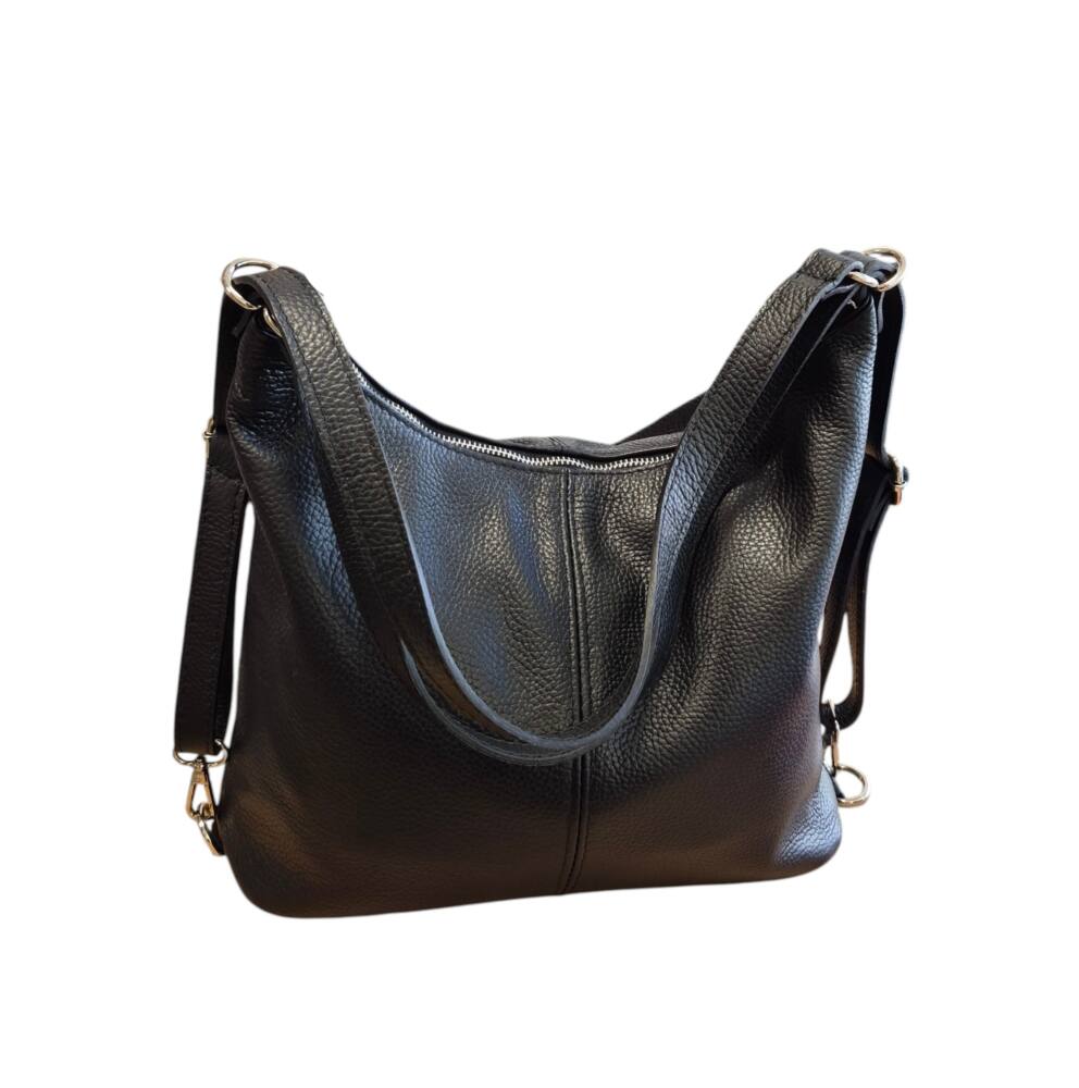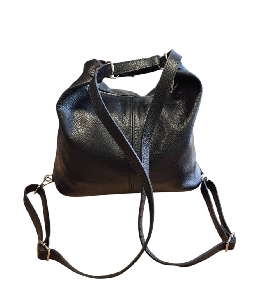 Praktická dámska kabelka do ruky na rameno a vak v jednom. Kabelka v čiernej farbe v strednej veľkosti. Športovo elegantný batoh ktorý môžete nosiť ako kabelku alebo ako ruksak, stačí prestaviť ramienka. Vnútro obsahuje vrecká na drobnosti so zipsom a bez zipsu. Vhodná na rôzne výlety, dovolenky ale aj na každý deň do práce. Moderný dizajn a kvalitné spracovanie. Kvalitné spracovanie kože ktoré vám vydrží roky a moderný dizajn z Talianskej dielne.
