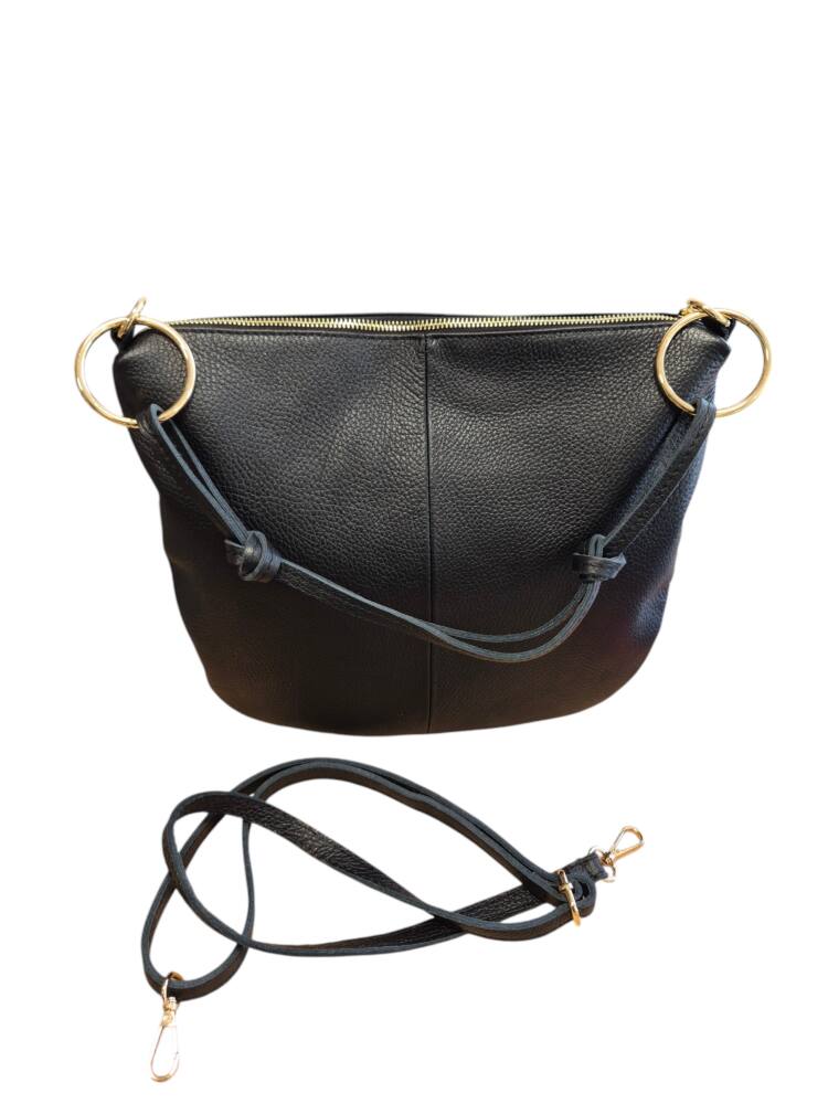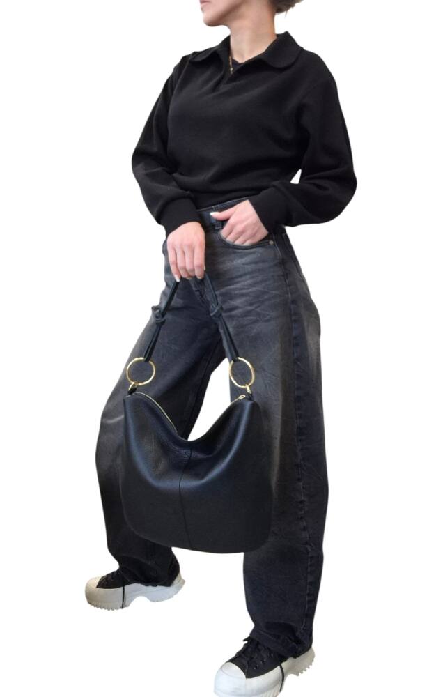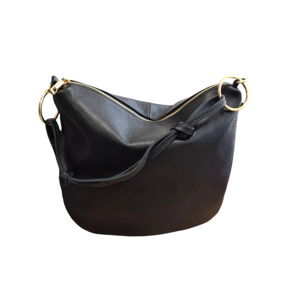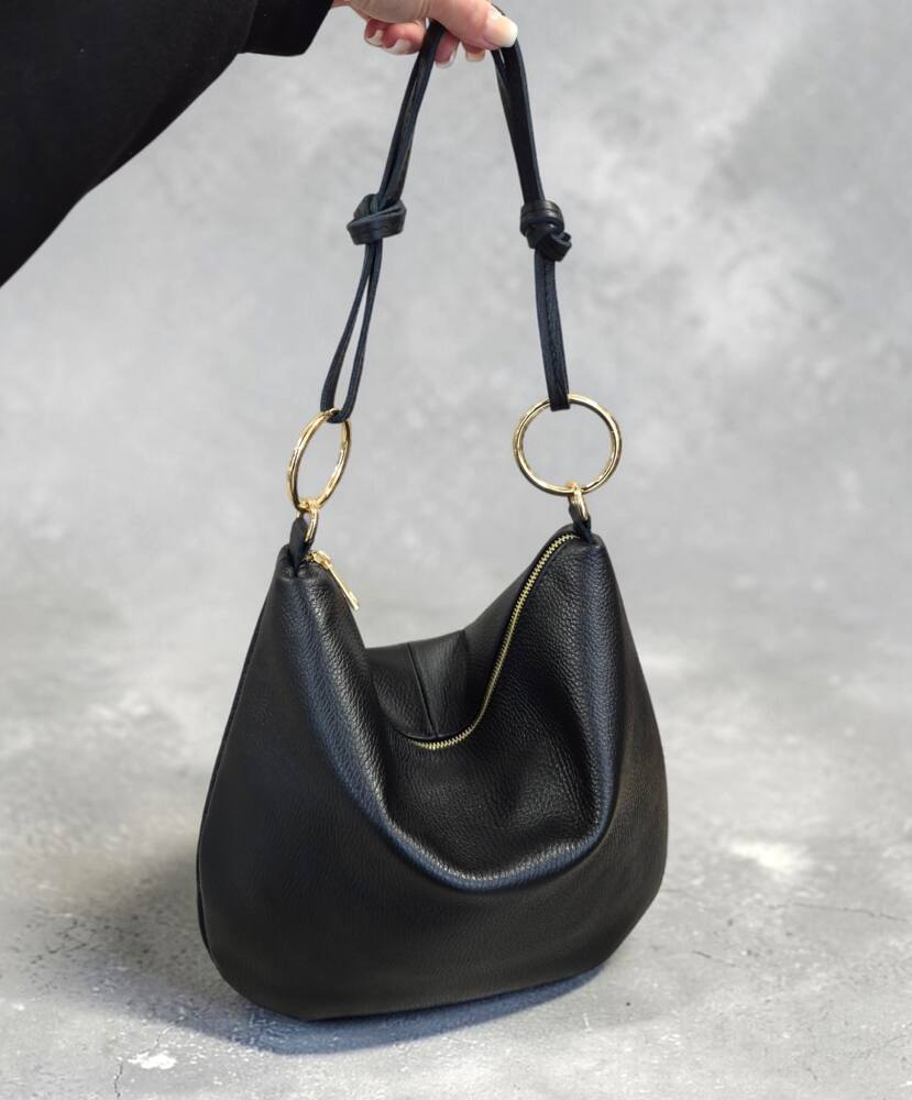 Praktická kožená väčšia kabelka v oválnom tvare s veľkými kovovými kruhmi. Športovo elegantná kabelka v čiernej farbe so zlatým kovaním. Vhodná na každý deň do práce ale aj do spoločnosti. Ku kabelke je aj prídavné ramienko na pohodlné nosenie krížom cez telo. Či už zvolíte tenisky alebo sandále a šaty bude váš look dokonalý. Kvalitné spracovanie kože z Talianskej dielne.