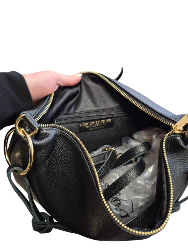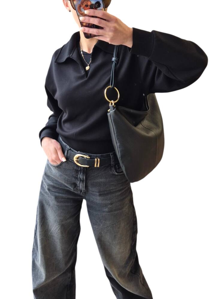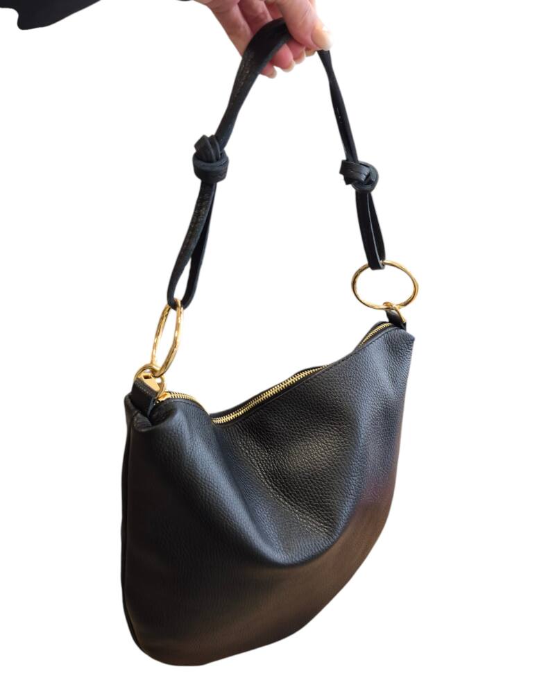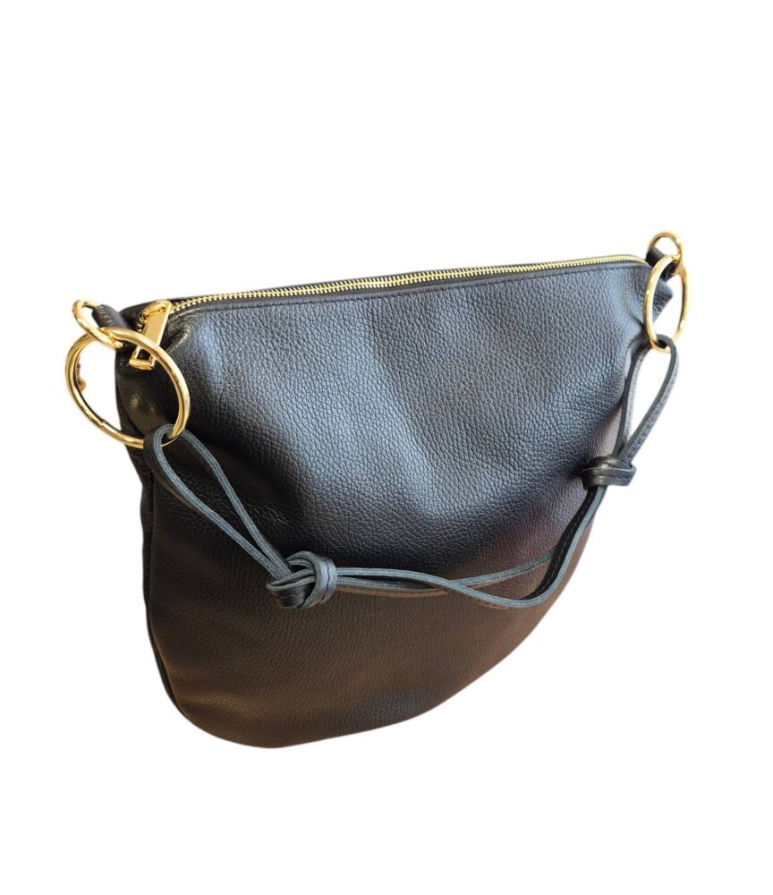 Praktická kožená väčšia kabelka v oválnom tvare s veľkými kovovými kruhmi. Športovo elegantná kabelka v čiernej farbe so zlatým kovaním. Vhodná na každý deň do práce ale aj do spoločnosti. Ku kabelke je aj prídavné ramienko na pohodlné nosenie krížom cez telo. Či už zvolíte tenisky alebo sandále a šaty bude váš look dokonalý. Kvalitné spracovanie kože z Talianskej dielne.