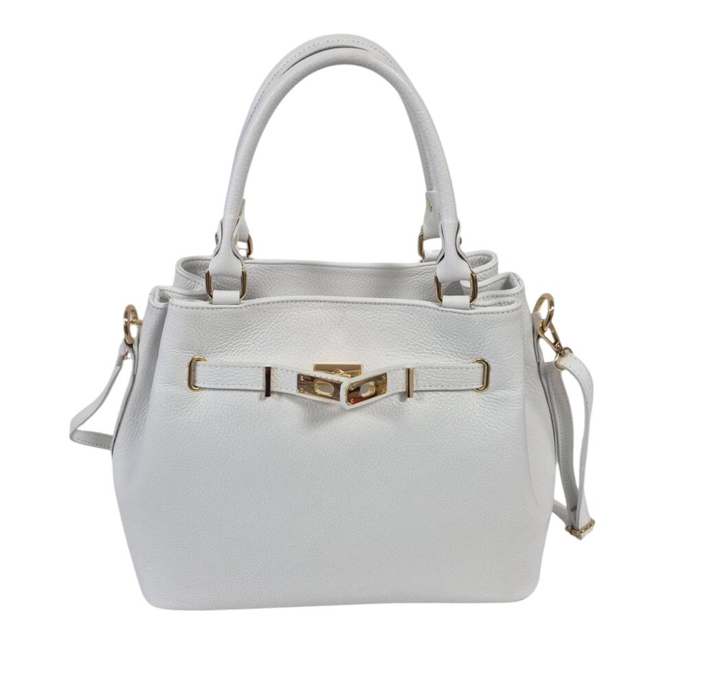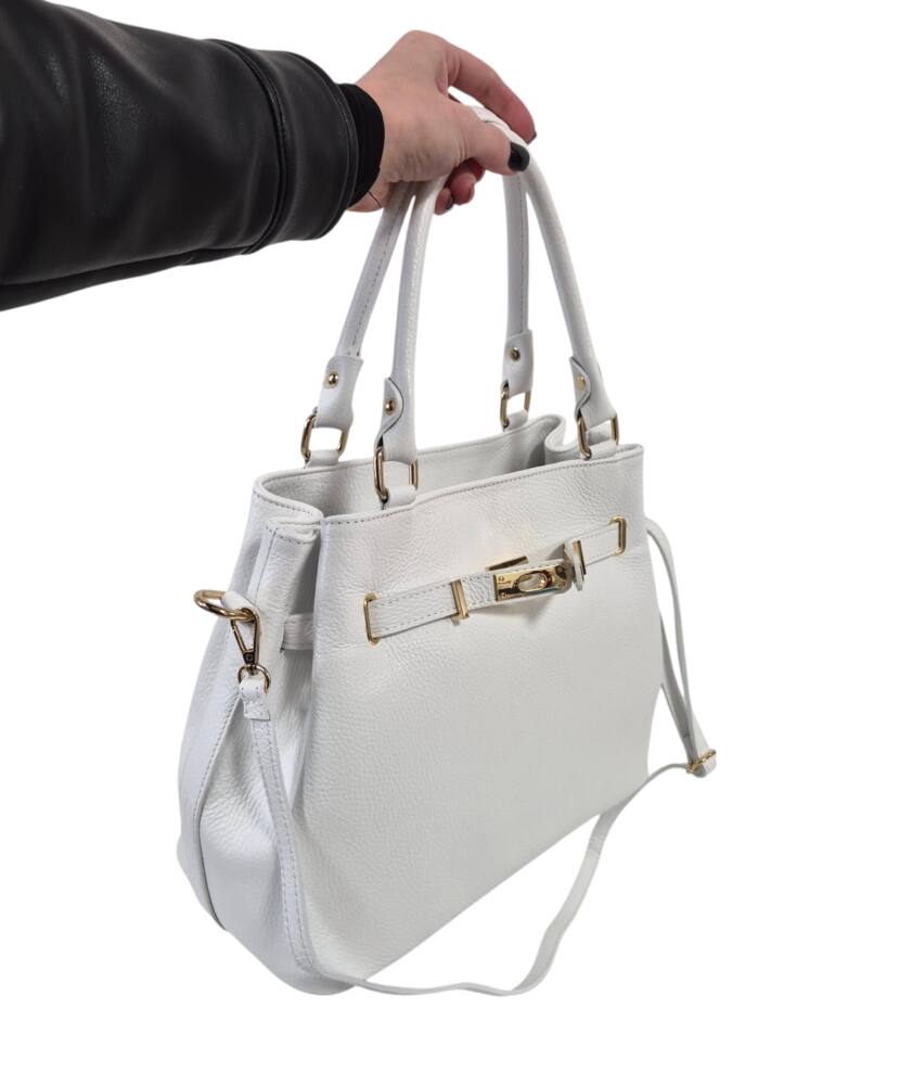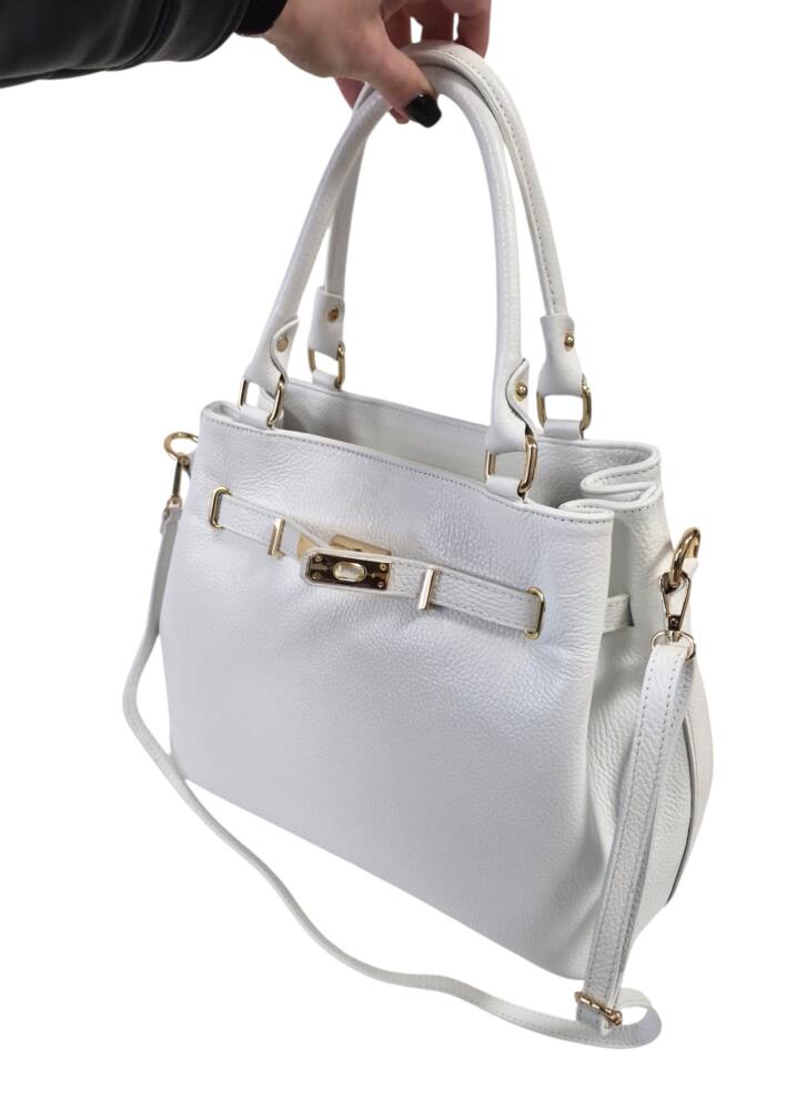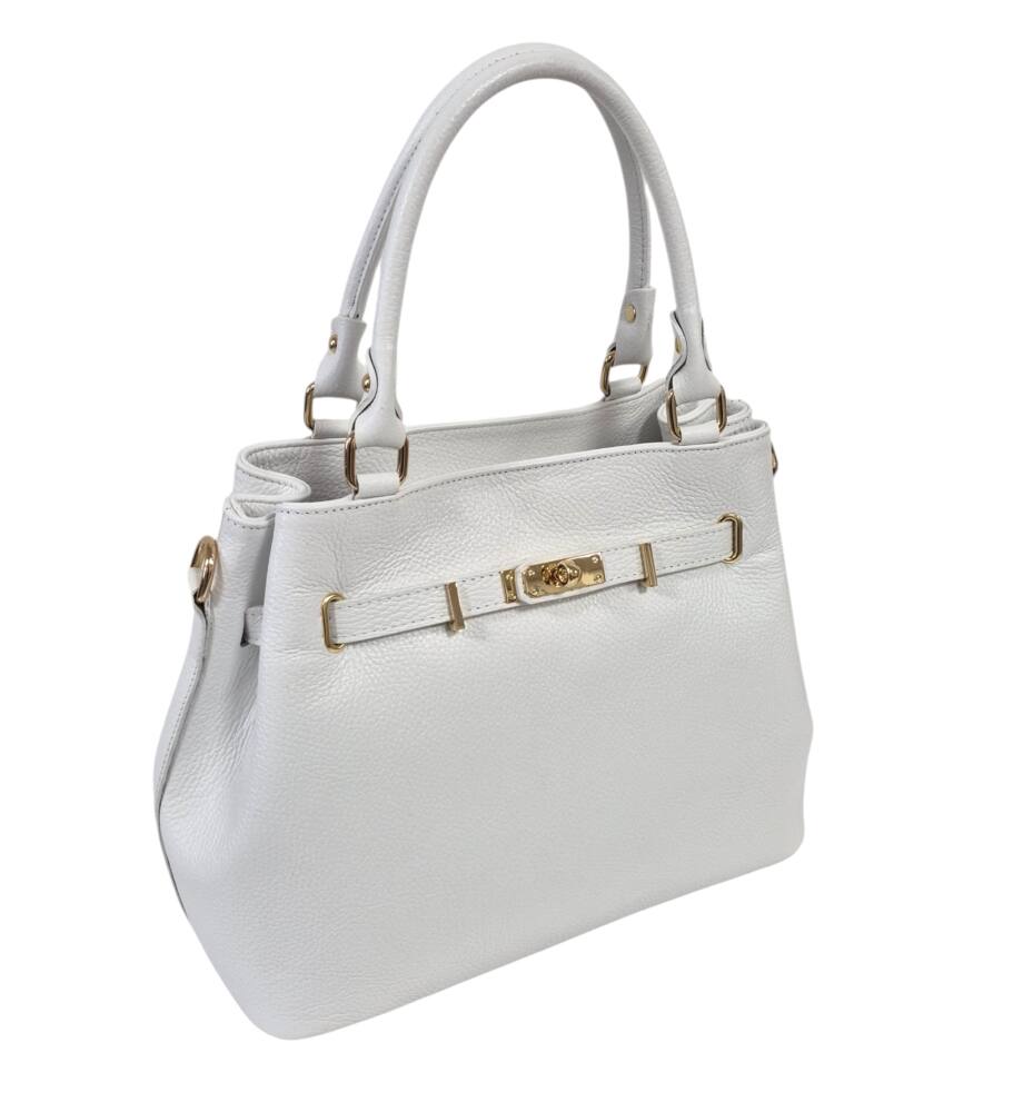 Veľká dámska elegantná pracovná kabelka vo formáte A4 s rozšíriteľným ramienkom (opaskom) so zlatým kovaním. Biela farba ktorá sa hodí ku každému outfitu. Množstvo úložného priestoru s vreckami na drobnosti. Perfektná kabelka do práce na rôzne spisy či tablet. Moderný dizajn a kvalitné spracovanie z Talianskej dielne.