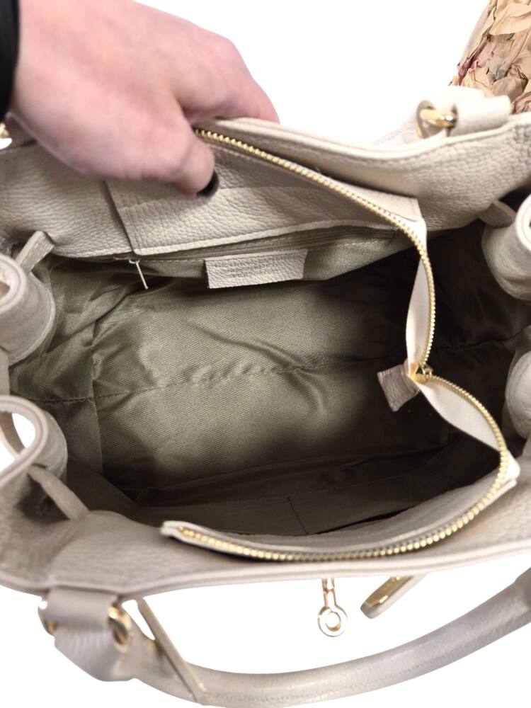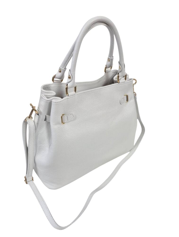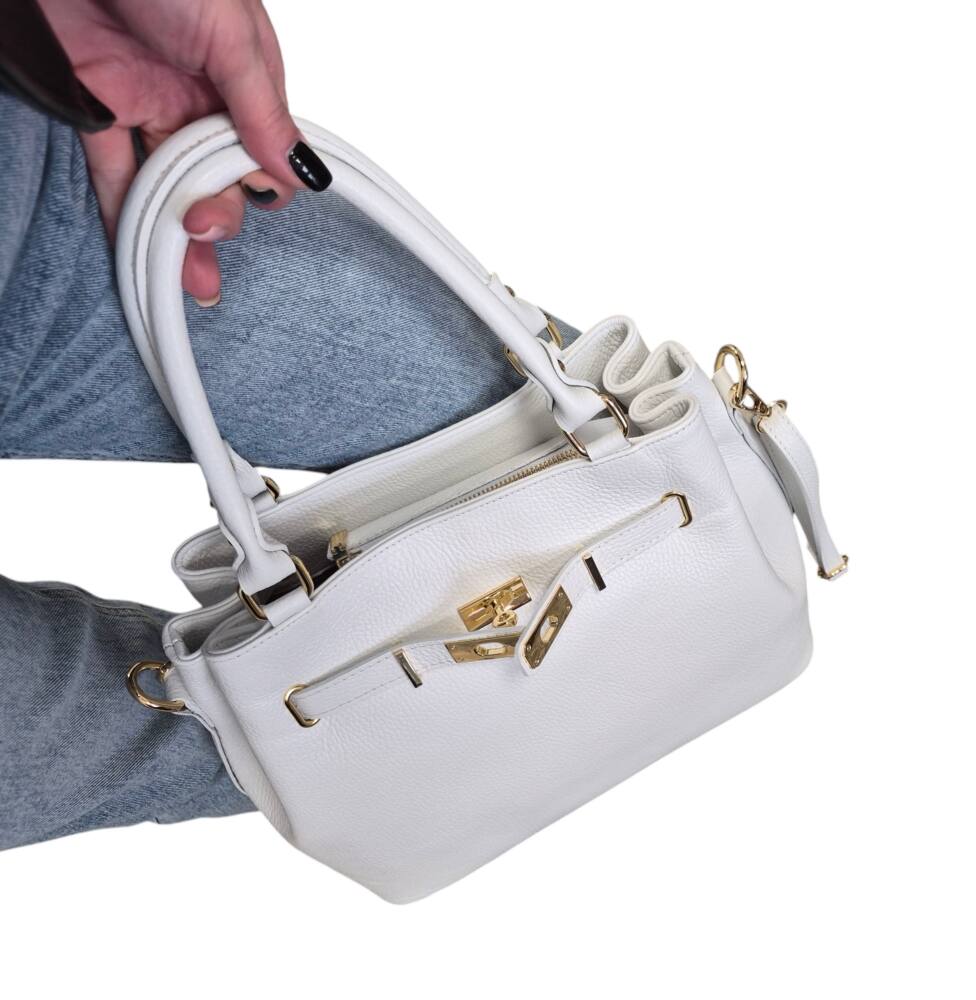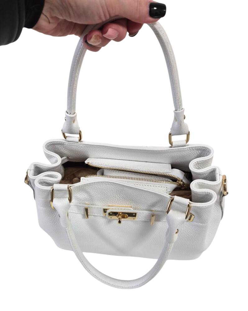 Veľká dámska elegantná pracovná kabelka vo formáte A4 s rozšíriteľným ramienkom (opaskom) so zlatým kovaním. Biela farba ktorá sa hodí ku každému outfitu. Množstvo úložného priestoru s vreckami na drobnosti. Perfektná kabelka do práce na rôzne spisy či tablet. Moderný dizajn a kvalitné spracovanie z Talianskej dielne.