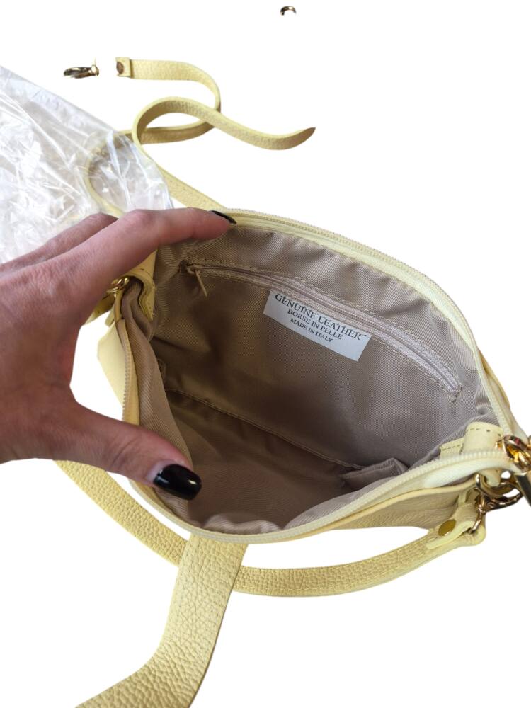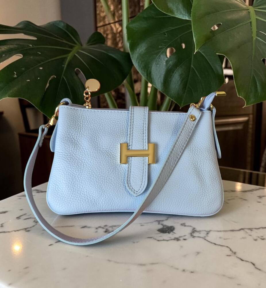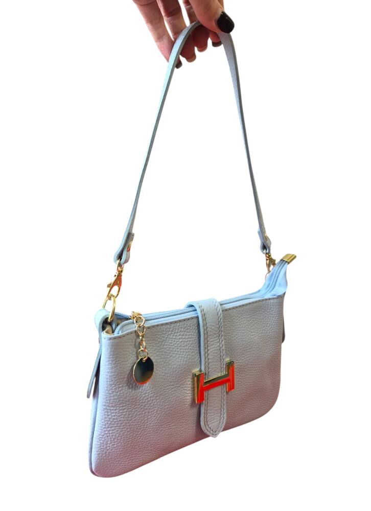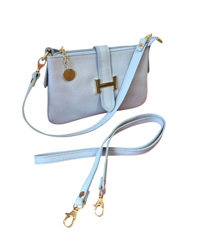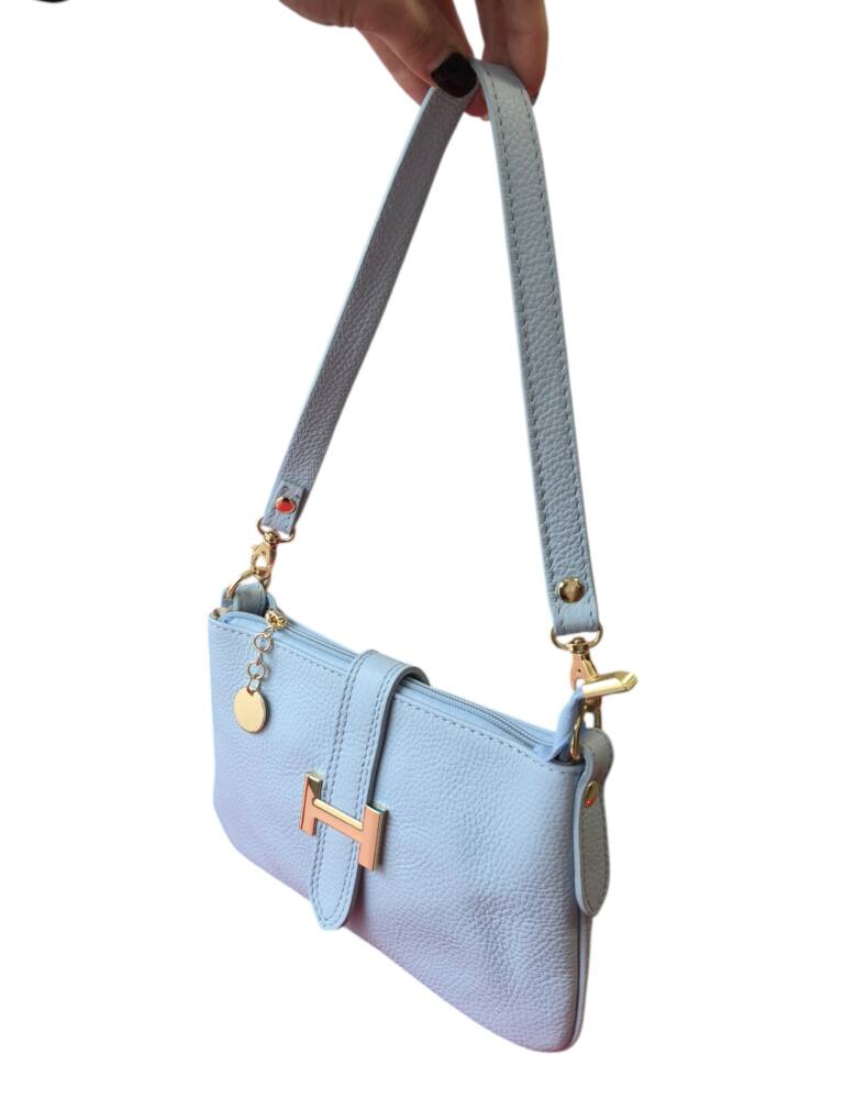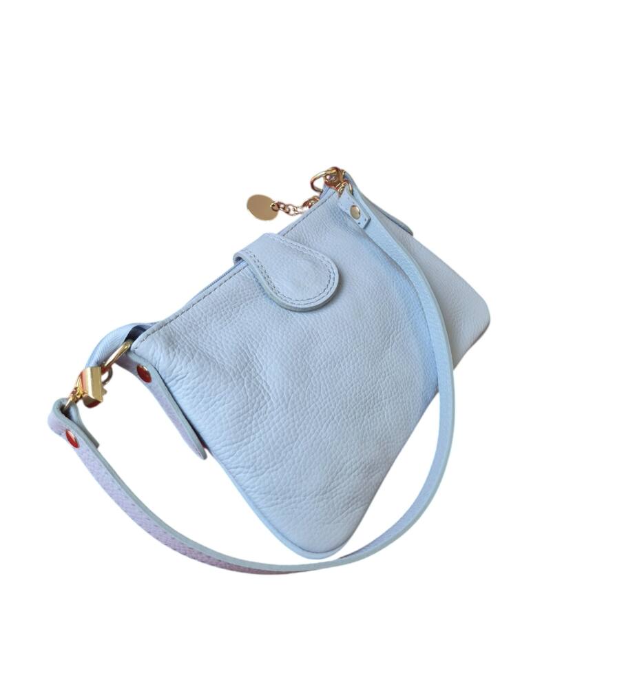 Športovo elegantná malá dámska listová kabelka v bledo modrej (baby blue) farbe do ruky/na rameno. Kabelku môžete nosiť na 3 spôsoby, ako listovú bez ramienka, do ruky s kratším uškom, ako crossbody kabelku krížom cez plece. Vhodná na každý deň k teniskám ale aj do spoločnosti k elegantnému oblečeniu či už si dáte sandále alebo lodičky. Kvalitné spracovanie kože a moderný dizajn s krásnou kovovou ozdobou. Vyrobené v Taliansku.