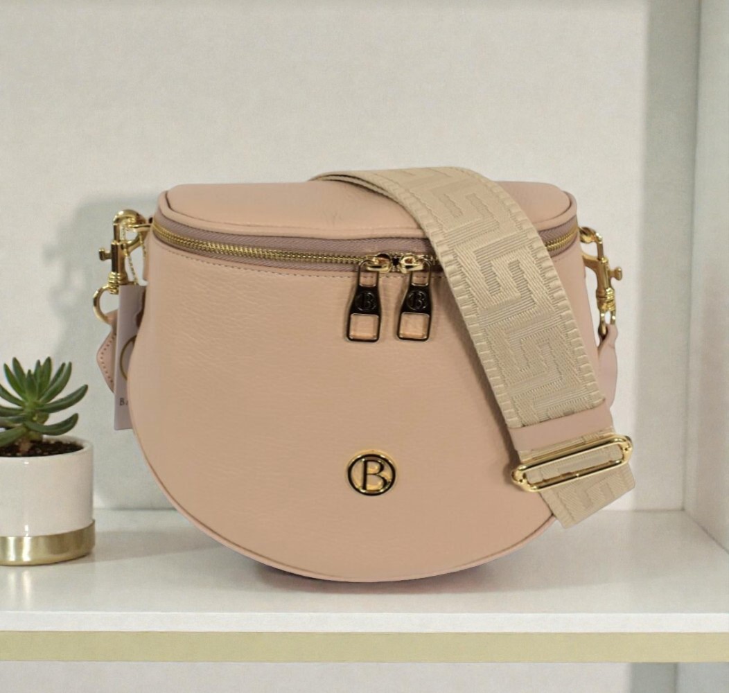 Štýlová, športovo elegantná dámska crossbody kabelka v štýle ľadvinky v krásnej jemnej ružovej farbe so zlatým kovaním. Vhodná na každodenné nosenie k rôznemu štýlu oblečenia. Má veľa úložného priestoru s bočným vreckom na zips. Veľmi kvalitné spracovanie kože a moderný dizajn. Slovenský výrobok.