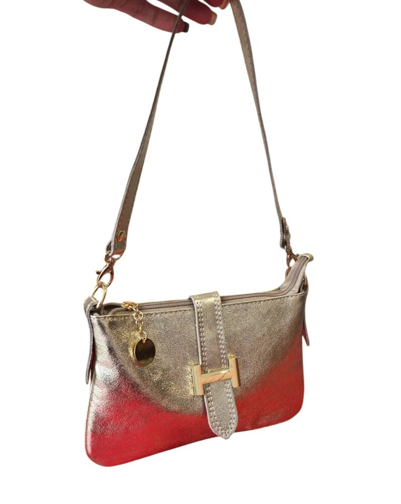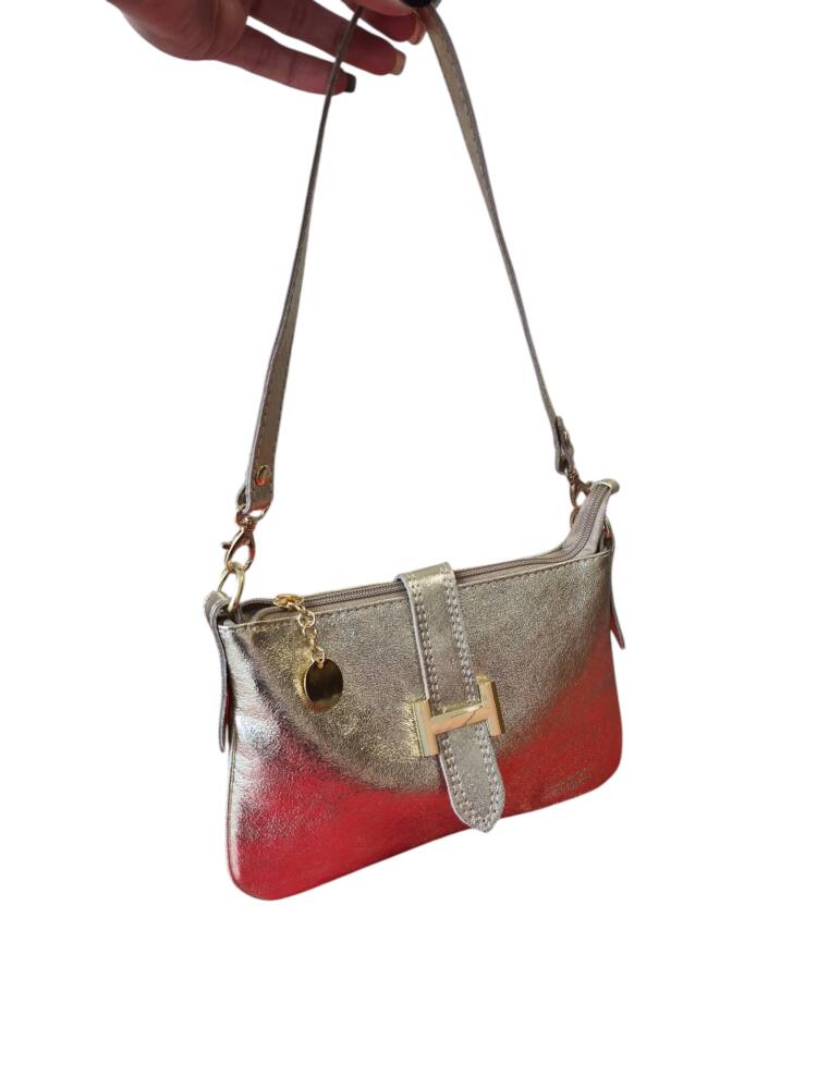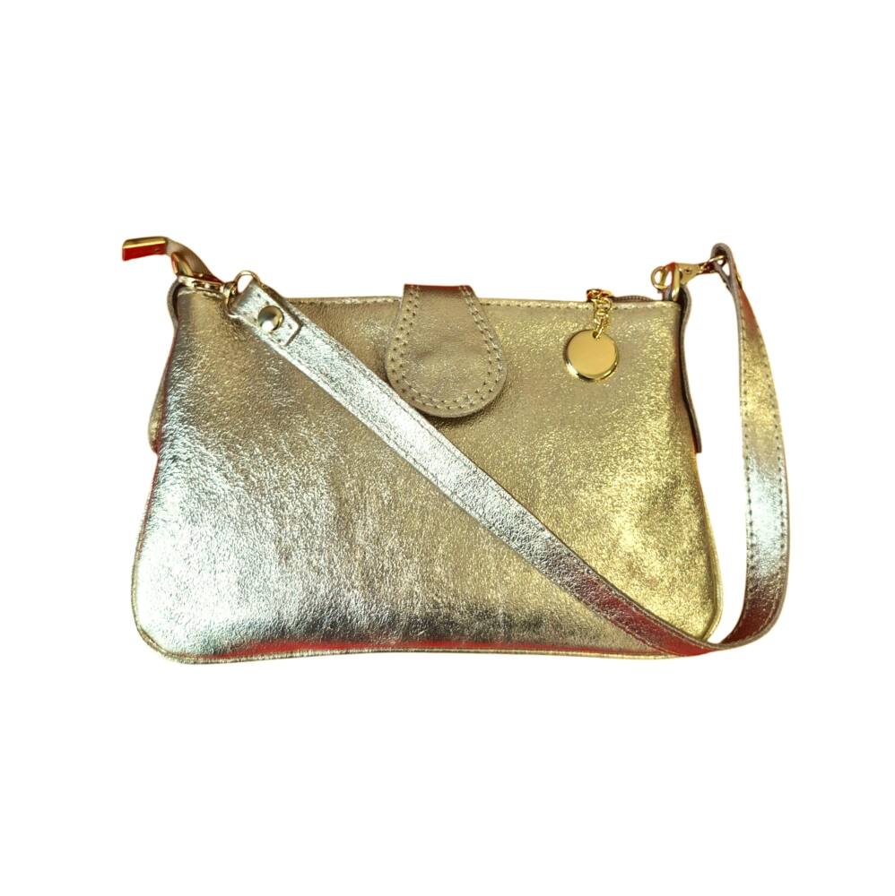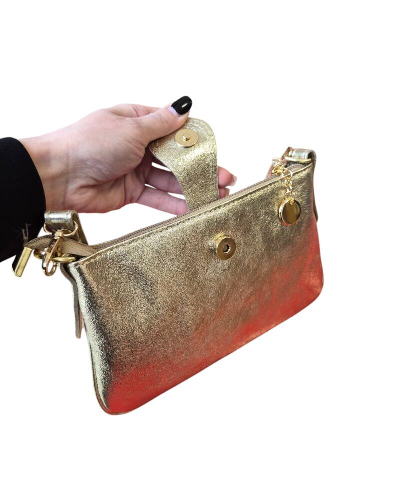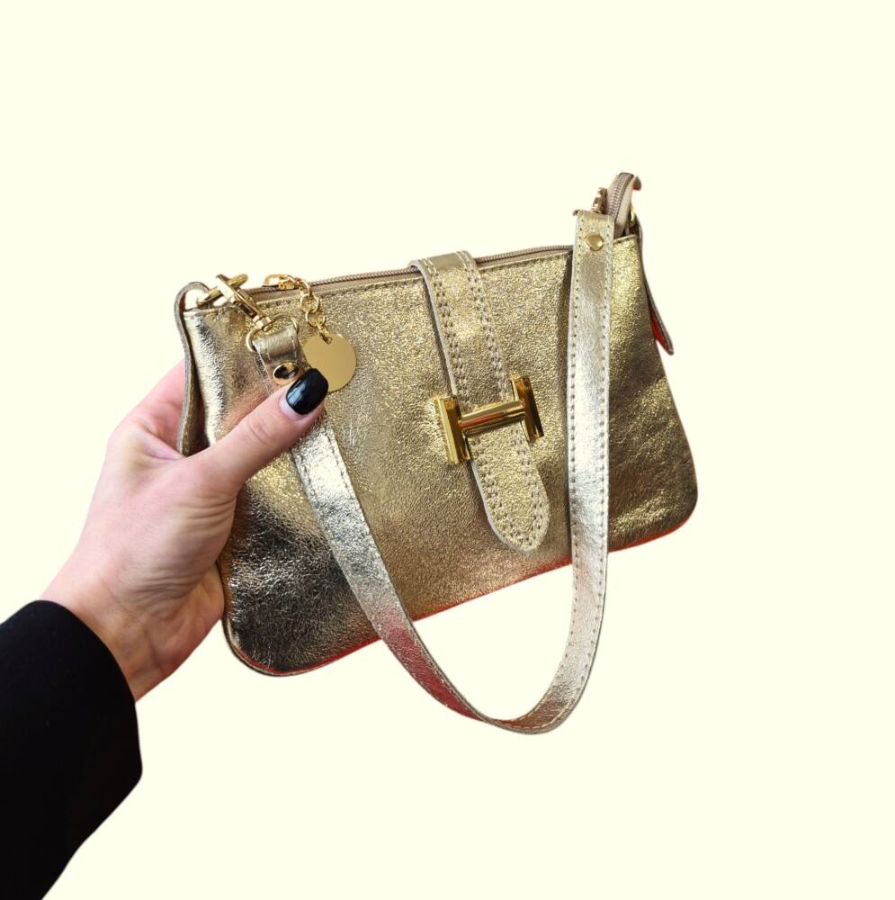 Športovo elegantná malá dámska kabelka v extravagantnej zlatej farbe do ruky/na rameno. Kabelku môžete nosiť na 3 spôsoby, ako listovú bez ramienka, do ruky s kratším uškom, ako crossbody kabelku krížom cez plece. Vhodná na každý deň k teniskám ale aj do spoločnosti k elegantnému oblečeniu či už si dáte sandále alebo lodičky. Kvalitné spracovanie kože a moderný dizajn s krásnou kovovou ozdobou. Vyrobené v Taliansku.