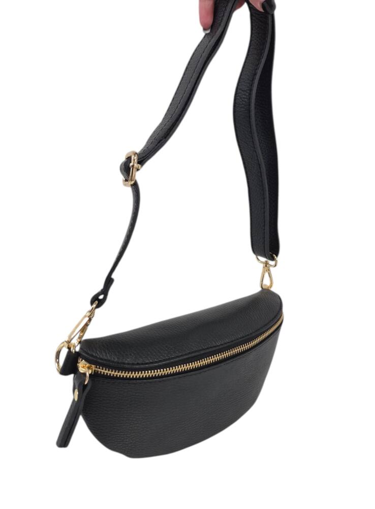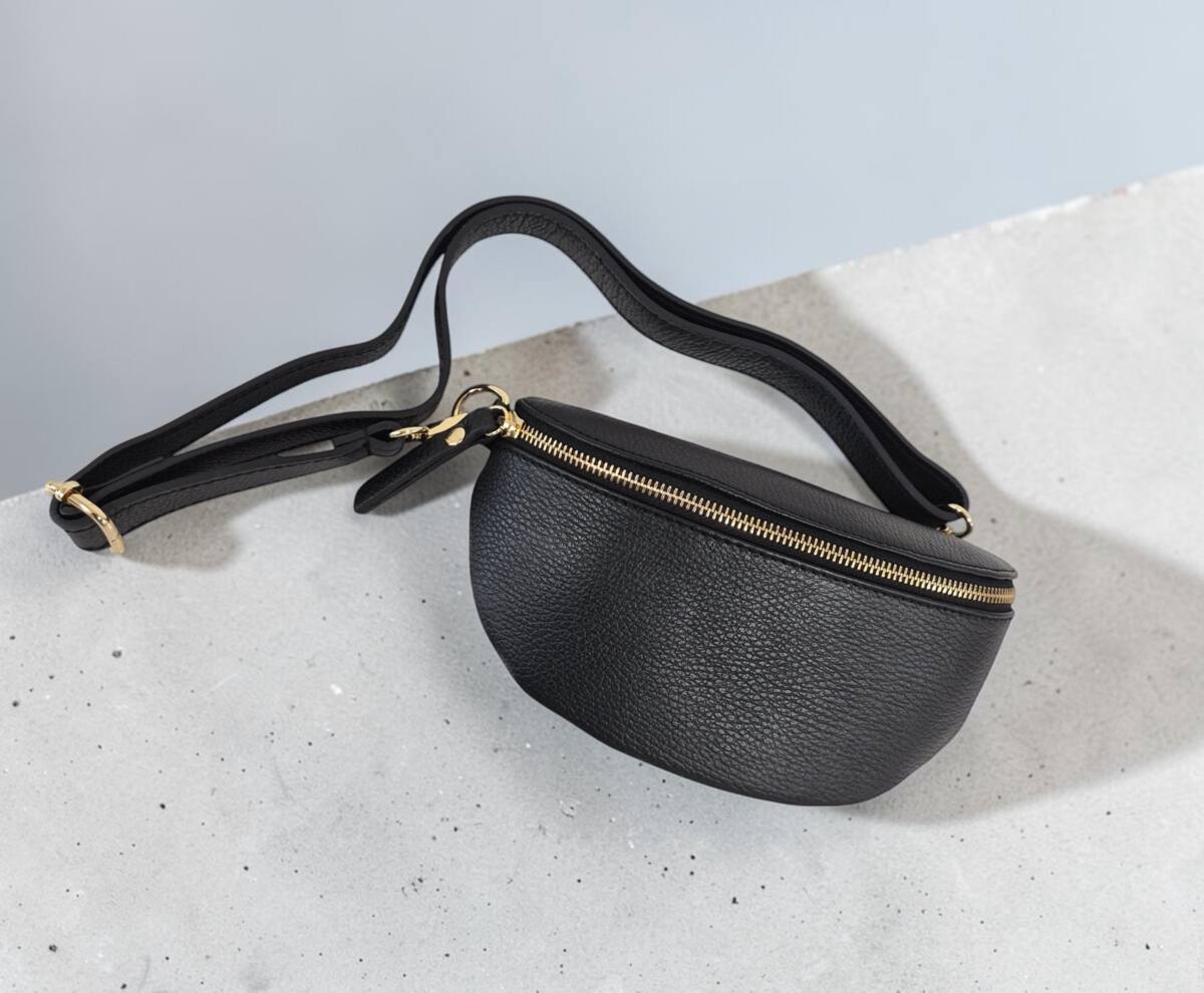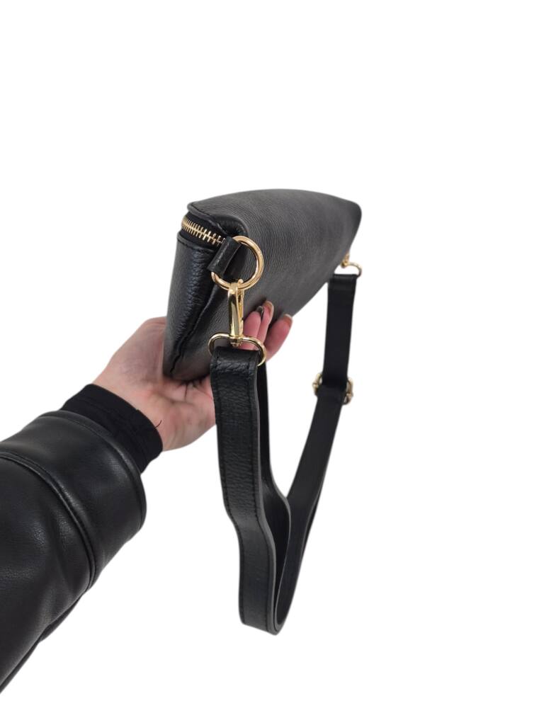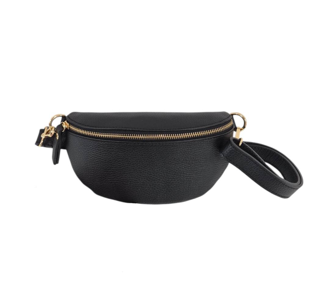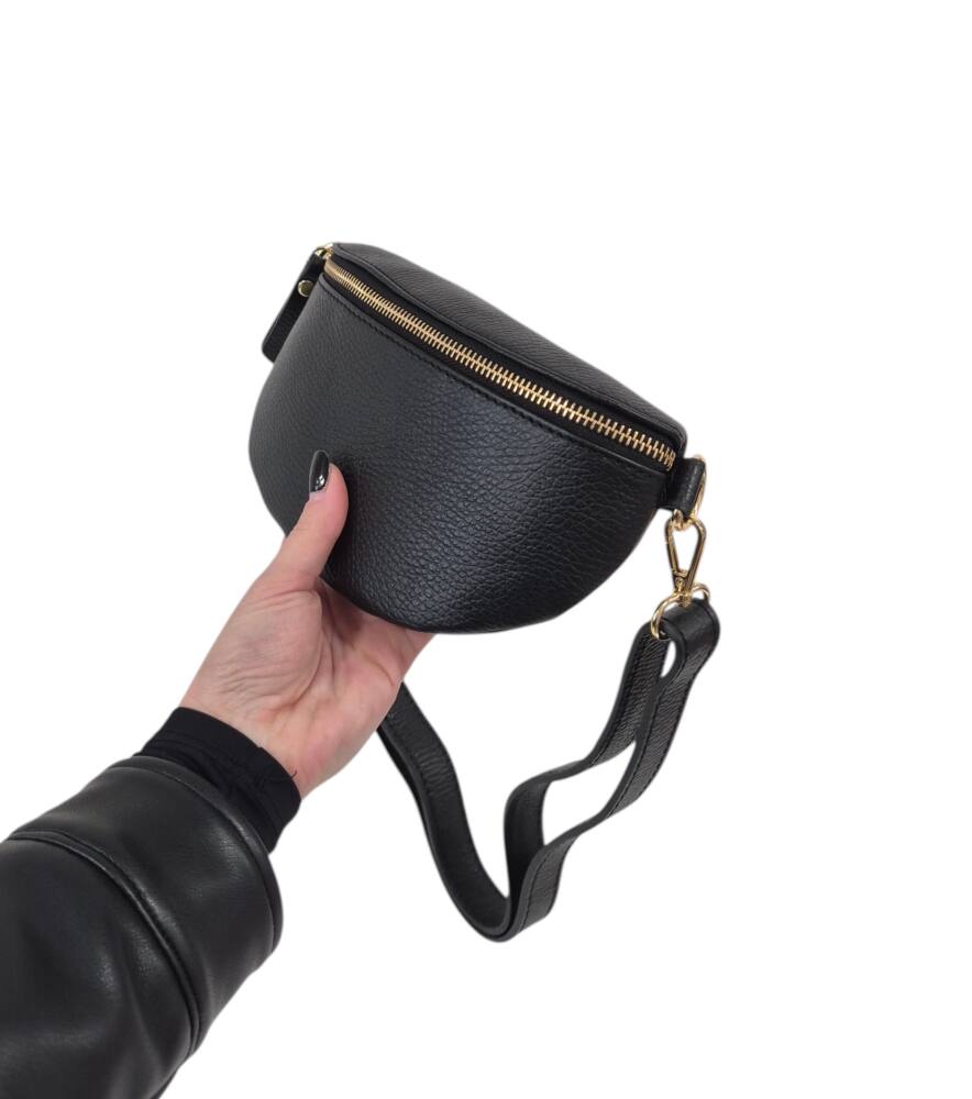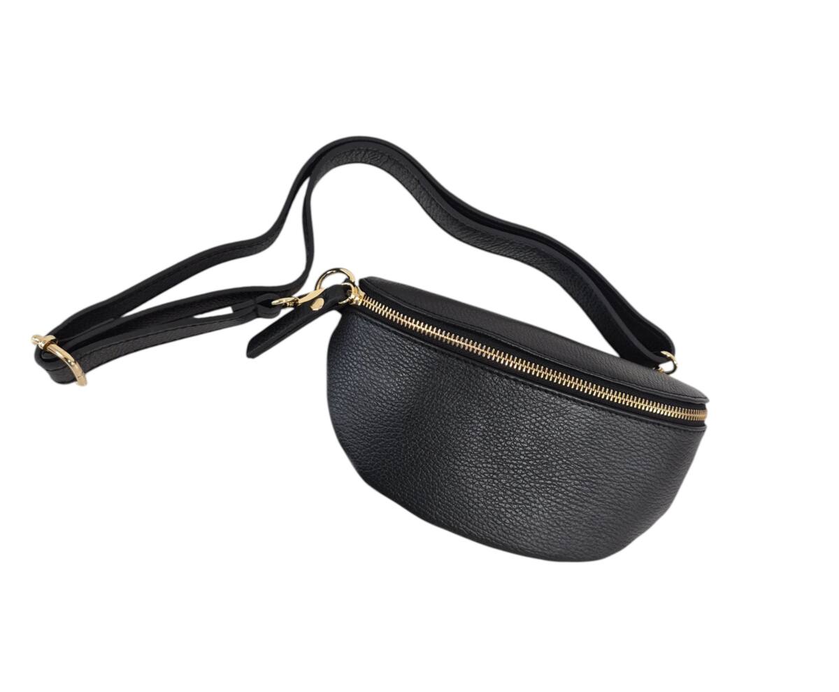 Športovo elegantná čierna ľadvinka v menšej veľkosti so zlatým kovaním. Praktický módny doplnok na rôzne výlety, akcie, dovolenky ale aj na bežný deň do práce. Uzatvára sa na zips a vo vnútri ma malé vrecko na drobnosti tiež na zips. Moderný dizajn perfektný k rôznemu štýlu oblečenia a kvalitné spracovanie kože z Talianskej dielne.