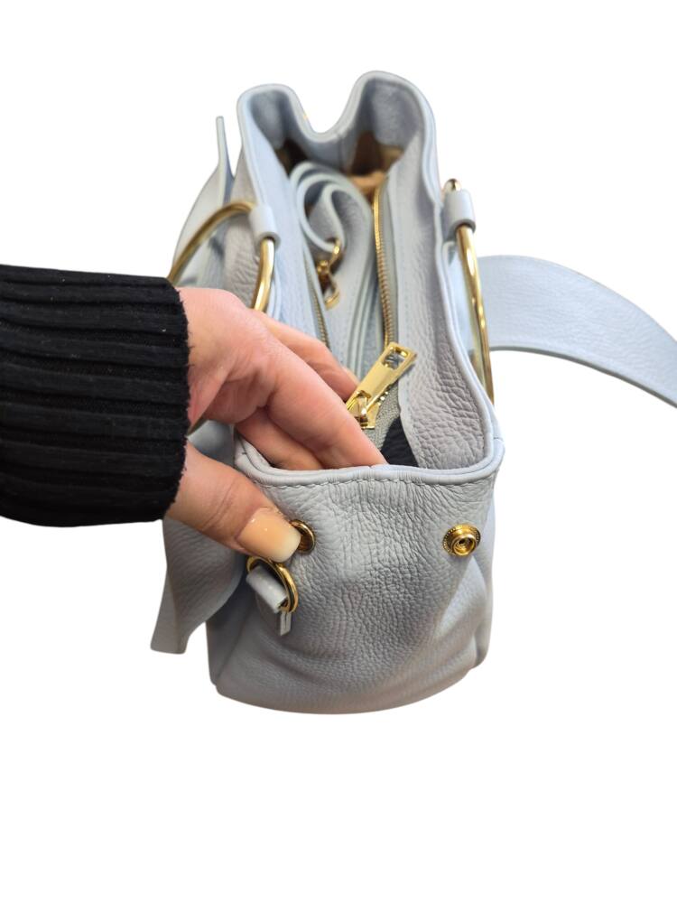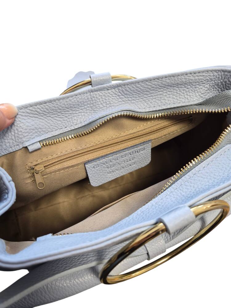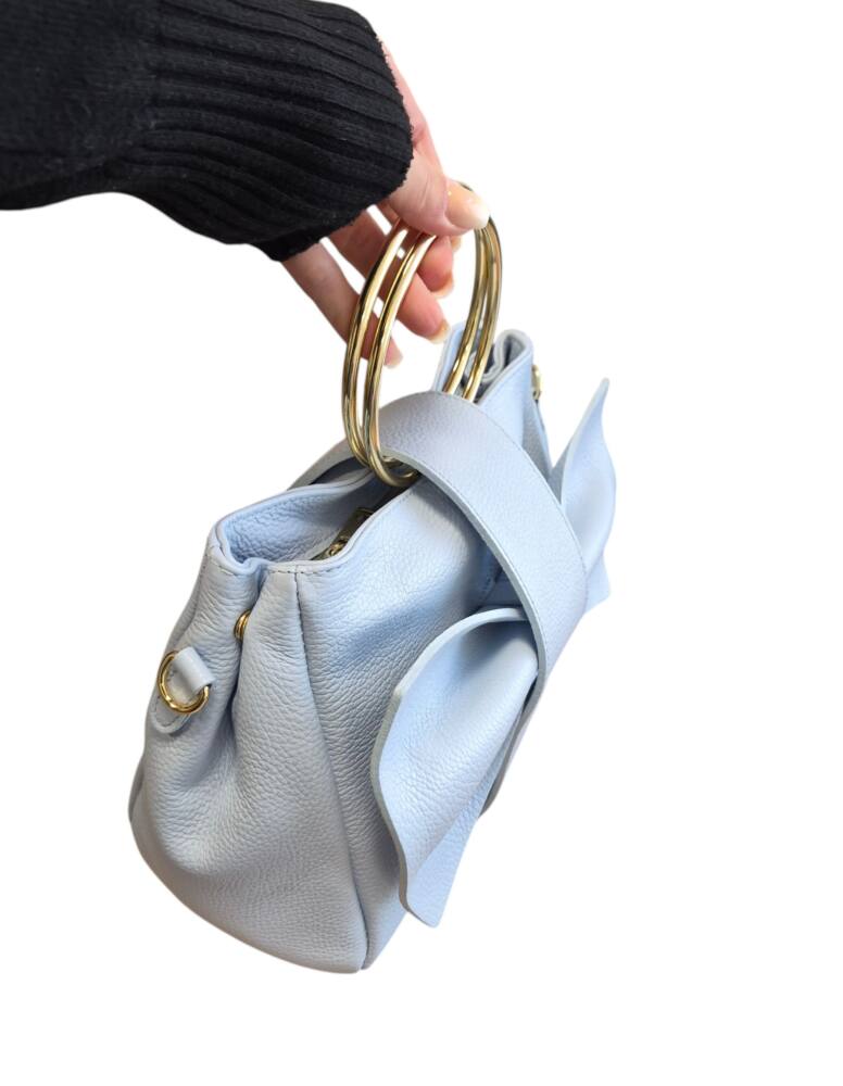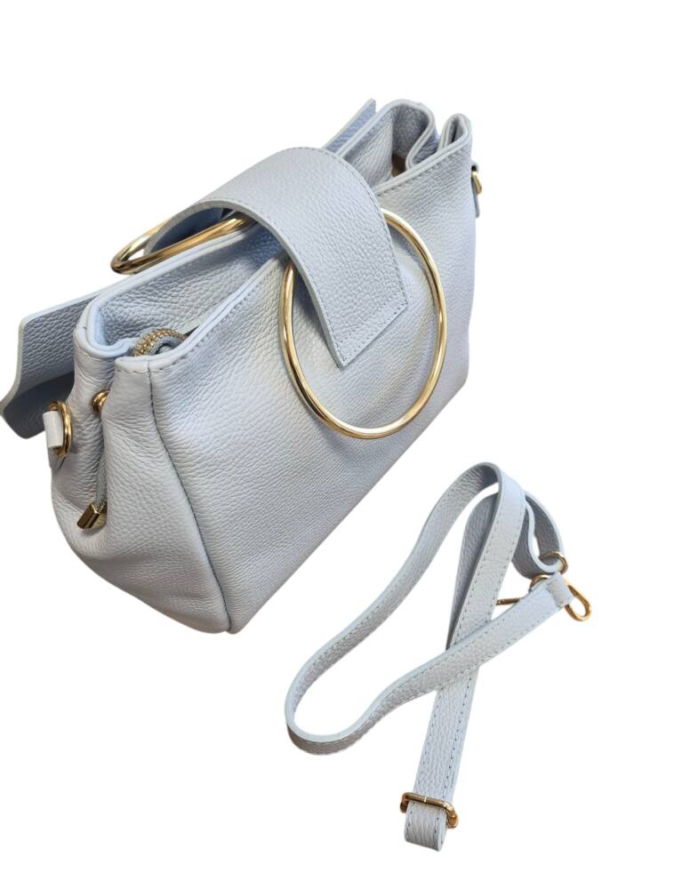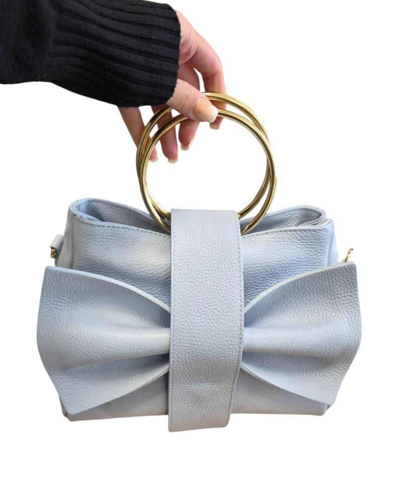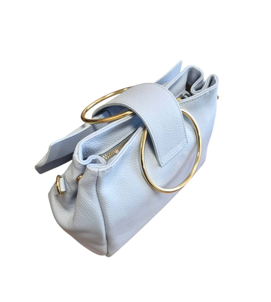 Elegantná dámska kabelka v bledo modrej (baby blue) farbe s kovovými kruhmi (ušami) do ruky s krásnou ozdobnou mašľou. Stredná veľkosť kabelky s prídavným nastaviteľným ramienkom crossbody. Kabelka je vhodná na bežný deň k teniskám a saku ale aj na rôzne spoločenské akcie, svadby, oslavy či dovolenky k letným šatom. Kvalitné spracovanie kože a krásny elegantný dizajn s ktorým zažiarite.