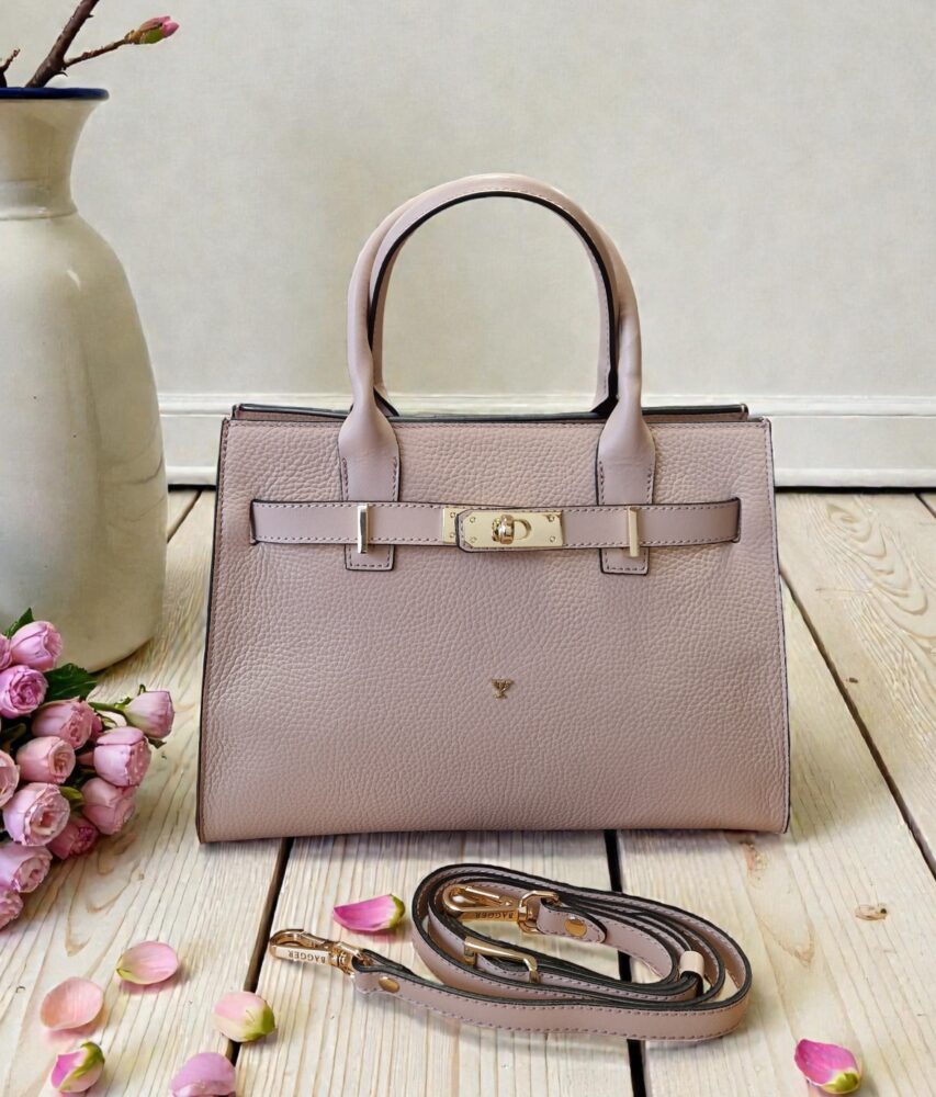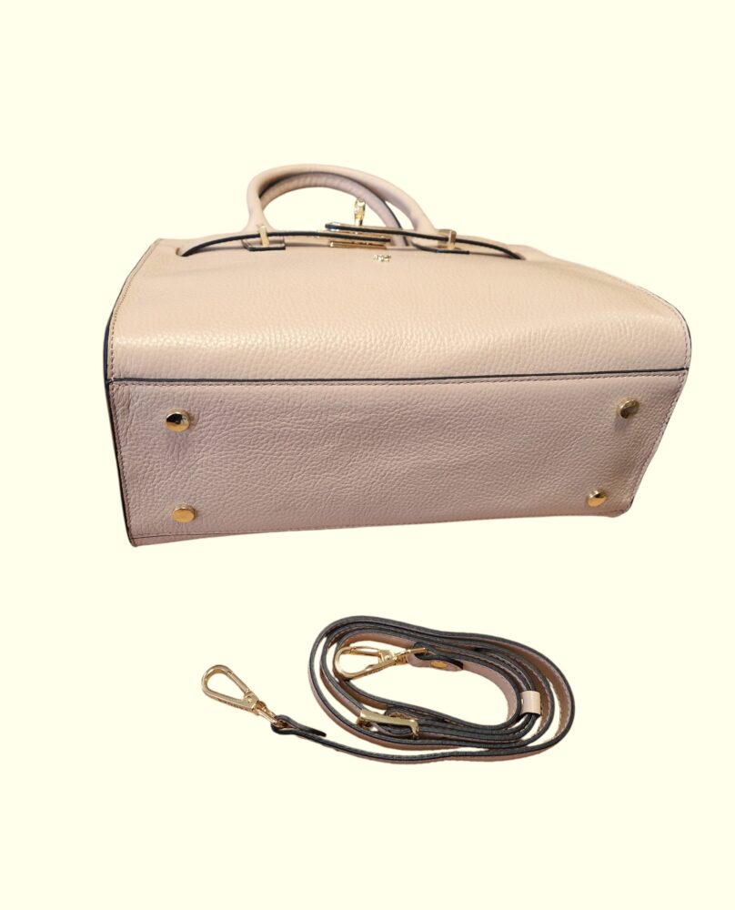 Extravagantná, kožená dámska kabelka do ruky v jemnej ružovo pudrovej farbe so zlatým kovaním. Kabelka v strednej veľkosti s prídavným dlhým ramienkom na nosenie ako crossbody. Vhodná do práce k elegantnému oblečeniu aj ako biznis kabelka, aj do spoločnosti na rôzne oslavy a akcie. Kvalitné kabelky z pravej kože vyrobené na Slovensku.