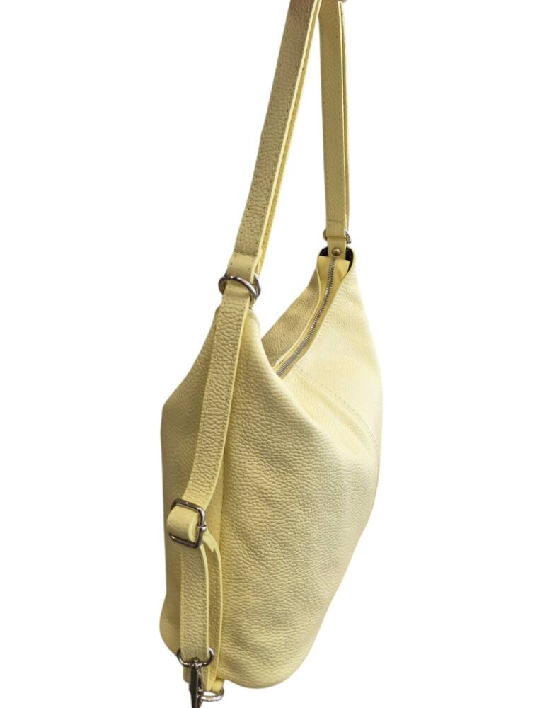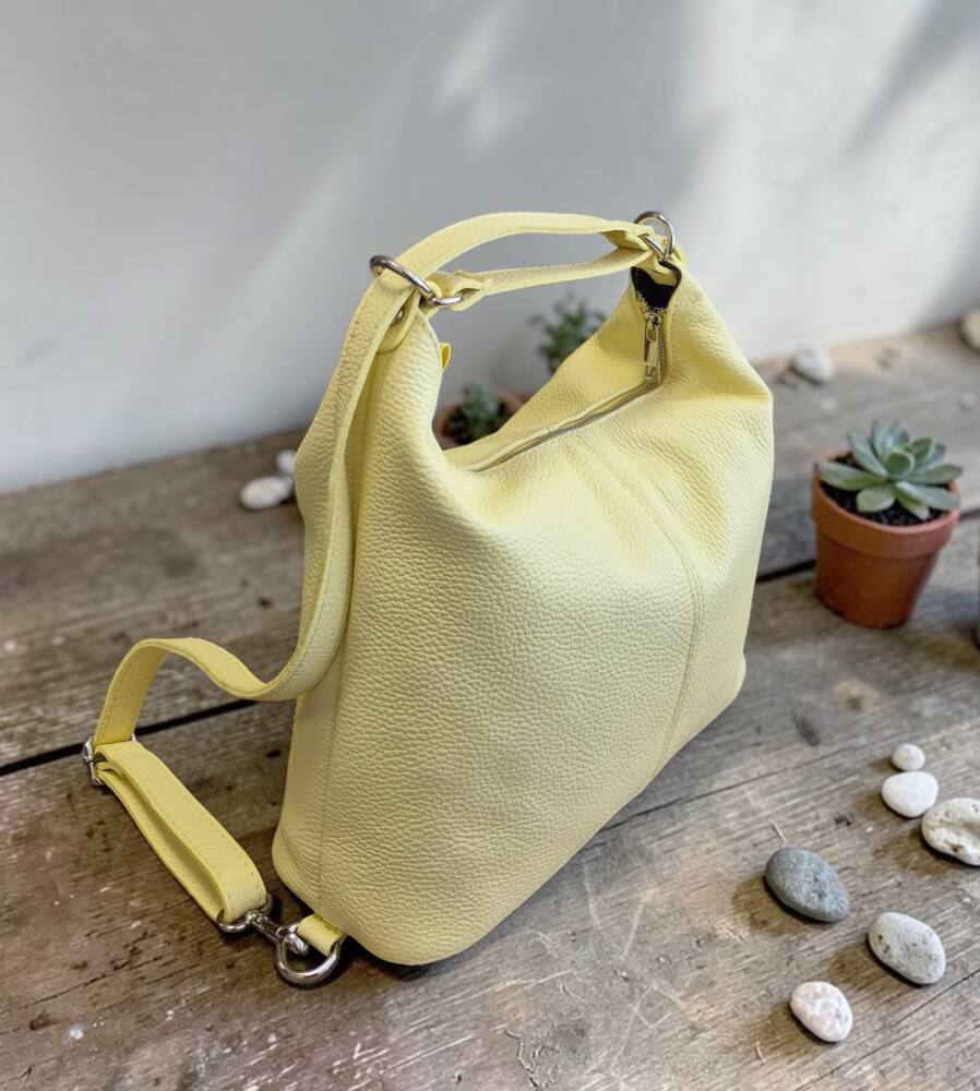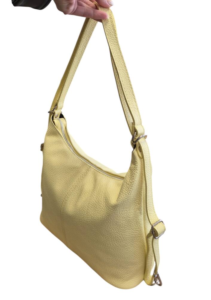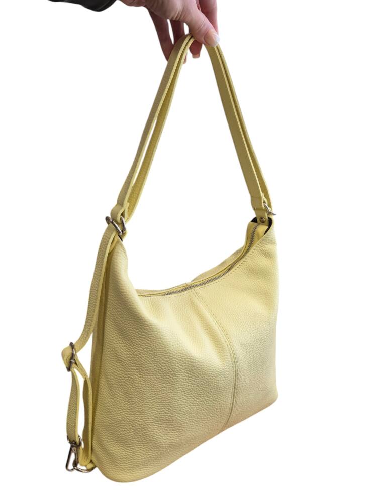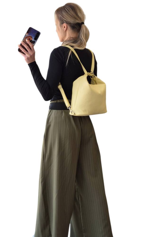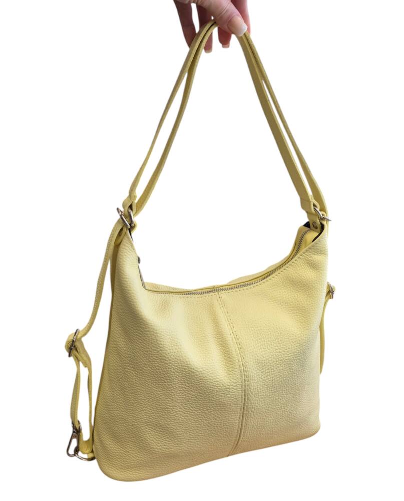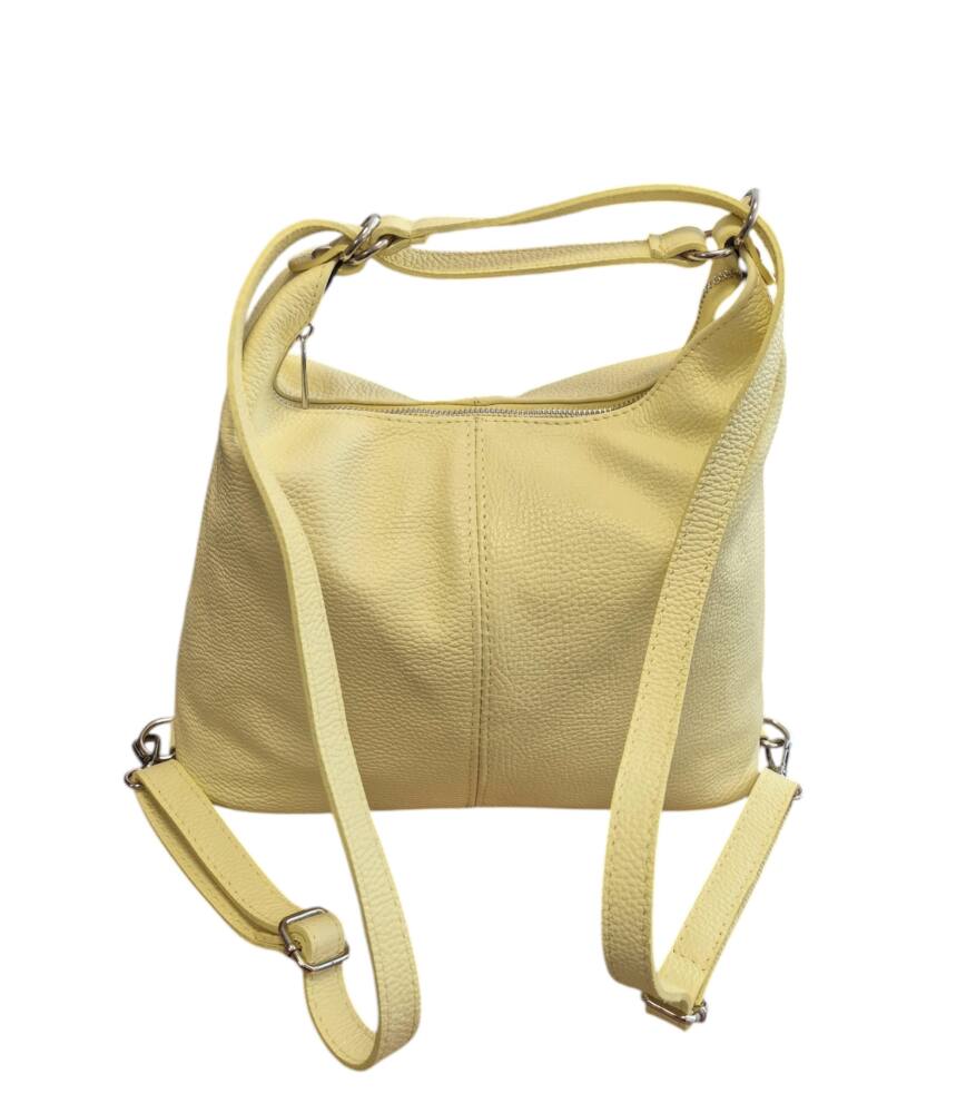 Praktická dámska kabelka a vak v jednom v krásnej, jemnej, bledo žltej farbe v strednej veľkosti. Športovo elegantný batoh ktorý môžete nosiť ako kabelku alebo ako ruksak, stačí prestaviť ramienka. Vnútro obsahuje vrecká na drobnosti so zipsom a bez zipsu. Vhodná na rôzne výlety, dovolenky ale aj na každý deň do práce. Moderný dizajn a kvalitné spracovanie. Kvalitné spracovanie kože ktoré vám vydrží roky a moderný dizajn z Talianskej dielne.