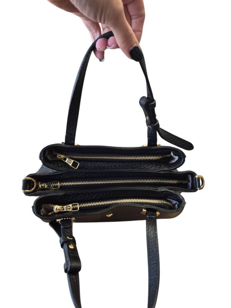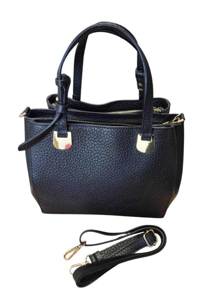 Praktická, štýlová dámska kabelka s dvomi kratšími ušami do ruky a dlhým prídavným ramienkom. Kabelka v strednej veľkosti, elegantná a nadčasová, vďaka prídavnému ramienku ju môžete nosiť nie len na ramene ale aj pohodlne krížom cez plece ako crossbody. Kabelka ma množstvo úložného priestoru, tri hlavné priehradky na zips a vrecká na drobnosti. Perfektná aj ako biznis kabelka na rôzne akcie, školenia či rokovania. Ikonické zlaté kovanie a kvalitná jemne vrúbkovaná štruktúra kože, odolná voči poškriabaniu. Kvalitný Slovenský výrobok – Garancia dlhej životnosti.