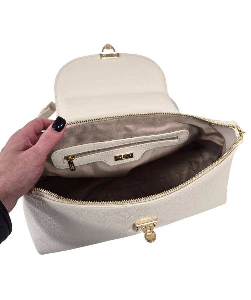 Dámska štýlová biela kabelka do ruky s prídavným nastaviteľným ramienkom so zlatým kovaním. Kabelka strednej veľkosti, vhodná k elegantnejšiemu oblečeniu do práce či do spoločnosti. Ikonické kovové zapínanie a zips. Moderný dizajn a kvalitné spracovanie.