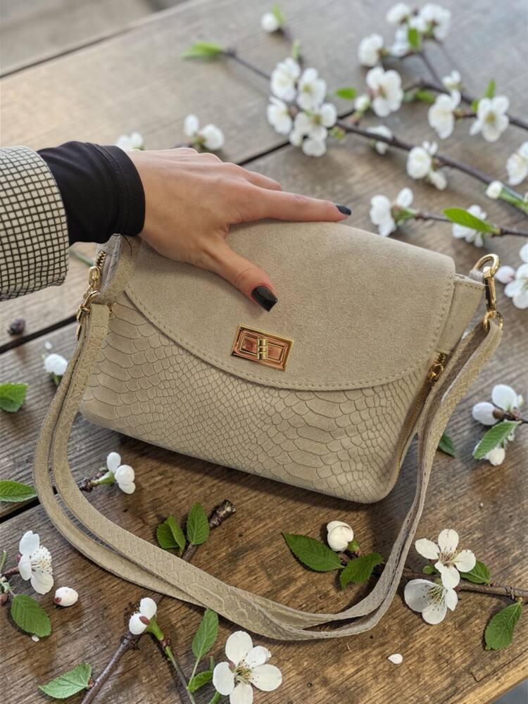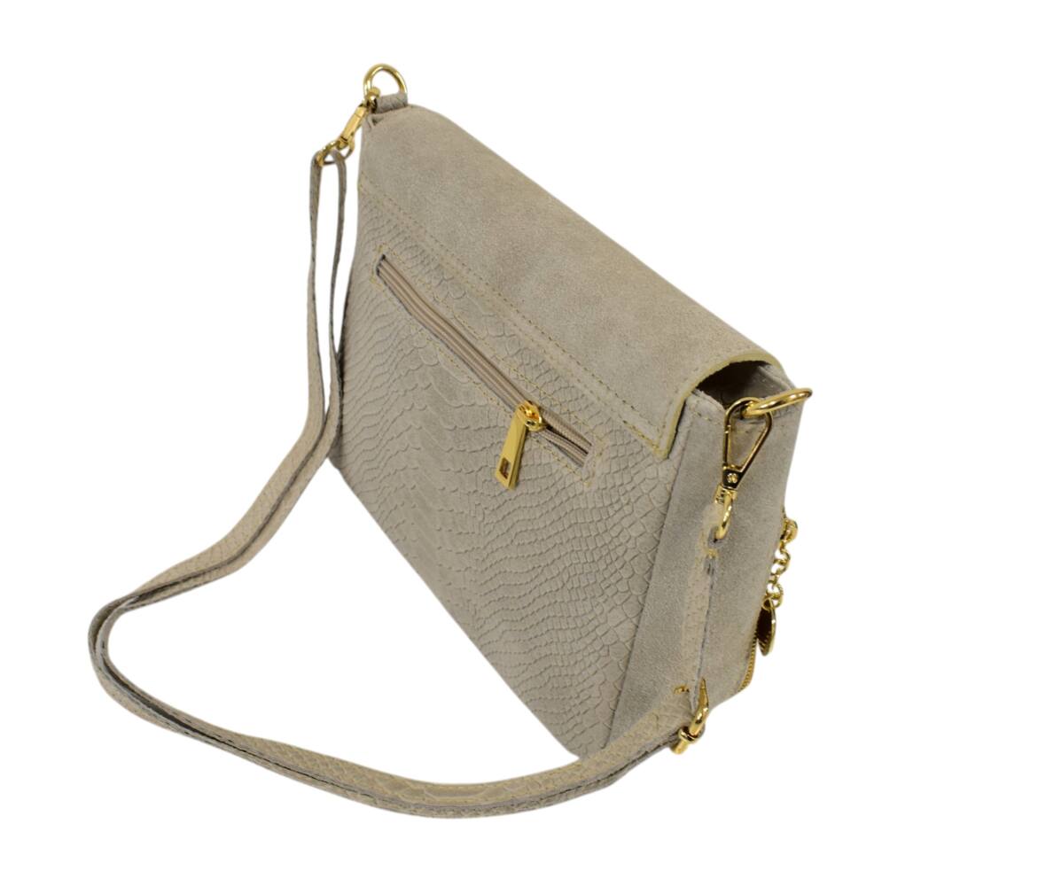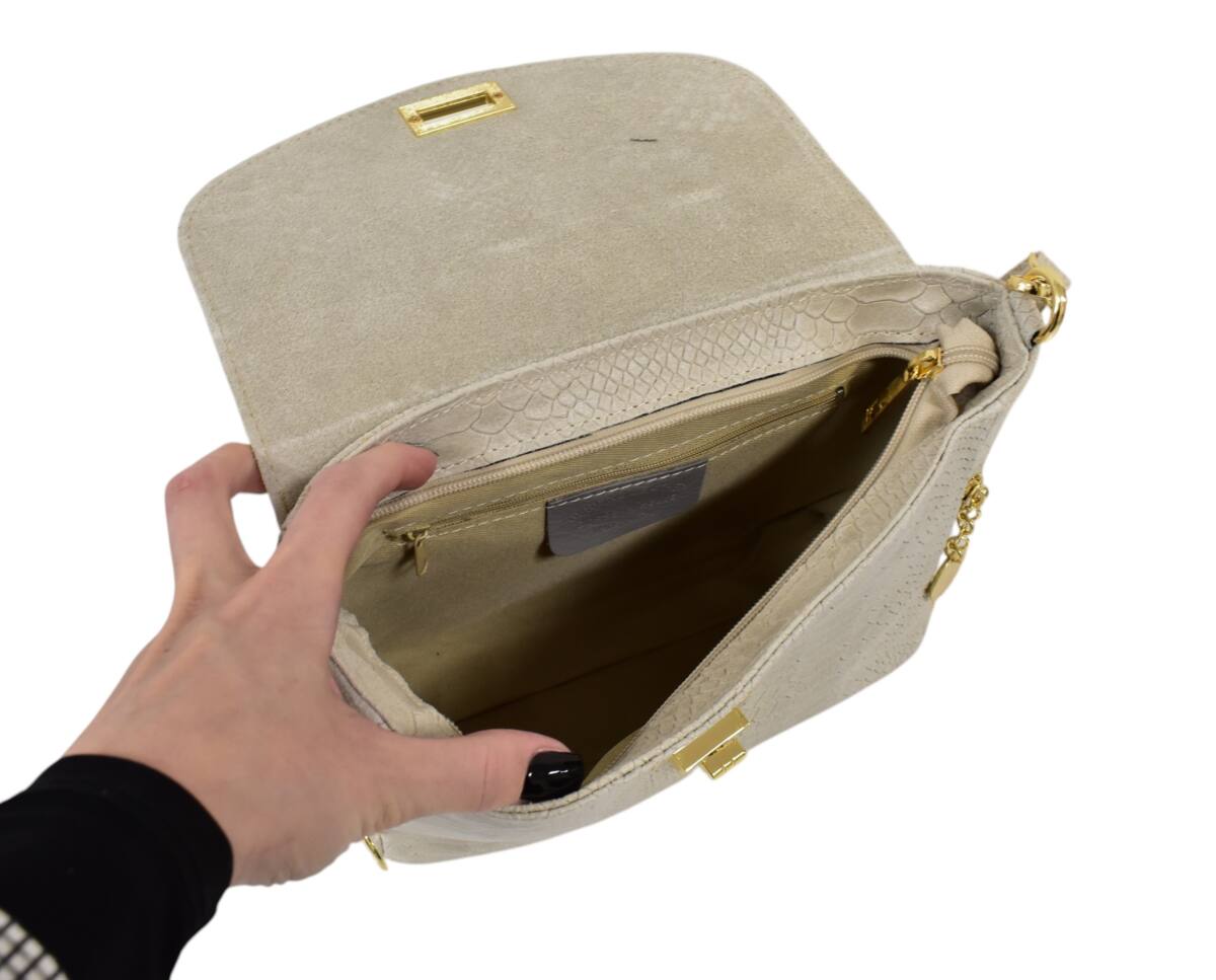 Dámska menšia kabelka z pravej kože s hadím vzorom, kombinovaná s brúsenou kožou. Kabelka je vhodná na nosenie do ruky na rameno ale aj ako crossbody vďaka dlhému nastaviteľnému ramienku. Elegantný moderný dizajn na každý deň do mesta či na spoločenskú akciu. Kvalitné spracovanie kože z Talianskej dielne.