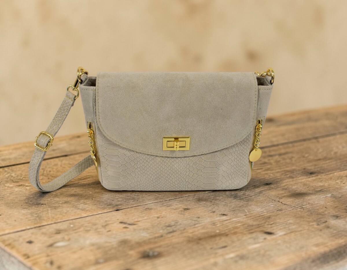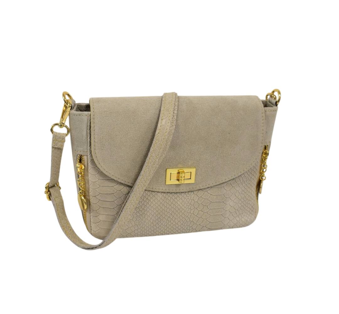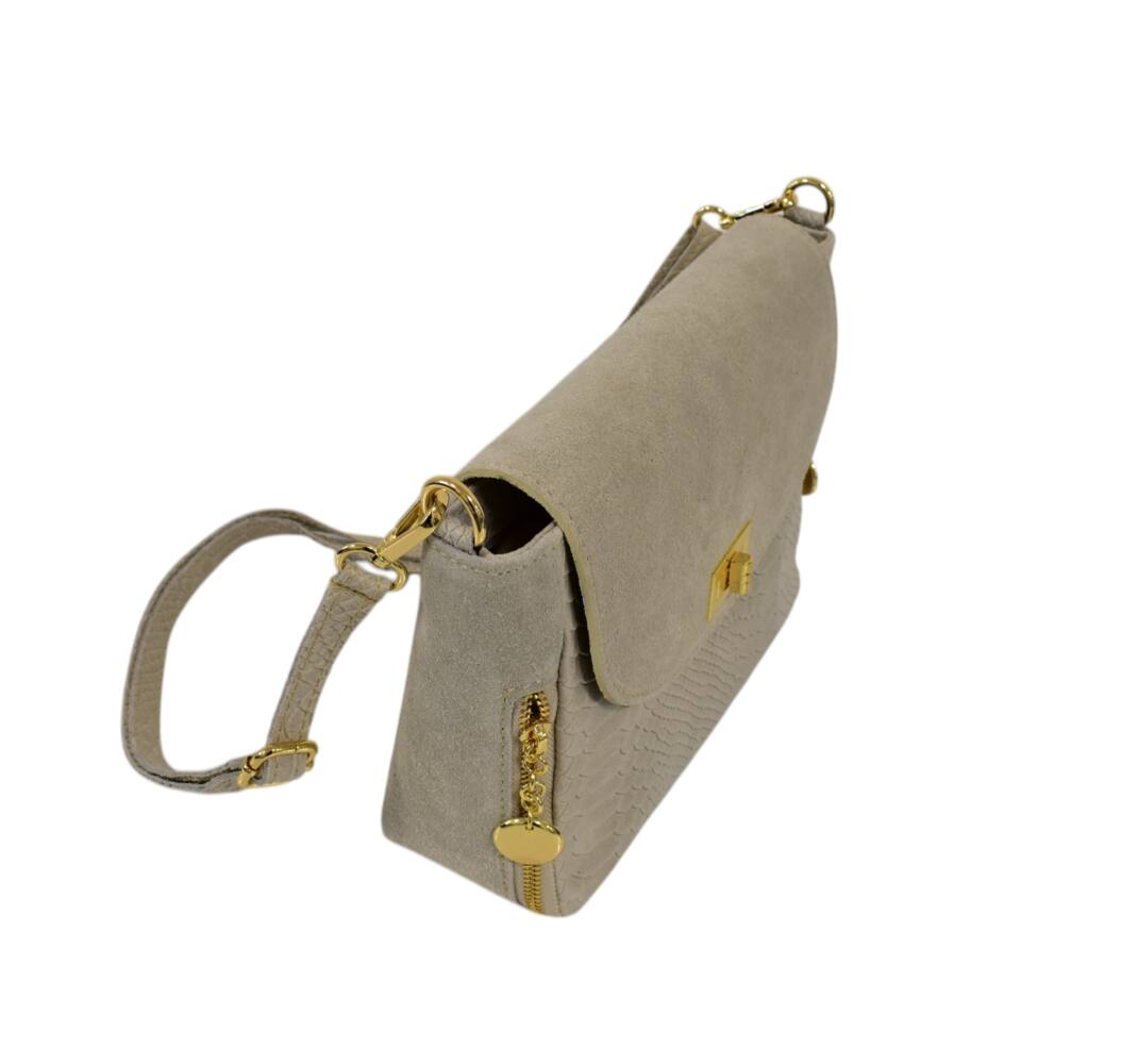 Dámska menšia kabelka z pravej kože s hadím vzorom, kombinovaná s brúsenou kožou. Kabelka je vhodná na nosenie do ruky na rameno ale aj ako crossbody vďaka dlhému nastaviteľnému ramienku. Elegantný moderný dizajn na každý deň do mesta či na spoločenskú akciu. Kvalitné spracovanie kože z Talianskej dielne.