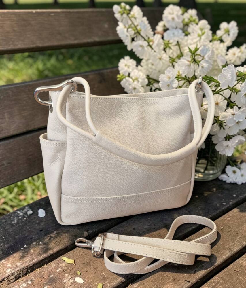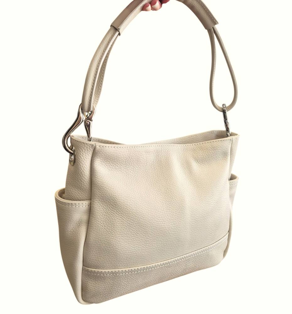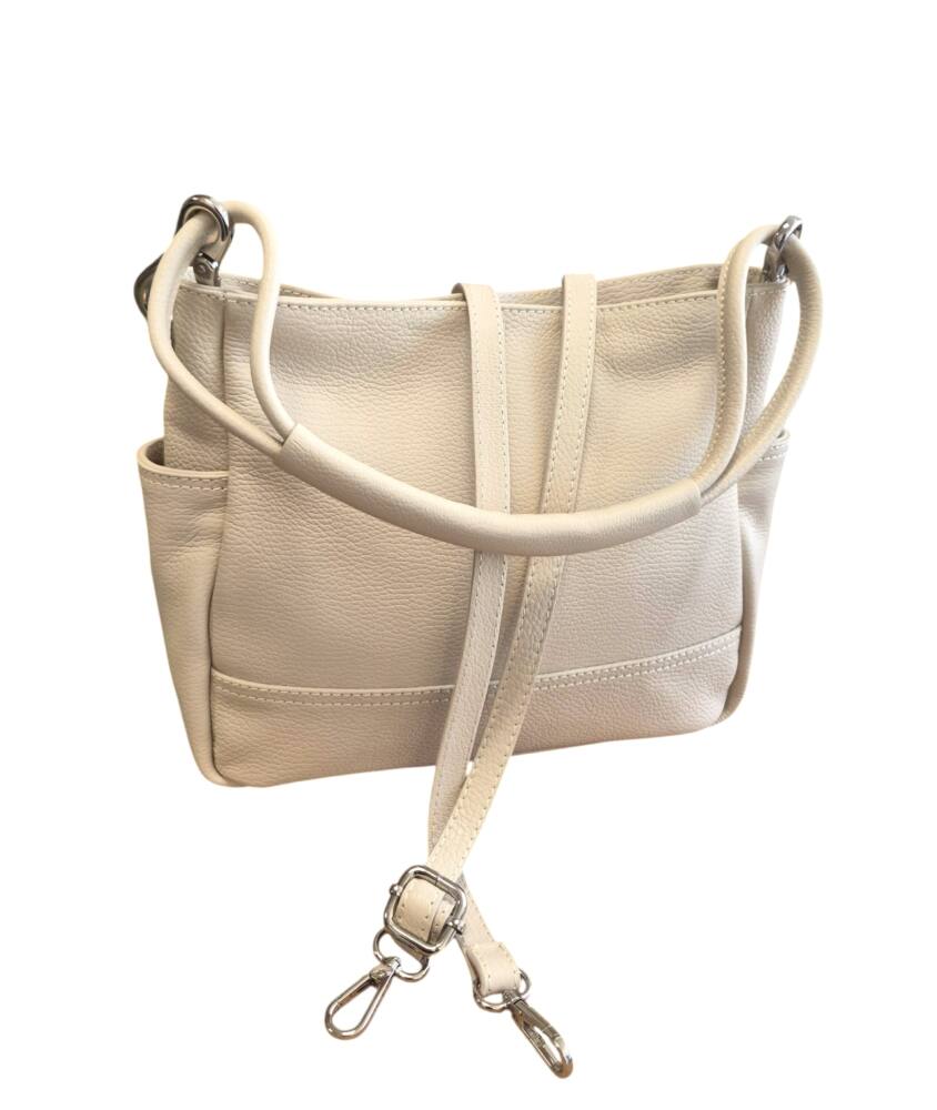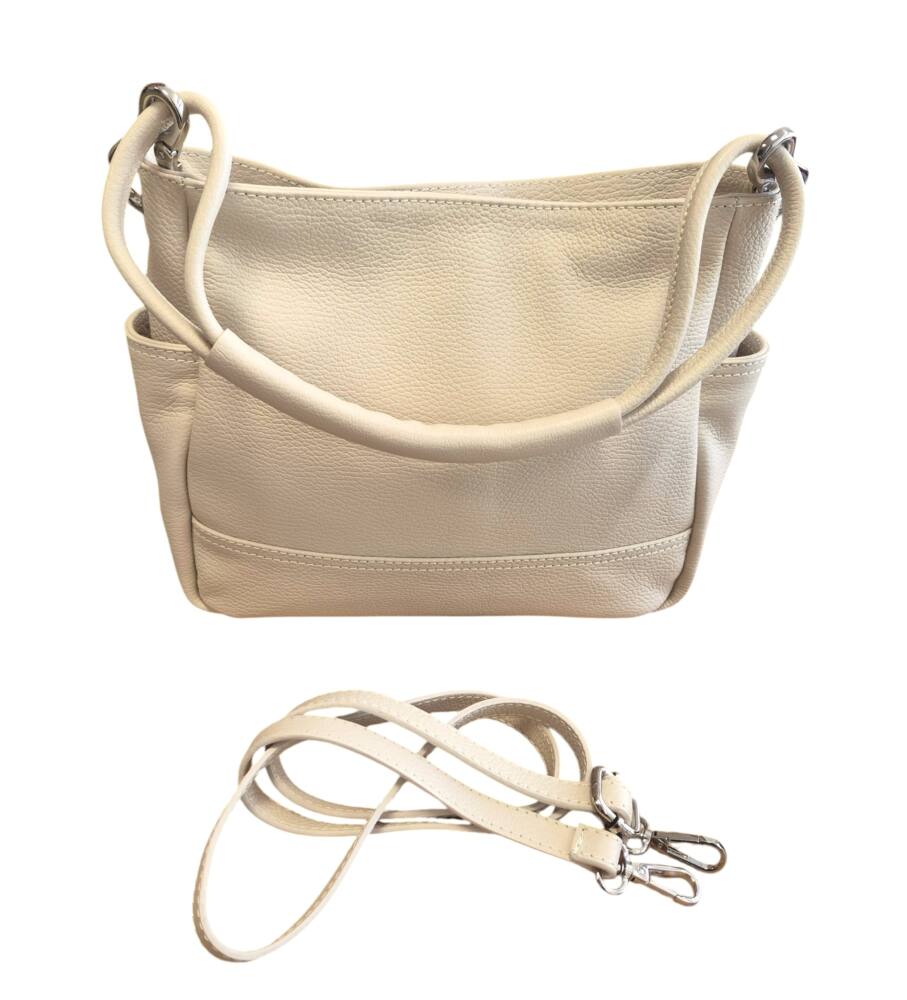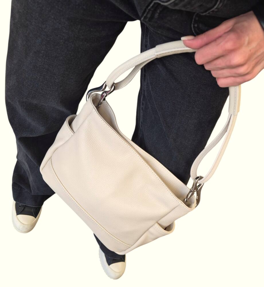Dámska kabelka s jedným uškom do ruky/na rameno v bledej maslovej farbe (slonia kosť). Kabelka obsahuje aj prídavné ramienko takže ju môžete pohodlne nosiť aj krížom cez telo ako crossbody. Vhodná na každý deň do práce či na dovolenku. Športovo elegantná kabelka k lodičkám ale aj teniskám. Kvalitné spracovanie kože a nadčasový dizajn z Talianskej dielne.