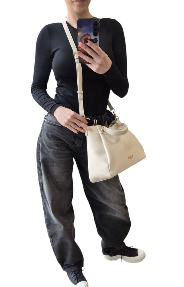 Praktická, dámska krémovo béžová (slonia kosť) kabelka s dvomi krátkymi ušami do ruky a dlhým prídavným ramienkom na nosenie krížom cez plece. Stredná veľkosť kabelky na každodenné nosenie do mesta, do práce ale aj do spoločnosti. Hodí sa k teniskám ale aj k lodičkám, perfektný a praktický módny doplnok na vaše každodenné výjazdy. Ikonické zlaté kovanie a množstvo úložného priestoru.