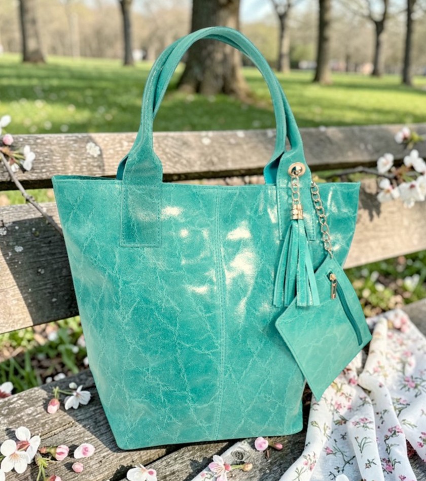 Praktická dámska kožená kabelka na rameno v sýtej tyrkysovej farbe. Vhodná na každodenné využitie do práce, na nákupy, či na výlet. Súčasťou kabelky je aj prívesok s vrecúškom na drobnosti. Bezpečné zapínanie na zips a vnútorné bočné vrecko tiež na zips. Kvalitné spracovanie a moderný dizajn.