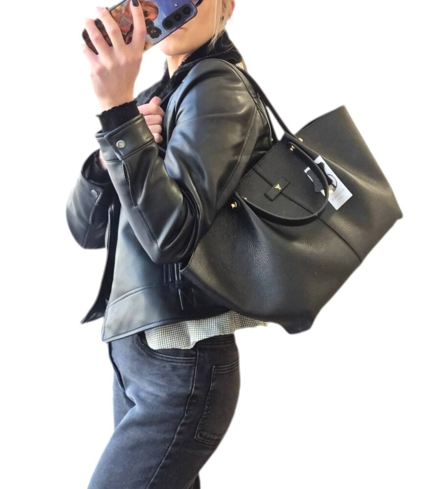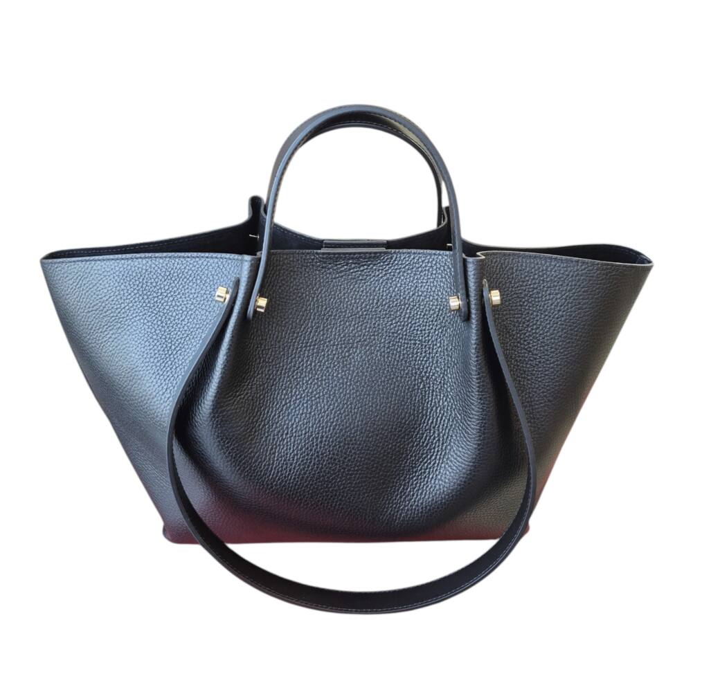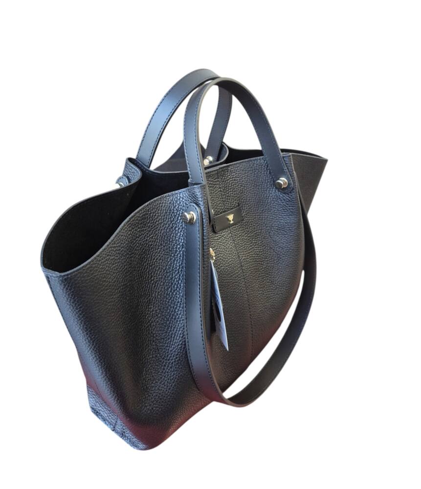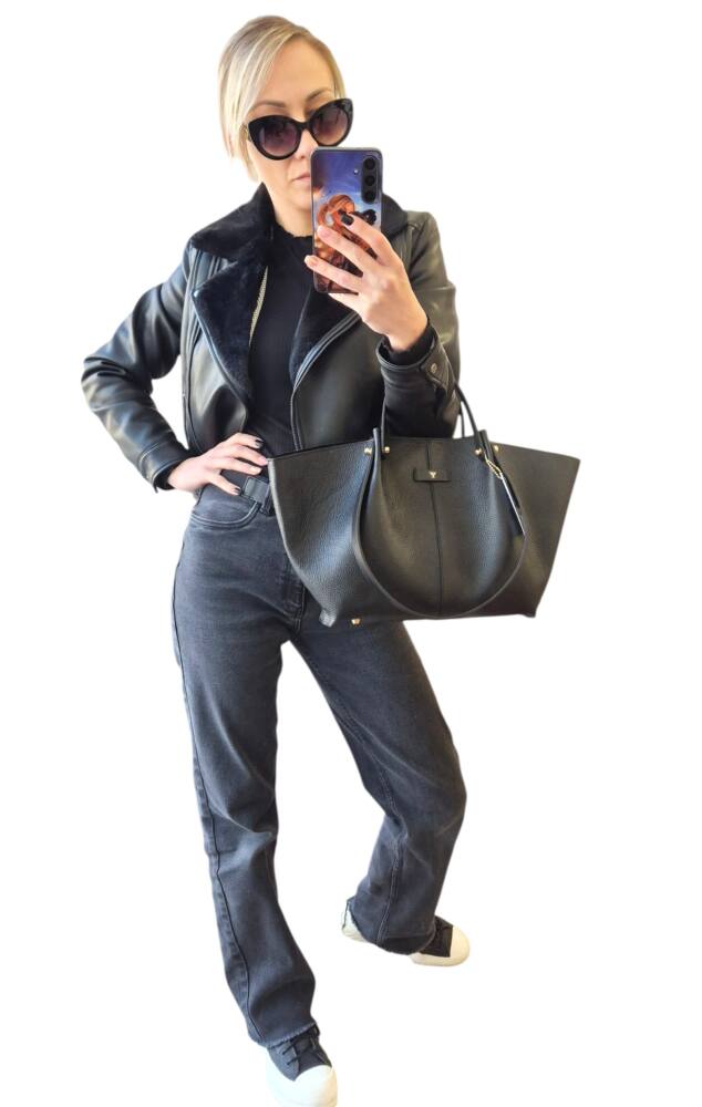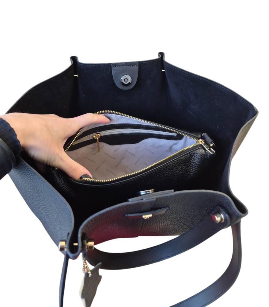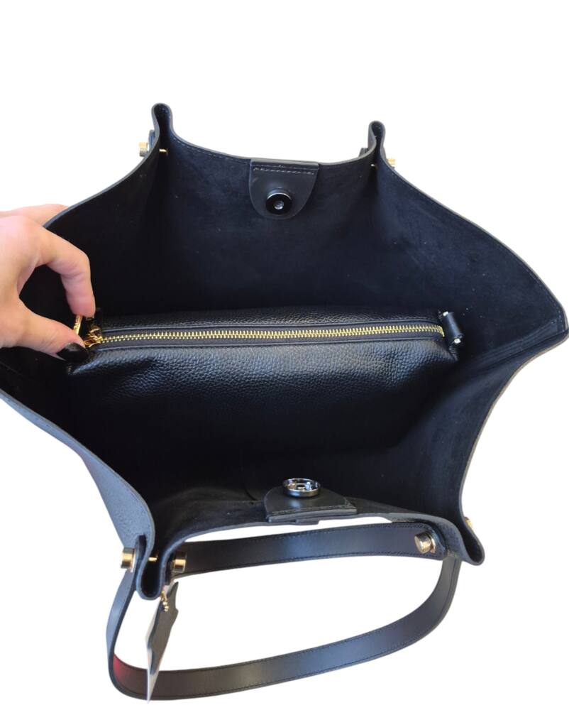 Elegantná dámska kabelka v čiernej farbe so zlatým kovaním do ruky na rameno. Kabelka v strednej veľkosti s vyberateľnou väčšou kozmetickou taškou na zips s vreckom. Kvalitná kabelka z kože pre dámy ktoré si potrpia na kvalitu a moderný, elegantný dizajn. Vhodná do práce ale aj do spoločnosti. Kabelky šité na Slovensku.