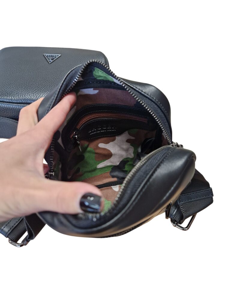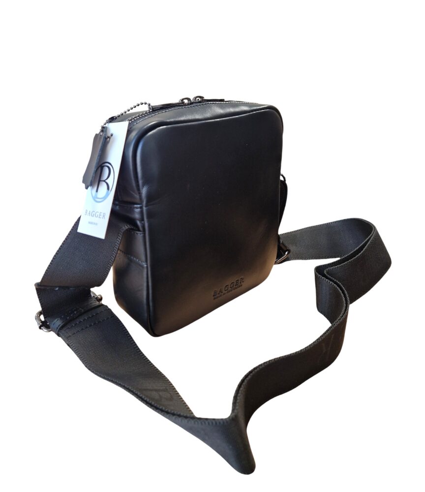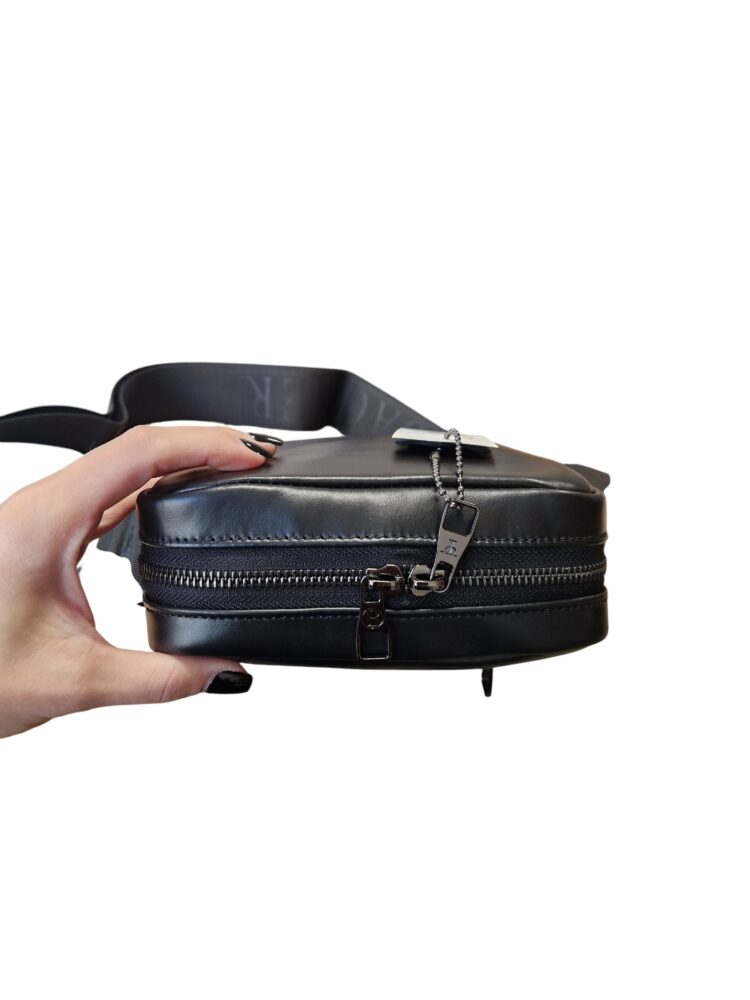 Štýlová, elegantná pánska crossbody kabelka v čiernej farbe. Taštička je vhodná na každodenné využitie. Obsahuje jedno vrecko na zips vo vnútri a jedno na zips z prednej strany kabelky. Ramienko je nastaviteľné. Moderný dizajn a kvalitné spracovanie kože. Vyrobené na Slovensku.