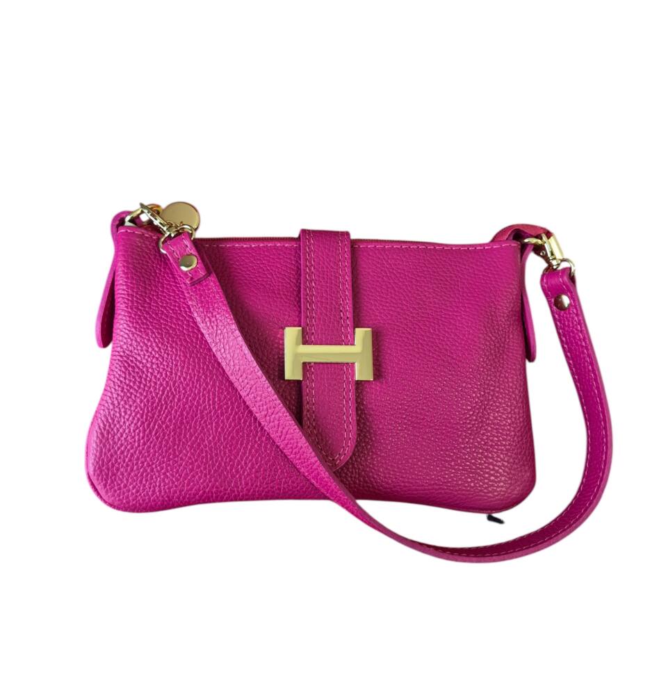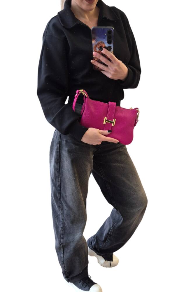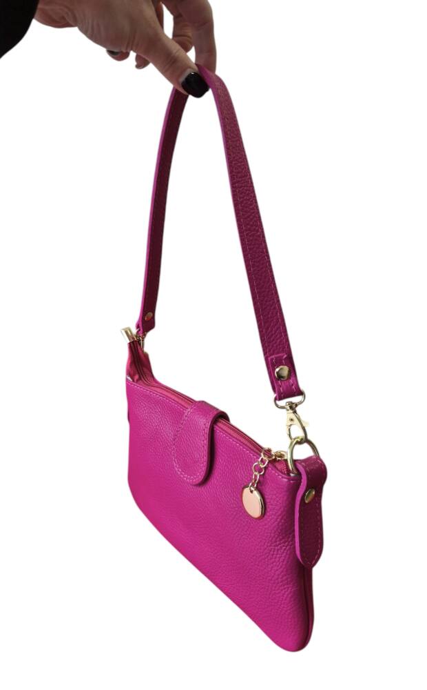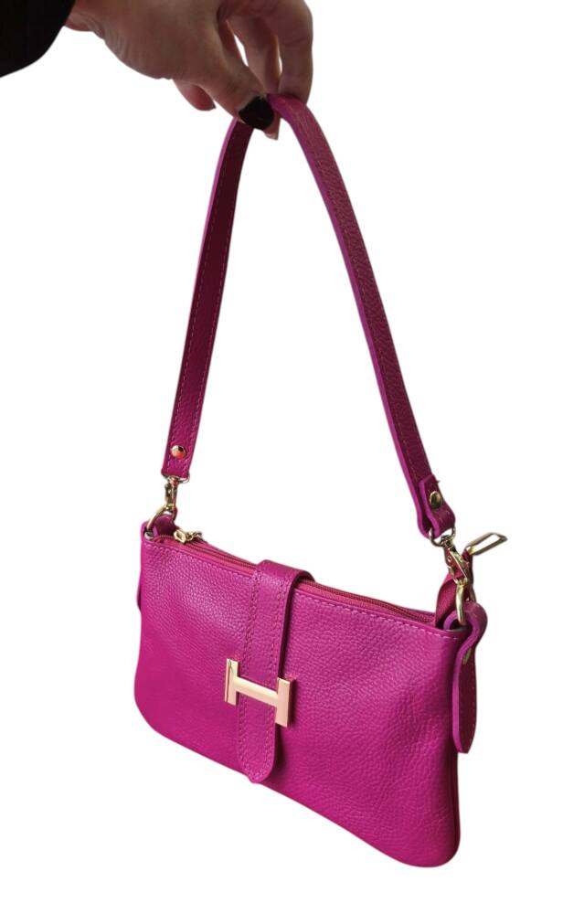 Športovo elegantná malá dámska crossbody kabelka v ružovej – magenta farbe do ruky/na rameno. Kabelku môžete nosiť na 3 spôsoby, ako listovú bez ramienka, do ruky s kratším uškom, ako crossbody kabelku krížom cez plece. Vhodná na každý deň k teniskám ale aj do spoločnosti k elegantnému oblečeniu či už si dáte sandále alebo lodičky. Kvalitné spracovanie kože a moderný dizajn s krásnou kovovou ozdobou. Vyrobené v Taliansku.