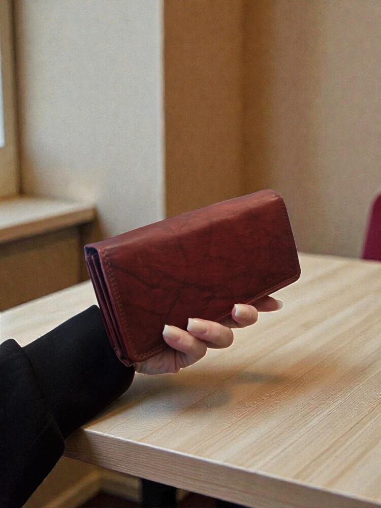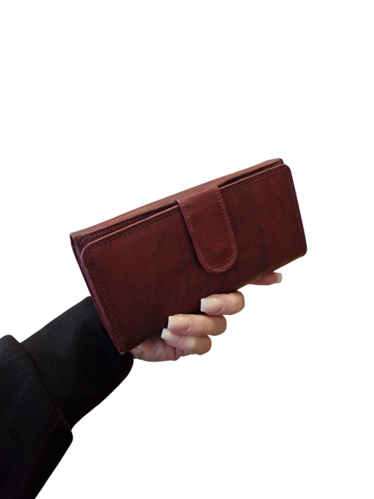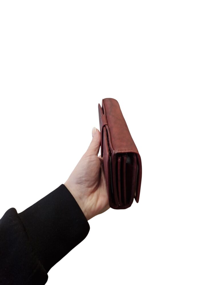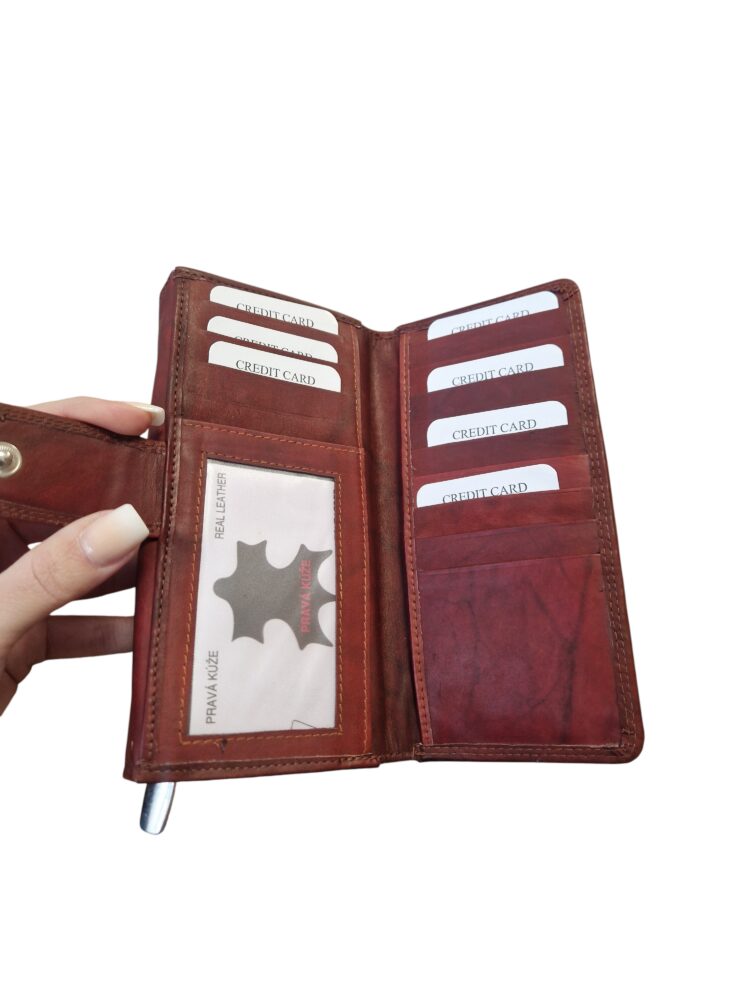 Praktická, elegantná dámska peňaženka v bordovo hnedej farbe na cvok. Dva hlavné úložné priestory. Vhodná do stredných a väčších kabeliek. Univerzálny dizajn vhodný aj pre pánov. Kvalitné spracovanie kože.