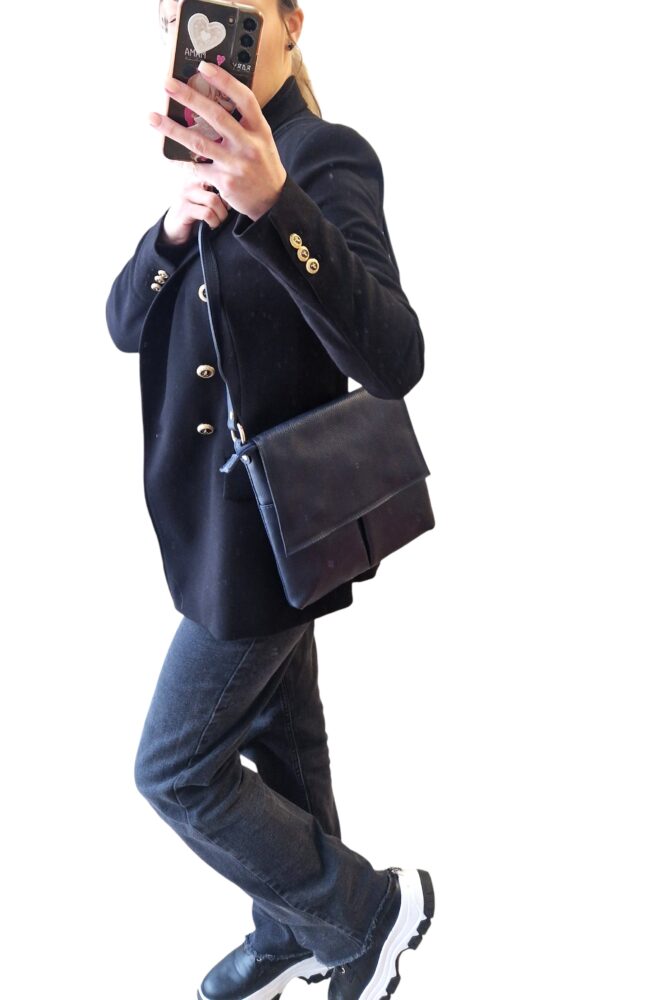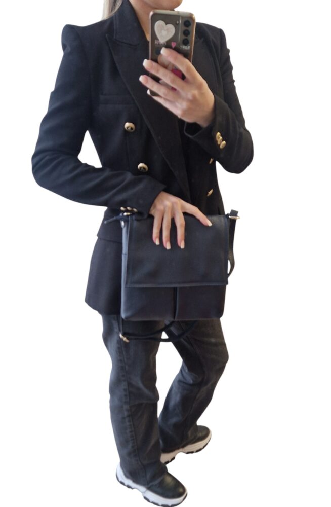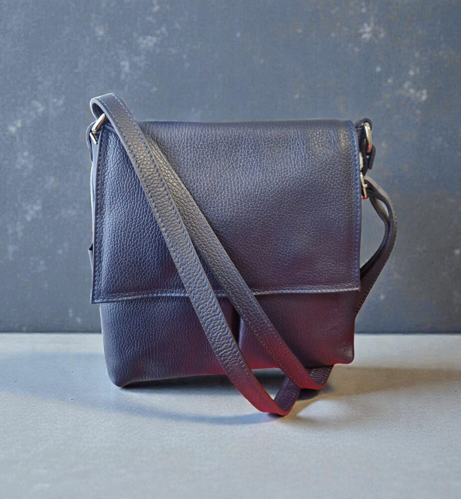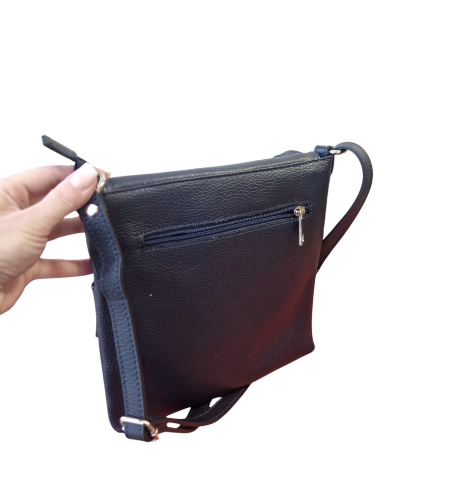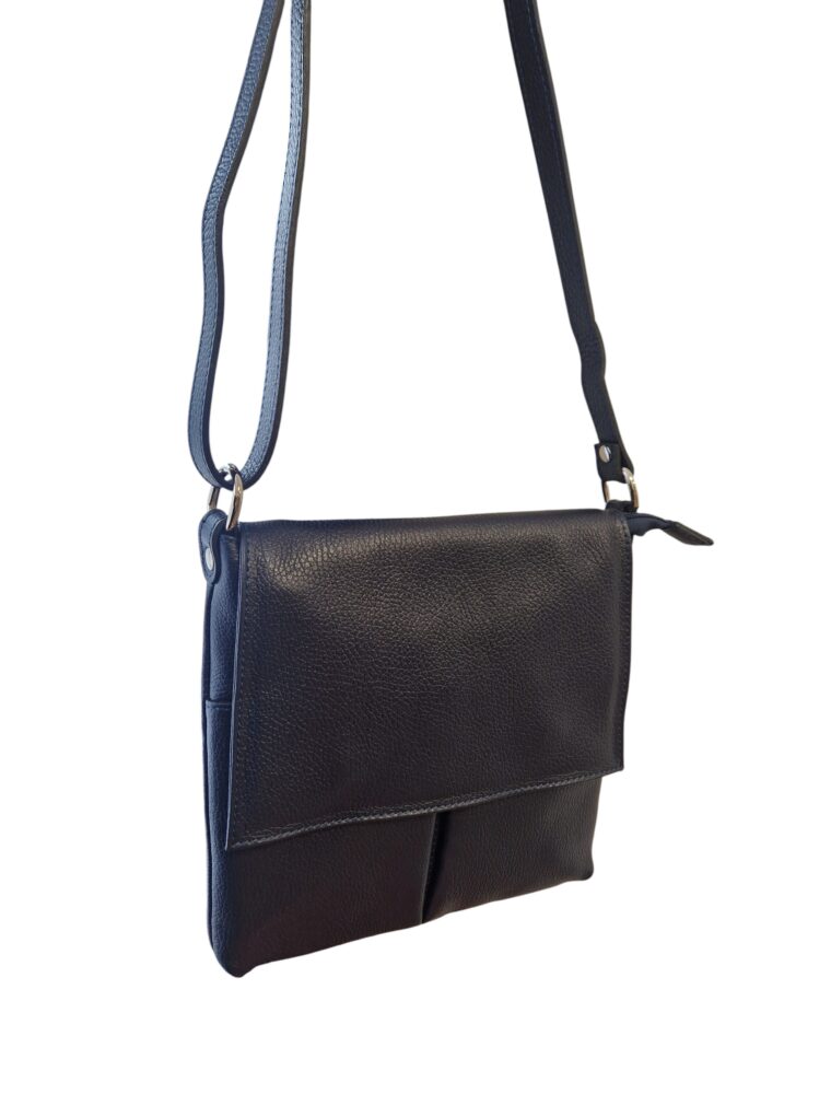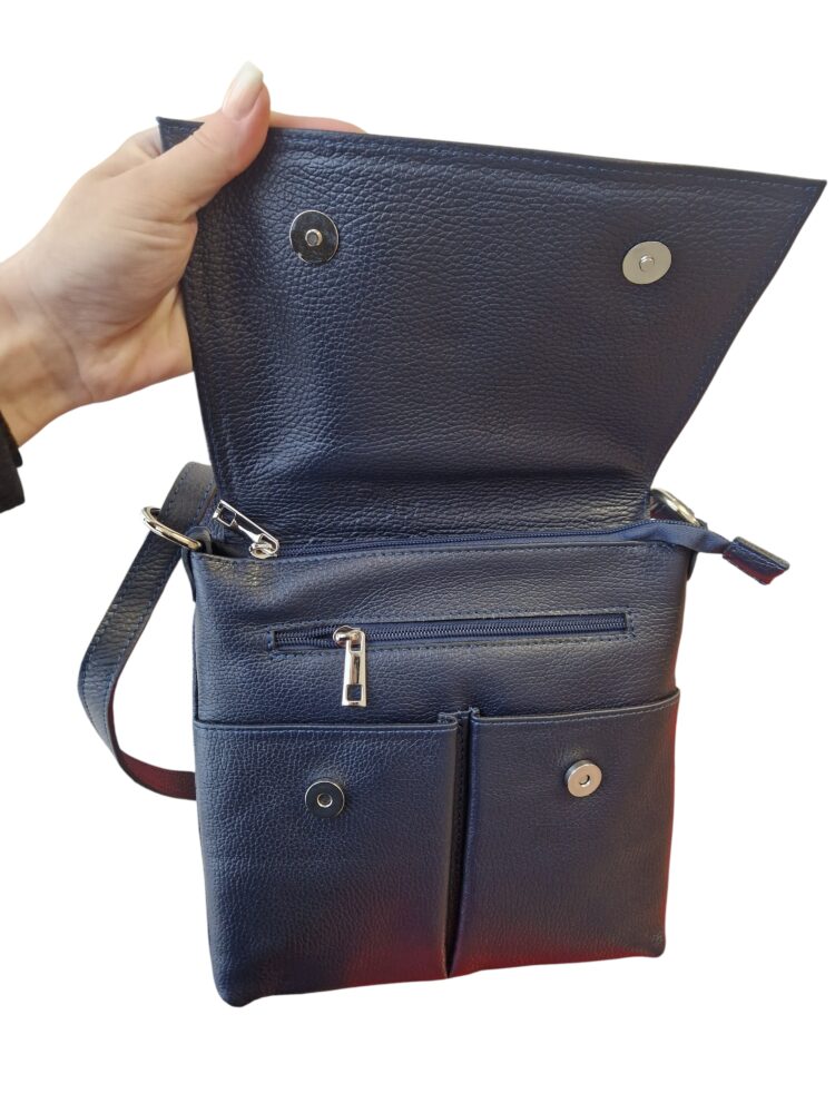 Športovo elegantná dámska kožená kabelka v tmavo modrej farbe s nastaviteľným dlhým ramienkom krížom cez rameno. Módny doplnok pre dámy na každodenné využitie. Vhodná do práce, na nákupy ale aj na rôzne výlety. Vonkajšie aj vnútorné vrecká na drobnosti, uzatváranie na zips a magnety. Kvalitné spracovanie kože.