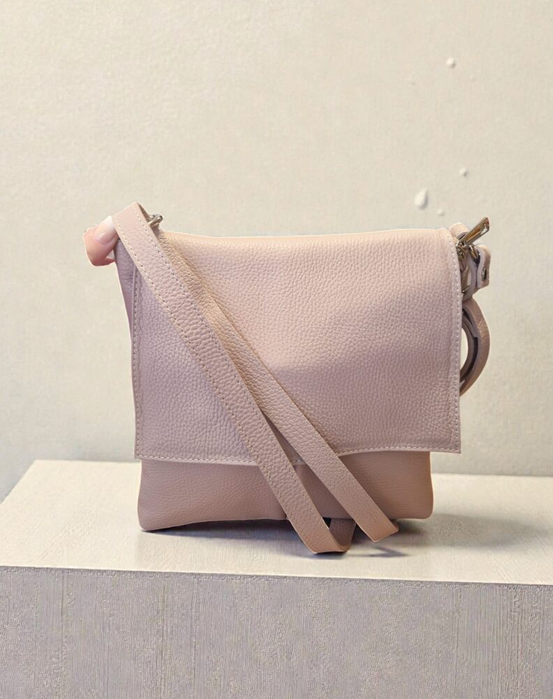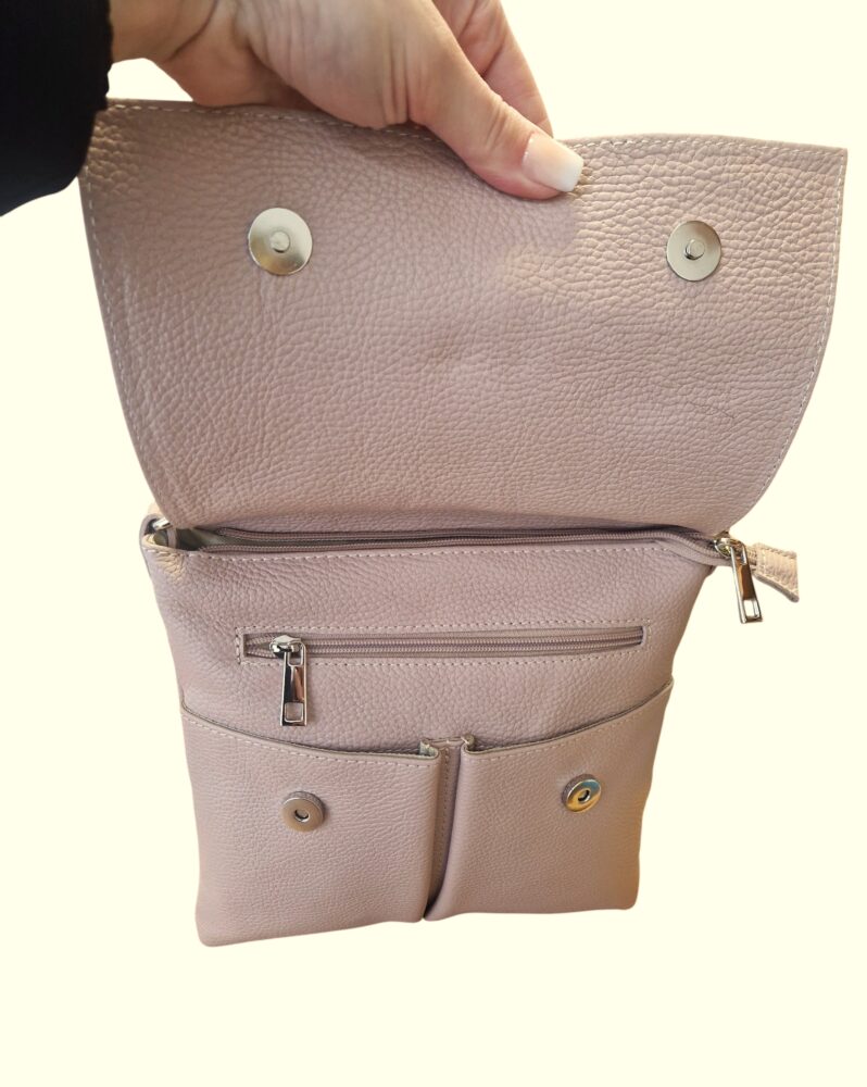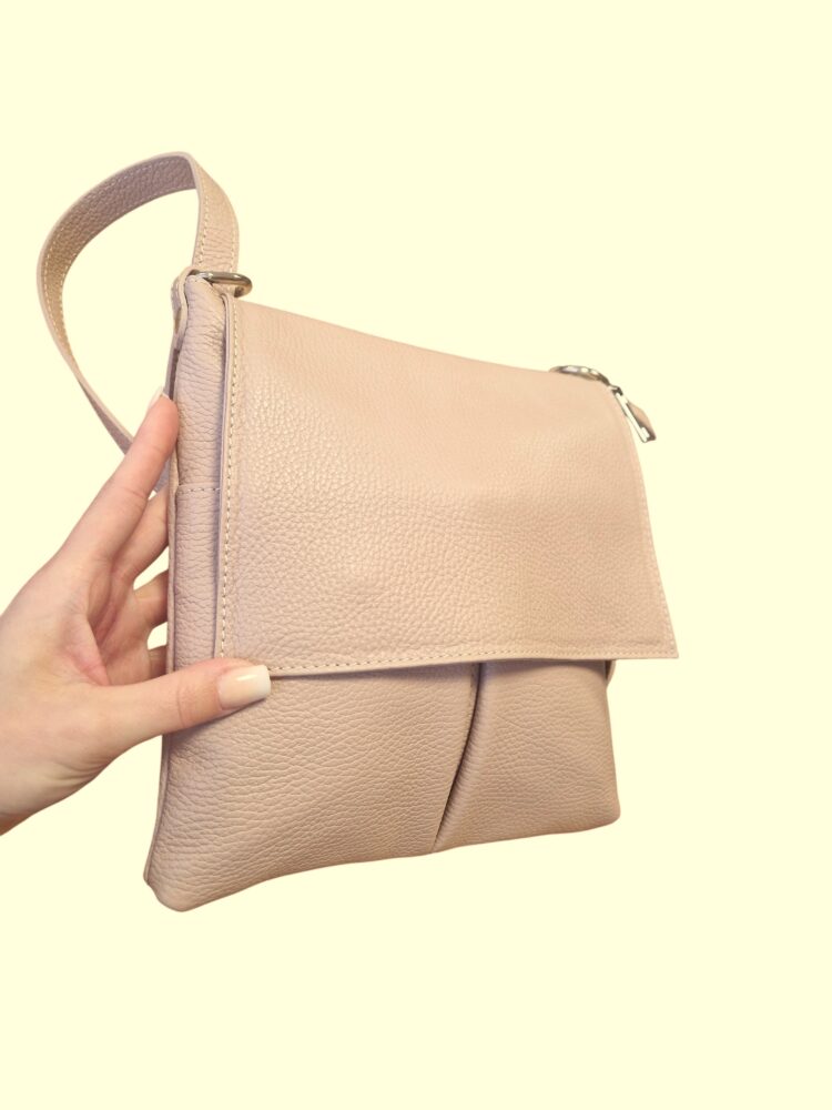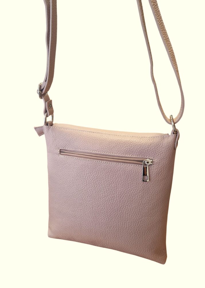 Športovo elegantná dámska kožená kabelka v bledej pudrovo ružovej farbe s nastaviteľným dlhým ramienkom krížom cez rameno. Módny doplnok pre dámy na každodenné využitie. Vhodná do práce, na nákupy ale aj na rôzne výlety. Vonkajšie aj vnútorné vrecká na drobnosti, uzatváranie na zips a magnety. Kvalitné spracovanie kože.