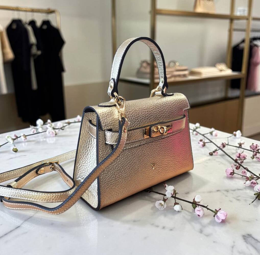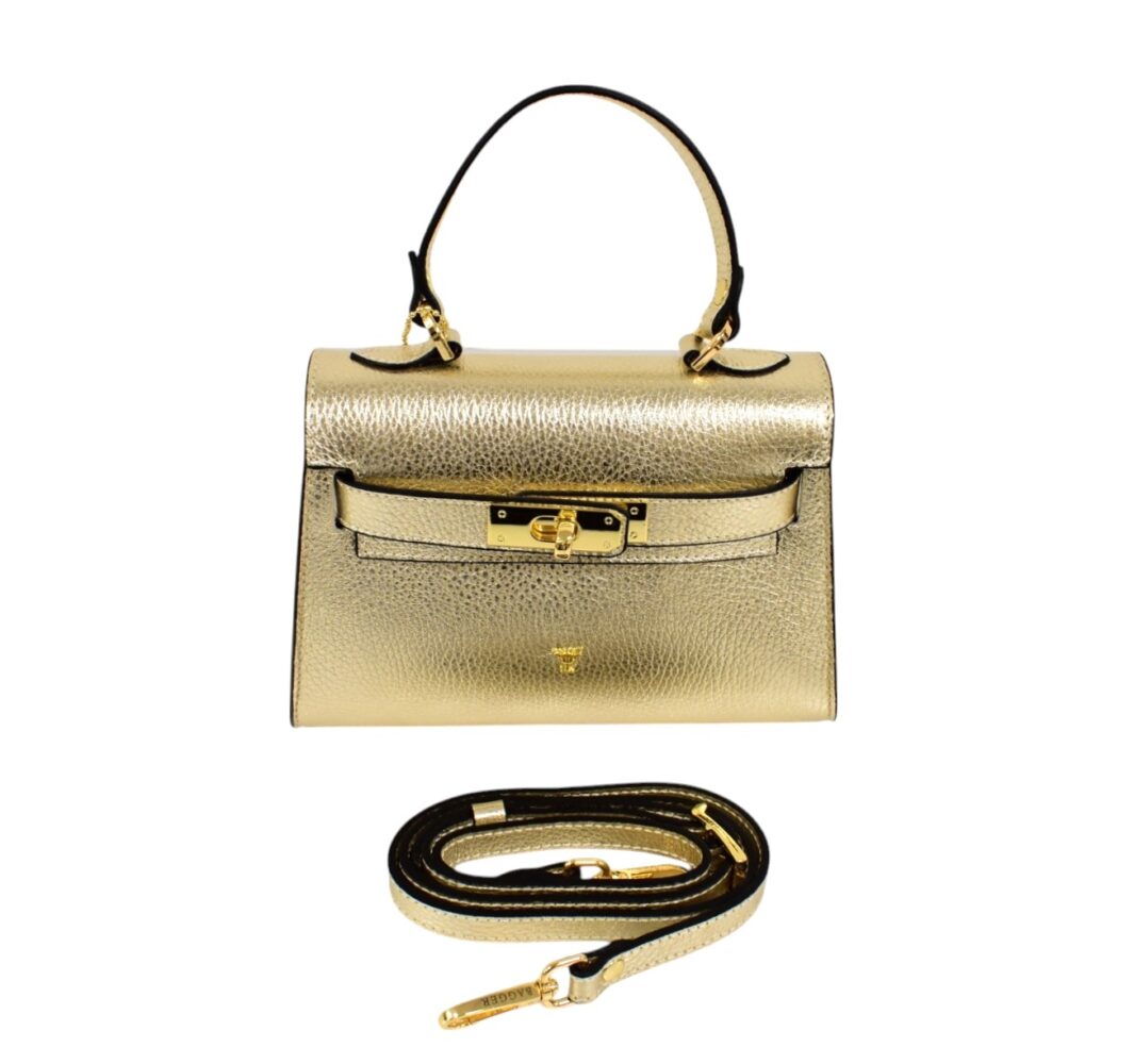 Krásna Elegantná mini kabelka v zlatej farbe do ruky s kovovým zapínaním a prídavným ramienkom. Kabelka v hermes, biznis štýle v menšej veľkosti. Vhodná do práce či do spoločnosti aj k športovo elegantnému oblečeniu. Kabelka je vhodná aj na svadby či rôzne oslavy. Moderný, elegantný dizajn a kvalitné spracovanie. Slovenský výrobok.