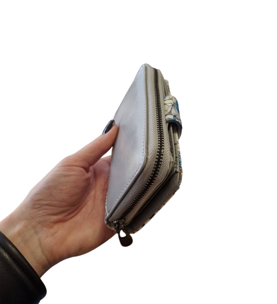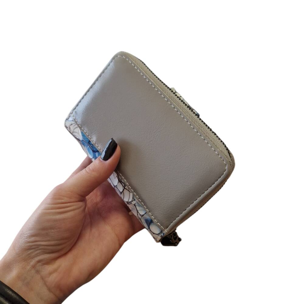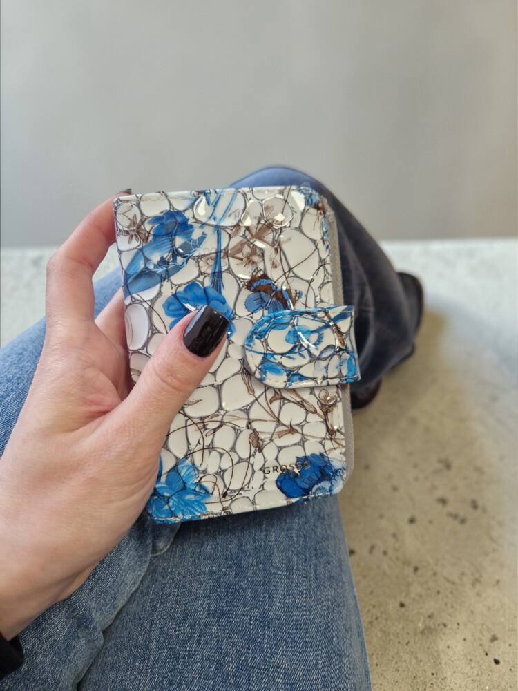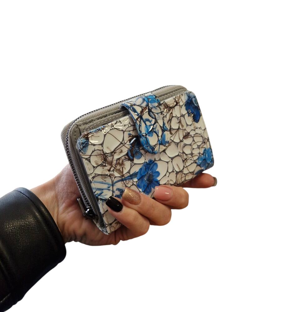 Elegantná dámska bielo šedá peňaženka s kvetinovým Modrým vzorom. Menšia veľkosť s lakovaným povrchom, vhodná aj do menších kabeliek. Množstvo úložného priestoru dva hlavné priečinky na zips a na cvok. Kvalitné spracovanie kože a moderný, nadčasový dizajn. Značka Grosso vyrobené na Slovensku.
