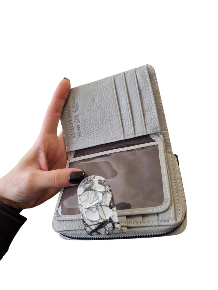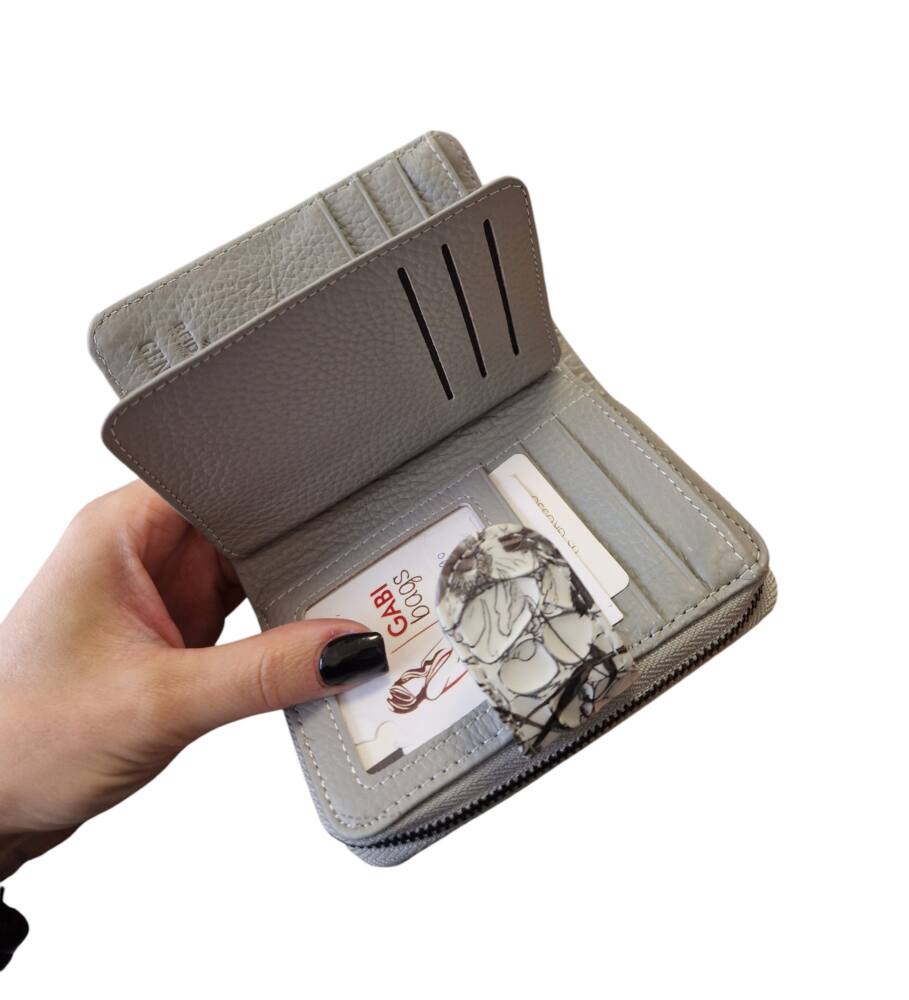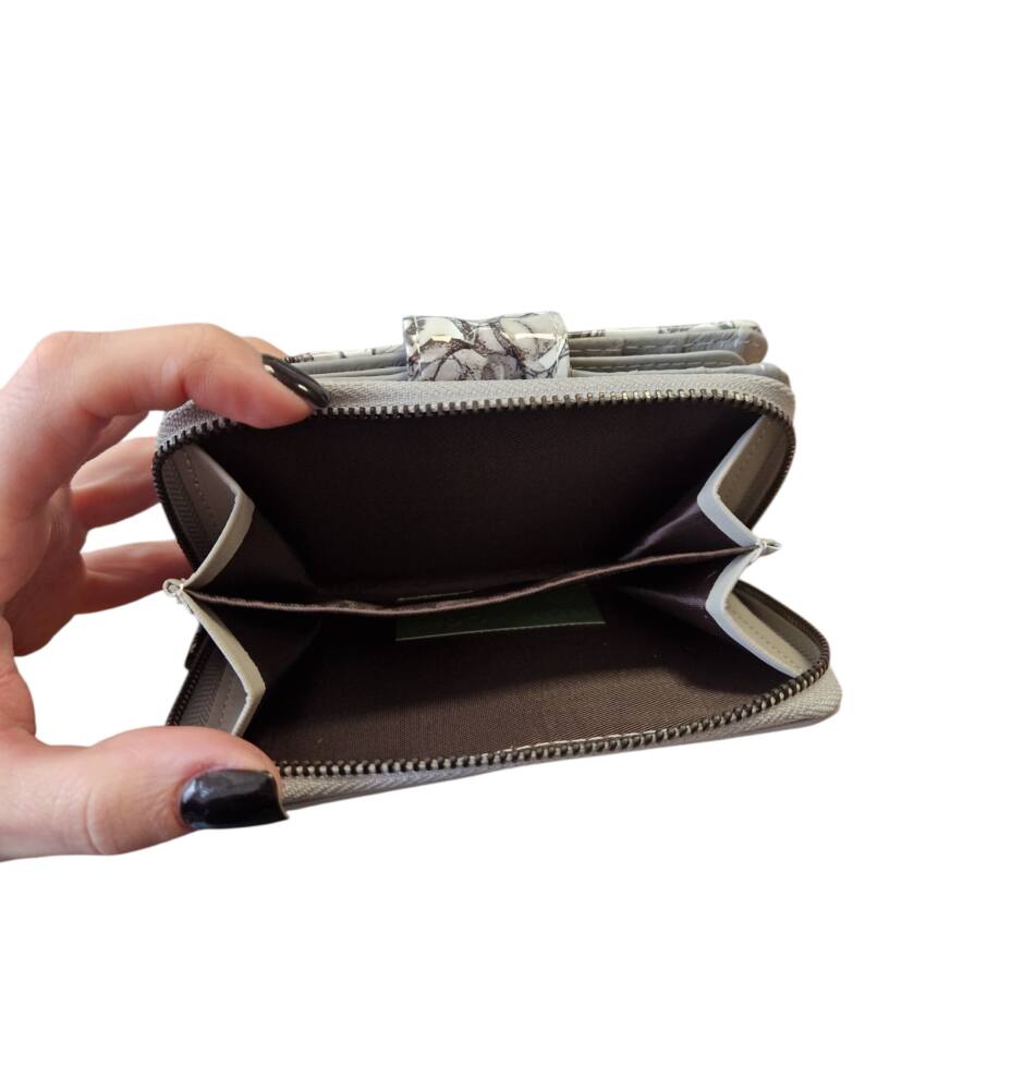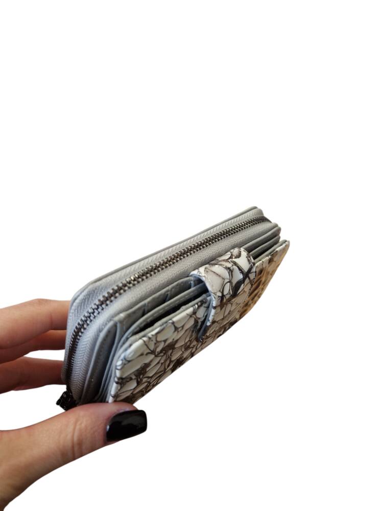 Elegantná dámska bielo šedá peňaženka s kvetinovým Modrým vzorom. Menšia veľkosť s lakovaným povrchom, vhodná aj do menších kabeliek. Množstvo úložného priestoru dva hlavné priečinky na zips a na cvok. Kvalitné spracovanie kože a moderný, nadčasový dizajn. Značka Grosso vyrobené na Slovensku.