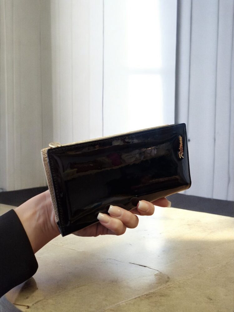 Elegantná, krásna dámska peňaženka s lakovaným povrchom a čierno zlatou farebnou kombináciou, rozžiari váš outfit. Veľká peňaženka vhodná do stredných a väčších kabeliek. Dva hlavné úložné priestory, jedna strana má zapínanie na magnety a druhá strana na zips. Kvalitné spracovanie kože a moderný dizajn od značky PETERSON.