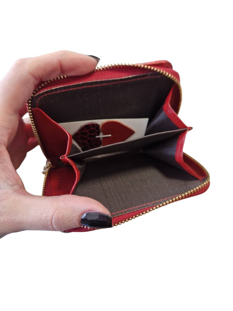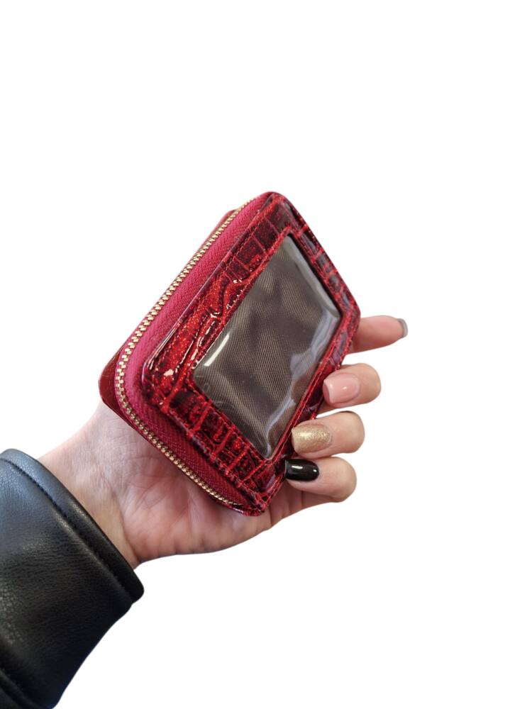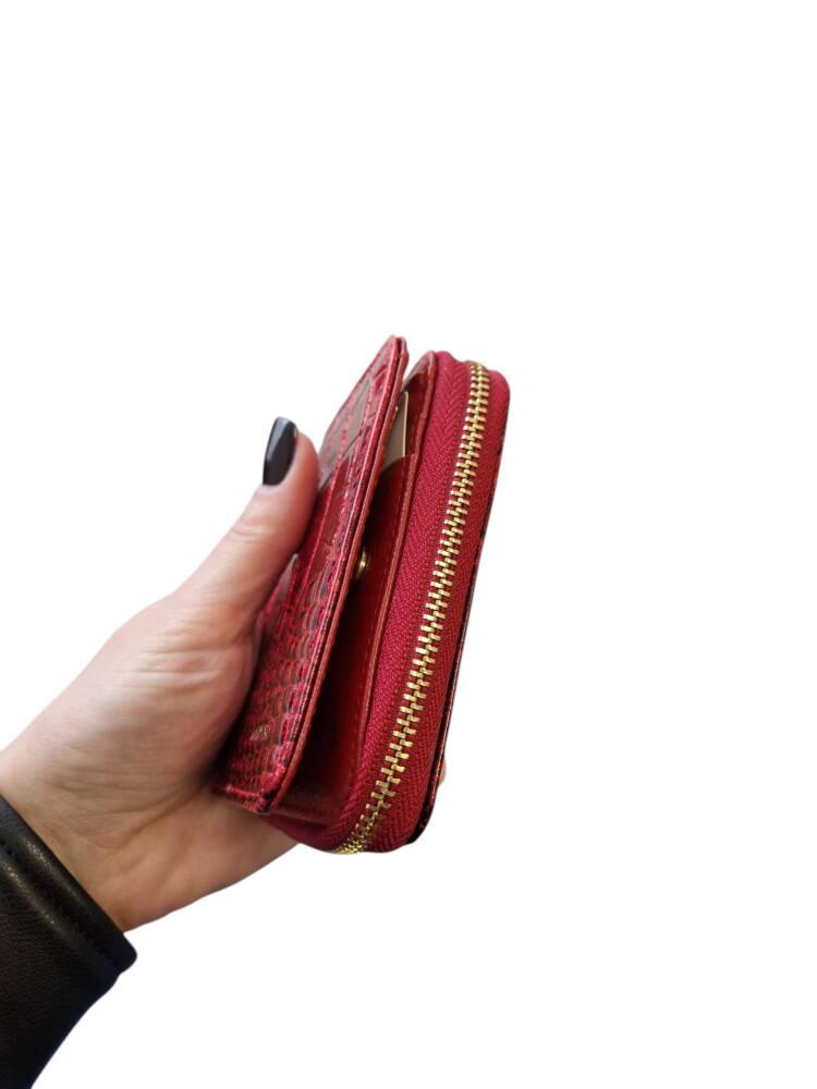 Štýlová, elegantná dámska peňaženka s lakovaným povrchom v červenej farbe s trblietkami. Peňaženka je menšej veľkosti no i napriek tomu má dva hlavné priestory. Jeden na cvok, ktorý slúži na karty a papierové peniaze, druhý na zips ktorý môžete použiť na mince alebo poskladané papierové peniaze. Vhodná aj do veľmi malých kabeliek, listoviek či ľadviniek. Moderný dizajn a kvalitné spracovanie.