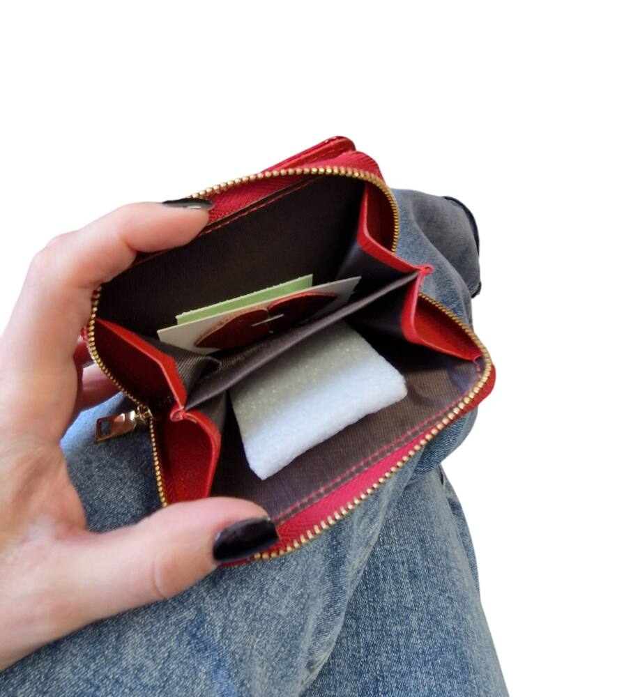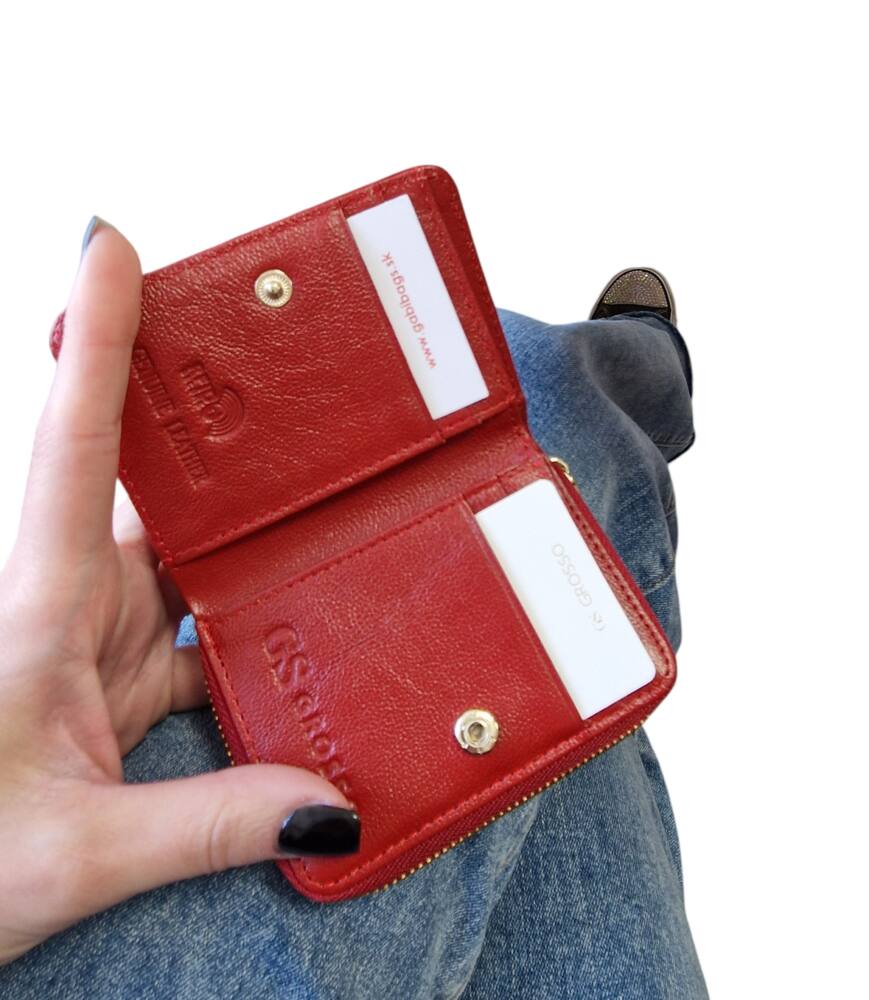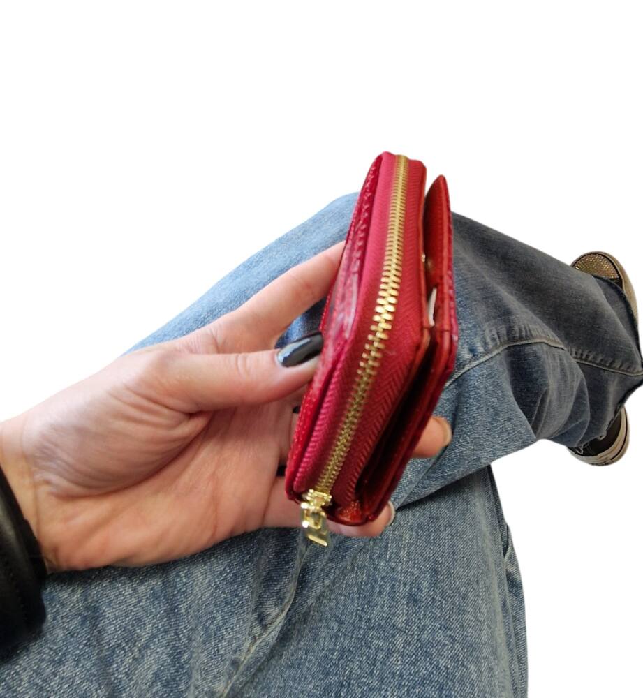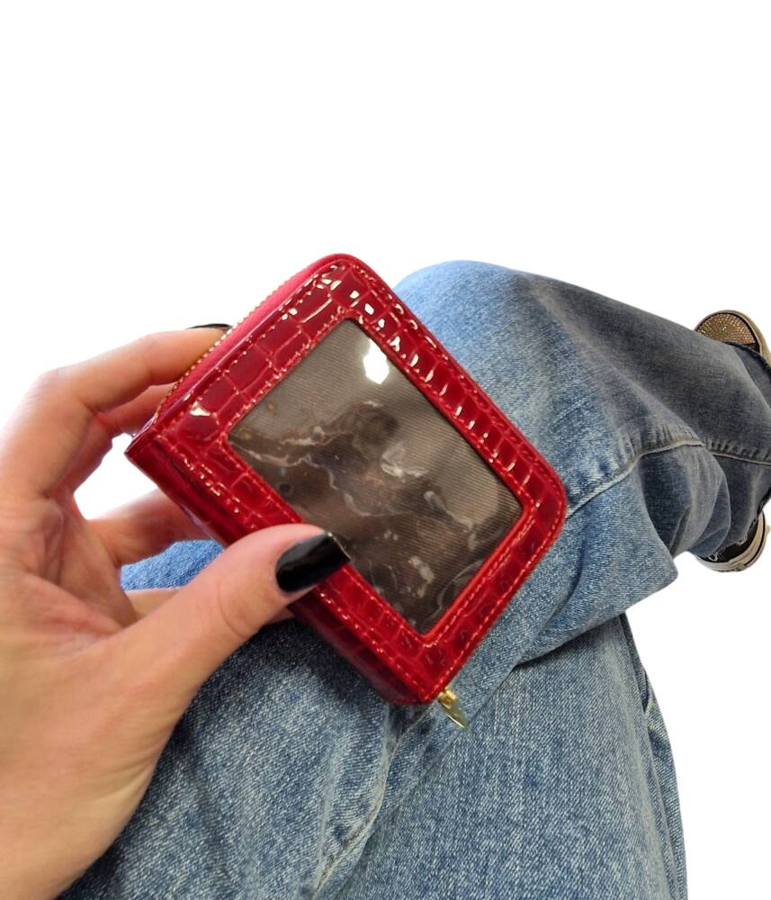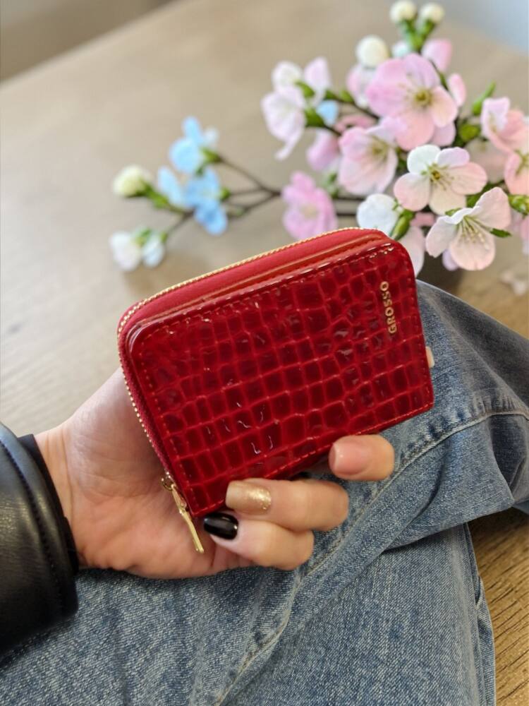 Štýlová, elegantná dámska peňaženka s lakovaným povrchom v červenej farbe so vzorom. Peňaženka je menšej veľkosti no i napriek tomu má dva hlavné priestory. Jeden na cvok, ktorý slúži na karty a papierové peniaze, druhý na zips ktorý môžete použiť na mince alebo poskladané papierové peniaze. Vhodná aj do veľmi malých kabeliek, listoviek či ľadviniek. Moderný dizajn a kvalitné spracovanie.