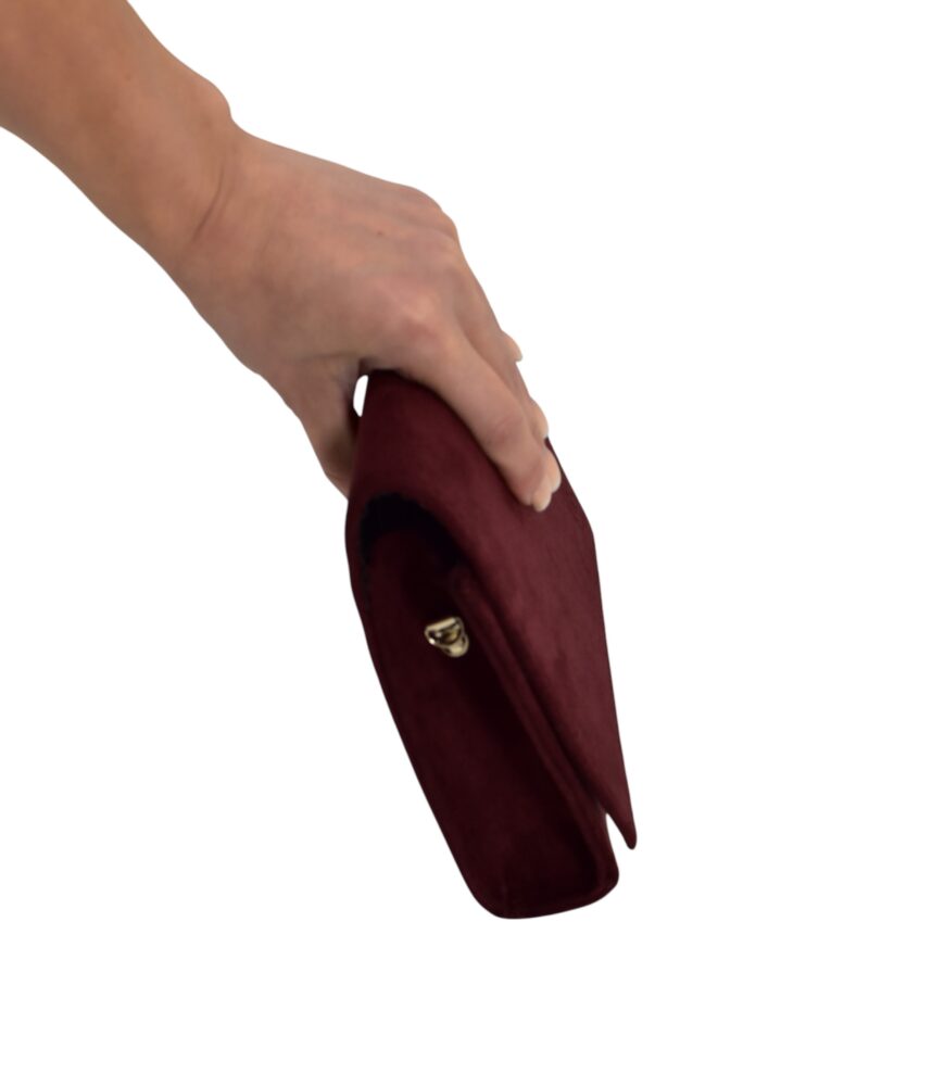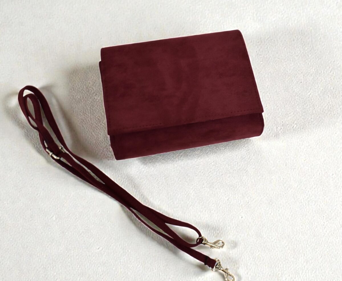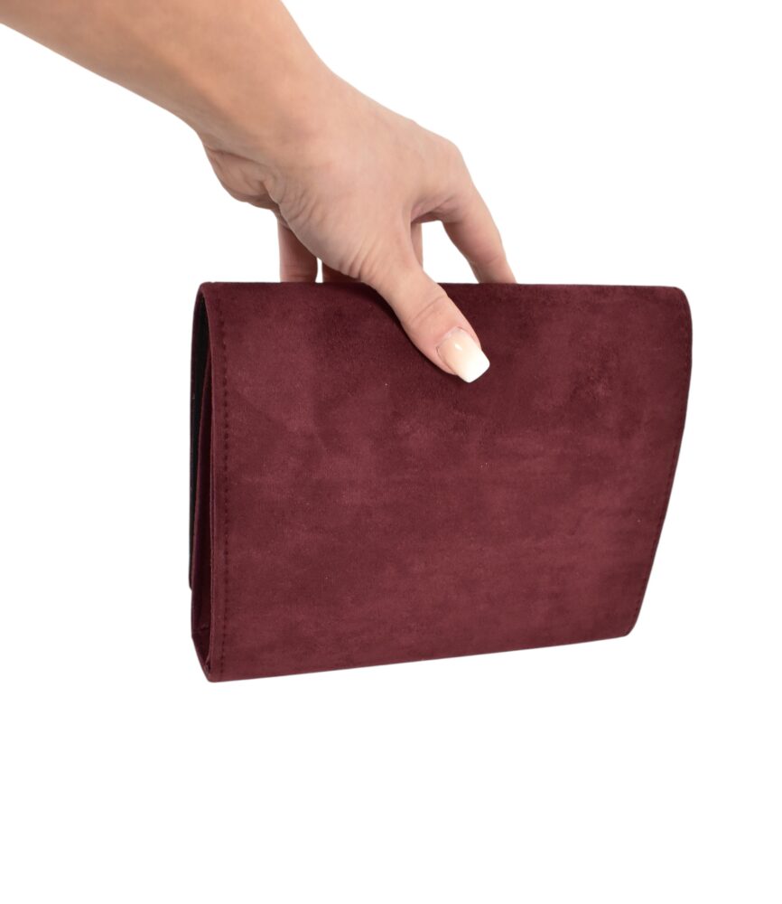 Semišová, elegantná dámska kabelka, listovka v bordovej farbe s prídavným nastaviteľným ramienkom, vďaka ktorému môžete nosiť kabelku aj na ramene či krížom cez plece. Štýlová kabelka do ruky, či už sa chystáte na svadbu, oslavu, stužkovú či len tak do mesta na drink.