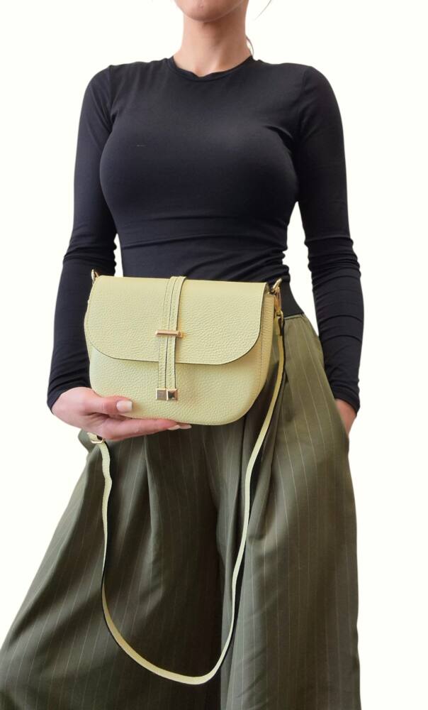Športovo elegantná dámska messenger kabelka v bledo žltej farbe krížom cez plece. Vhodná na každý deň k teniskám do mesta ale aj do spoločnosti k elegantnému oblečeniu. Kabelka má dlhé nastaviteľné ramienko, preto ju môžete nosiť na ramene, krížom cez plece alebo len tak do ruky. Kvalitné spracovanie kože a moderný dizajn.