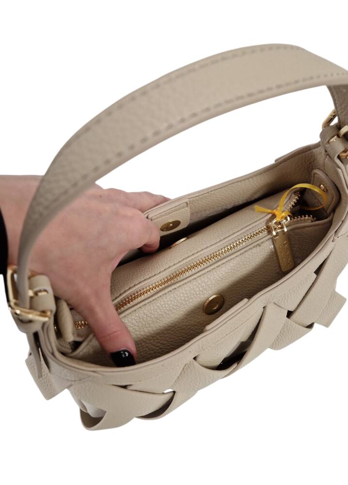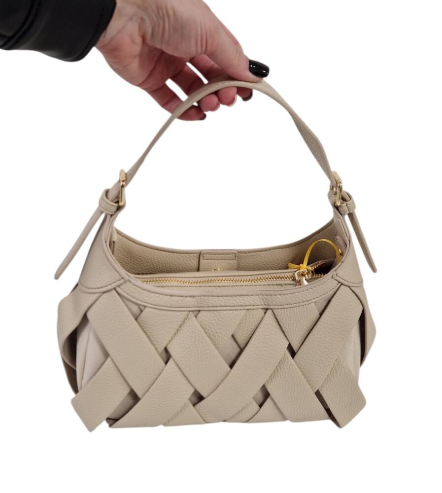 Nadčasová, športovo, elegantná dámska prepletaná kabelka v béžovej farbe v menšej veľkosti. Štýlová kabelka s dvomi ramienkami na výmenu – kratšie do ruky a dlhšie na rameno. Elegantný moderný dizajn na každý deň do mesta či na spoločenskú akciu. Kvalitné spracovanie z Talianskej dielne.