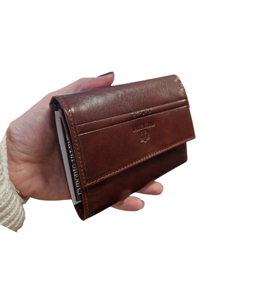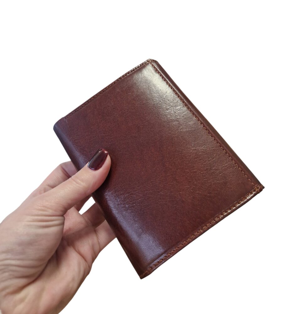 Elegantná pánska kožená peňaženka v tmavo hnedej farbe. Peňaženka vo väčšej veľkosti do stredných a väčších kabeliek/tašiek. Má kopu úložného priestoru na bankomatové karty so zapínaním na cvok (viď. obrázok), priestor na drobné mince a papierové peniaze. Moderný dizajn a kvalitné spracovanie.