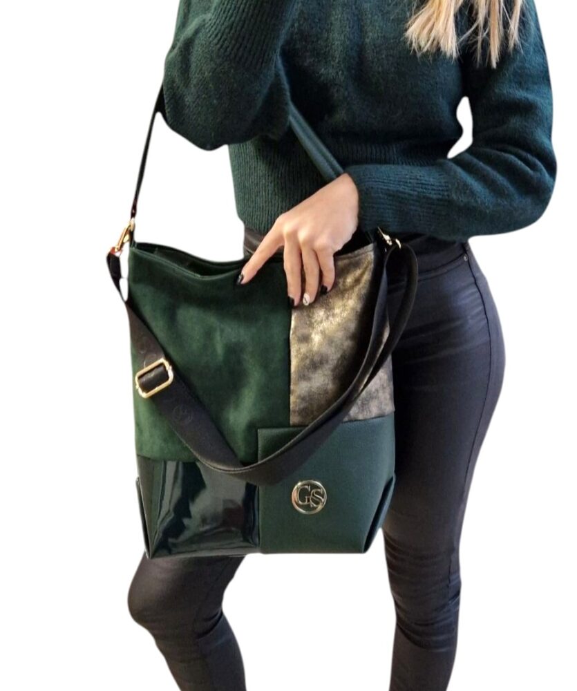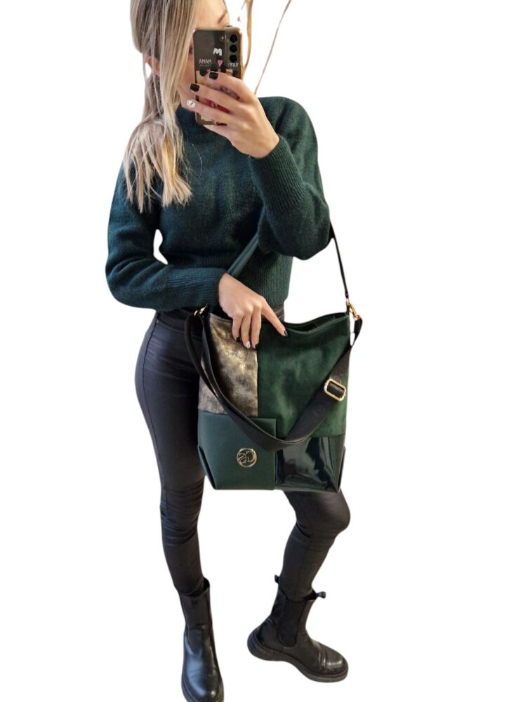 Praktická dámska shopper kabelka do ruky/na rameno v zelenej farbe kombinovanej so zlatou. Má neodnímateľné uško na rameno a jedno odnímateľné, nastaviteľné dlhé crossbody ramienko. Kabelka má moderný a zaujímavý dizajn. Veľkosť A4 vhodná aj do práce na dokumenty. Kvalitné spracovanie.