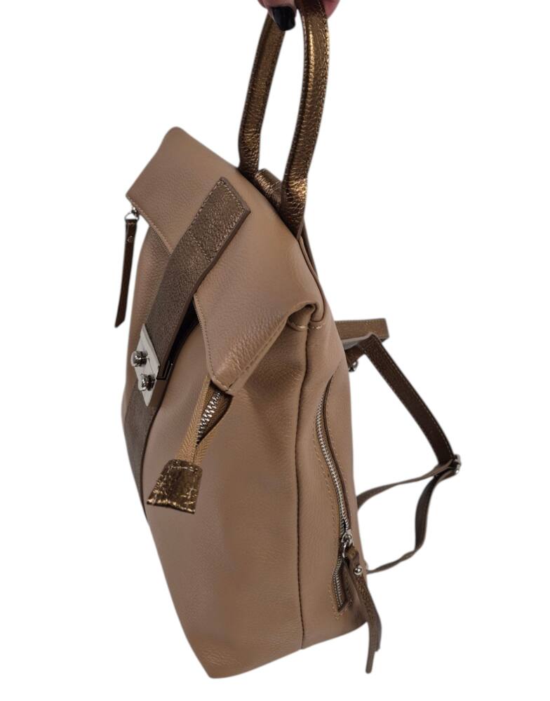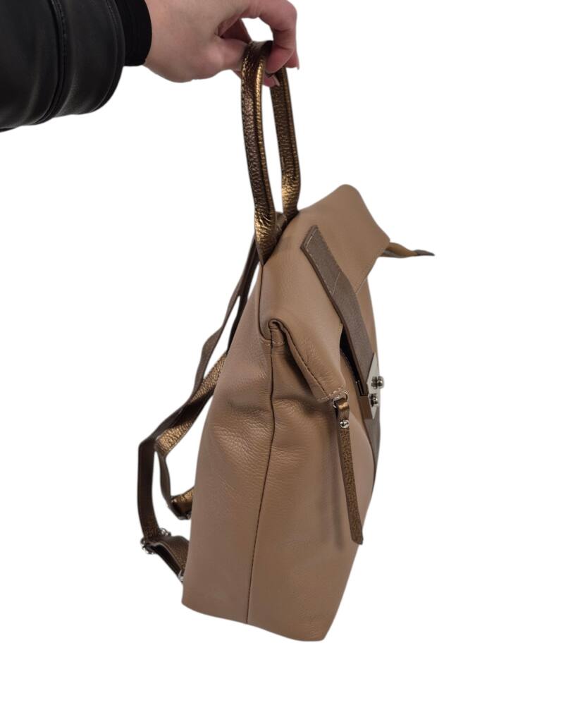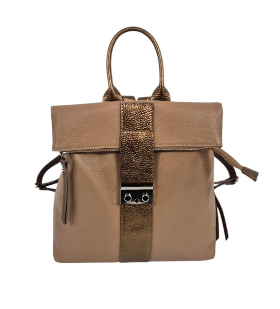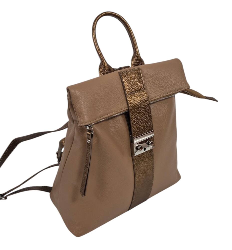 Športovo elegantný dámsky ruksak v hnedej + bronzovej farbe so strieborným kovaním. Vhodný na každodenné nosenie, do práce, školy, či na výlety. Bezpečnostné zapínanie na cvoky plus hlavný zips. Veľkosť A4 formát. Garancia kvality. Made in ITALIA.