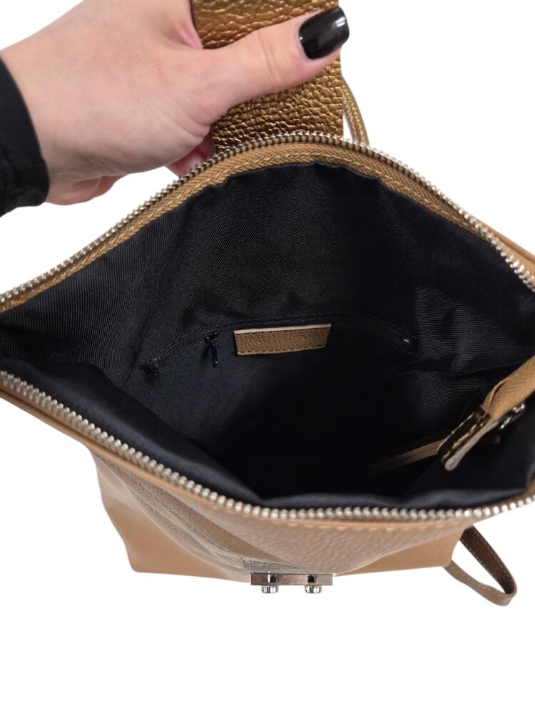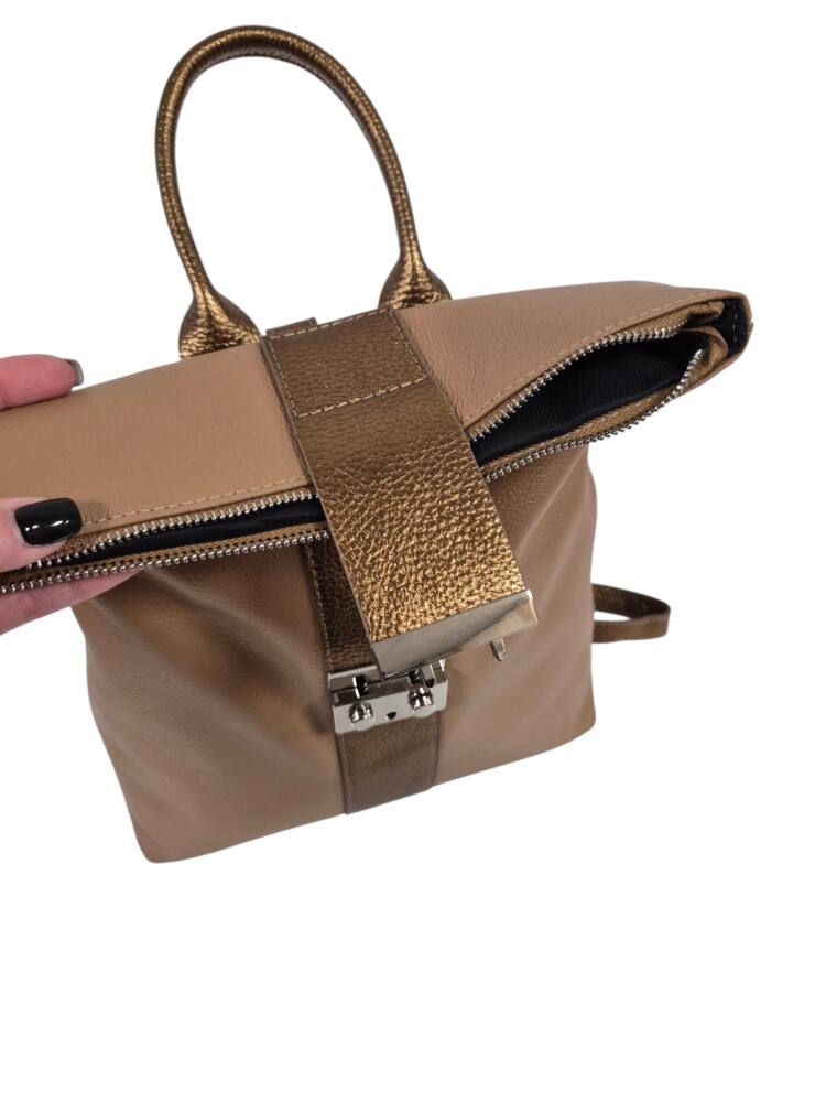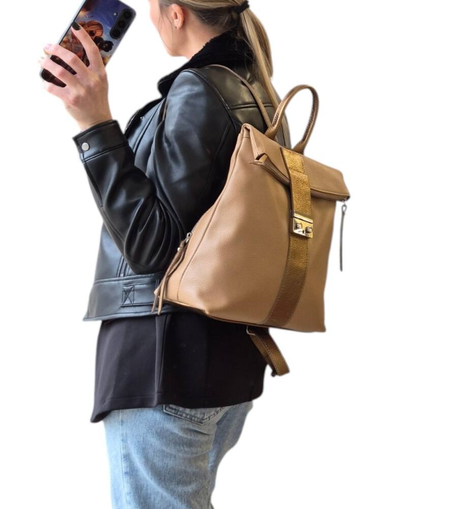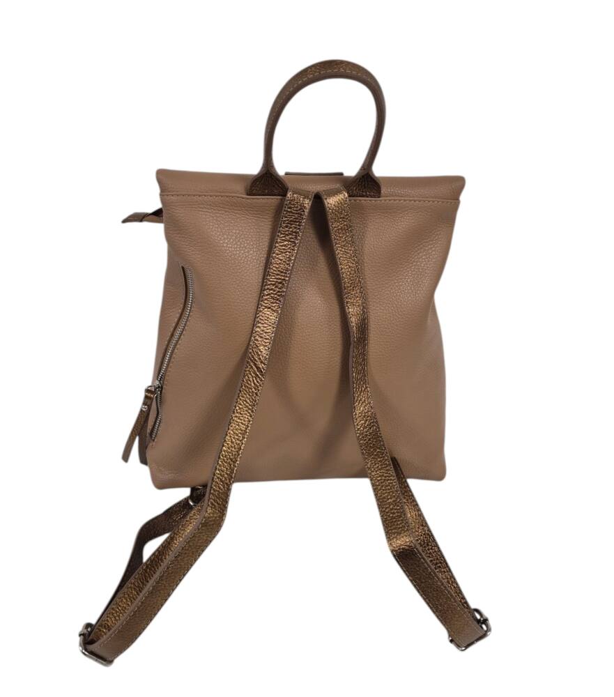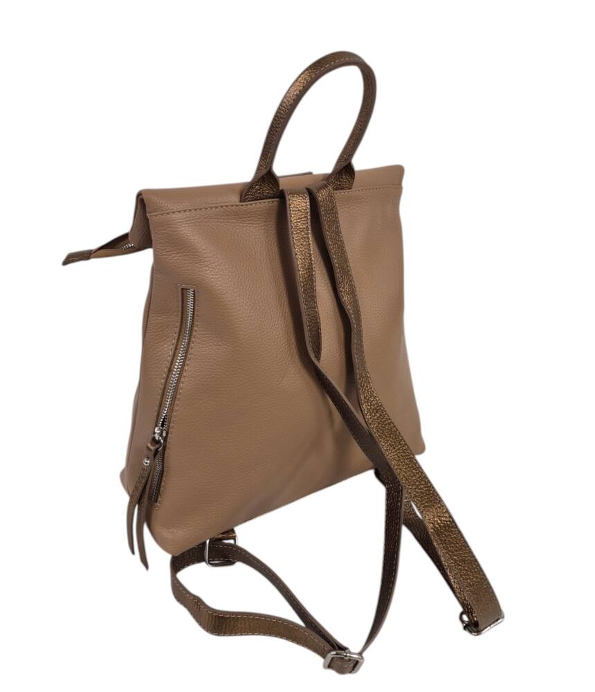 Športovo elegantný dámsky ruksak v hnedej + bronzovej farbe so strieborným kovaním. Vhodný na každodenné nosenie, do práce, školy, či na výlety. Bezpečnostné zapínanie na cvoky plus hlavný zips. Veľkosť A4 formát. Garancia kvality. Made in ITALIA.