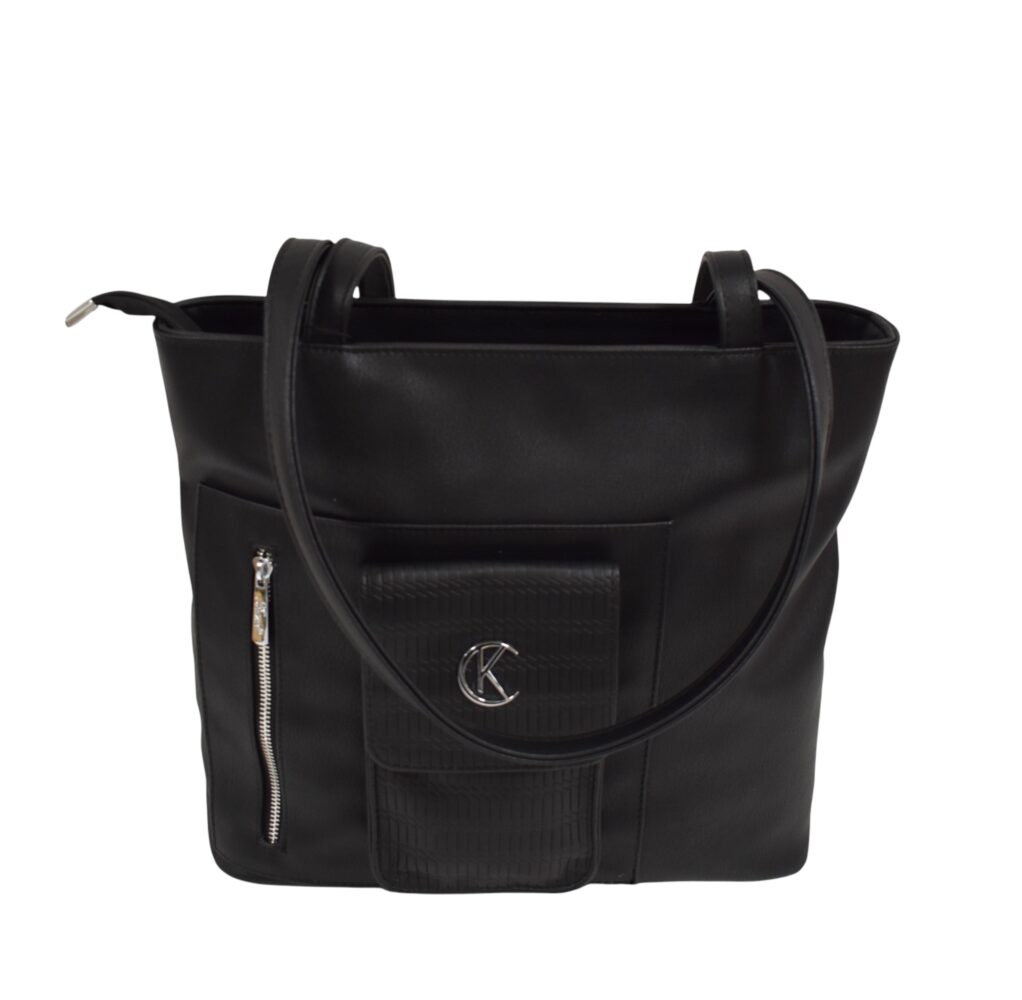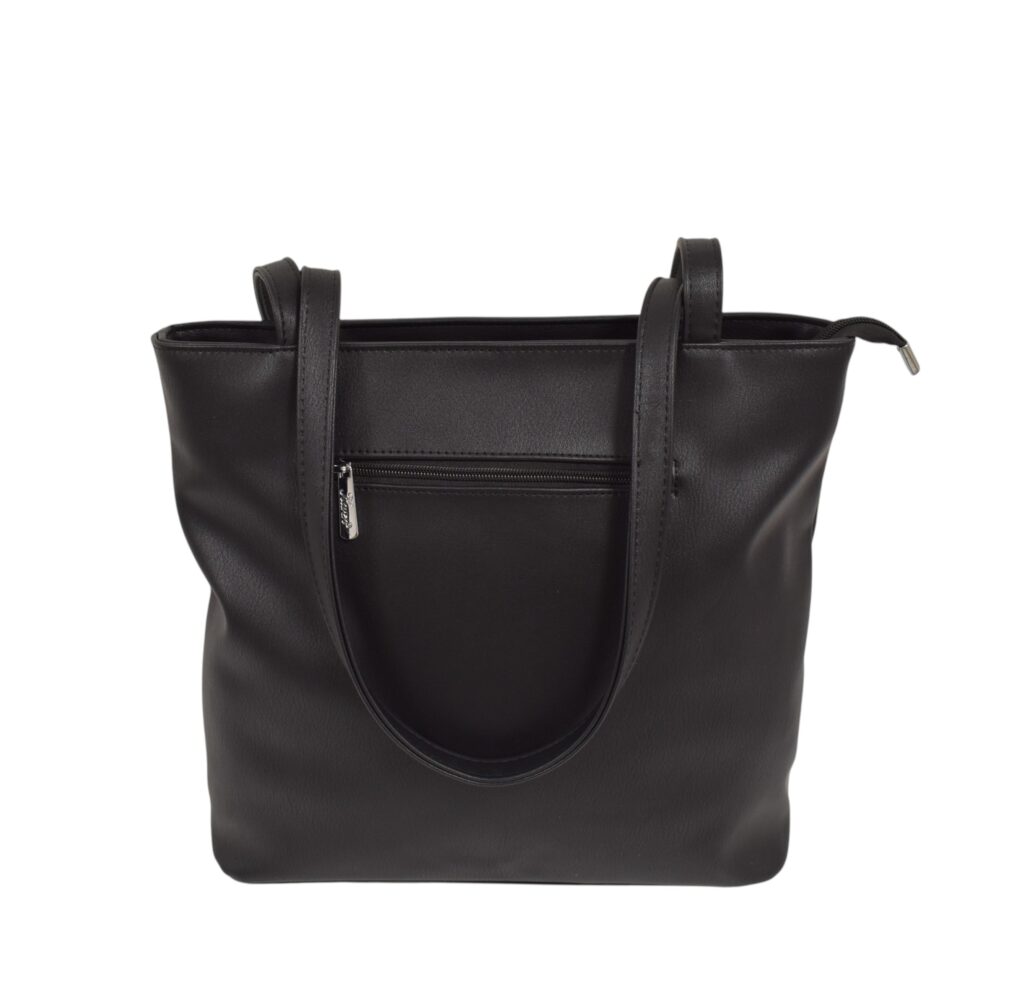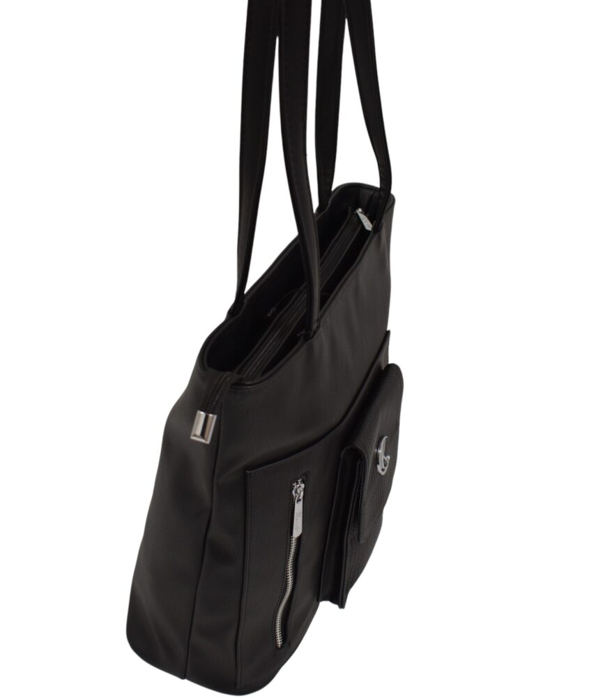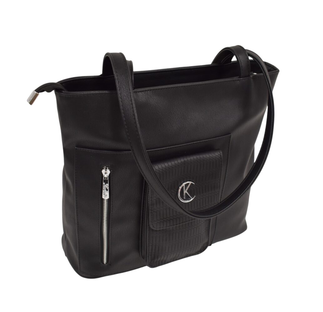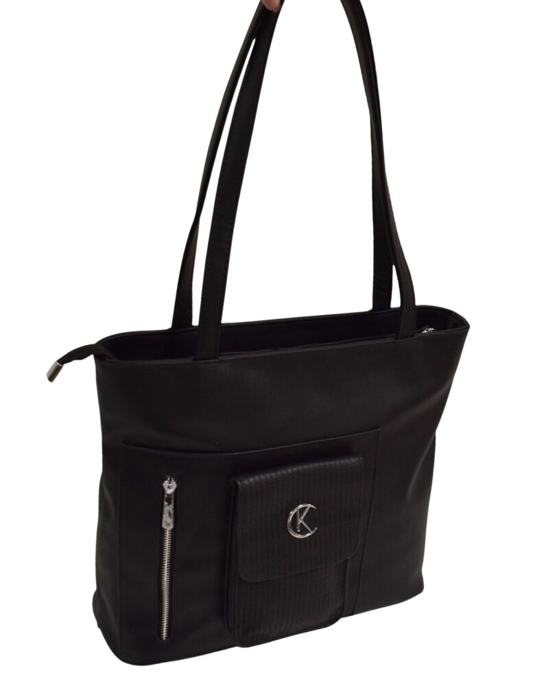 Praktická dámska športovo elegantná kabelka v čiernej farbe s dvomi dlhými ušami do ruky/na rameno. Kabelka do mesta vhodná aj do práce na rôzne spisy, vďaka veľkosti A4. Praktické vrecko na telefón plus vrecko so zipsom na kľúče. Kvalitné spracovanie kabeliek značky KAREN.