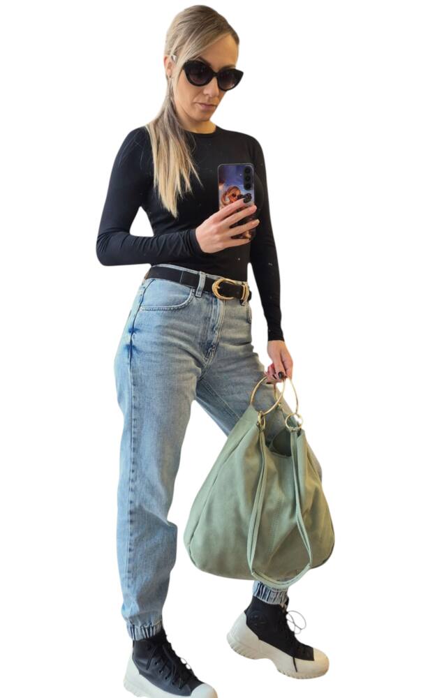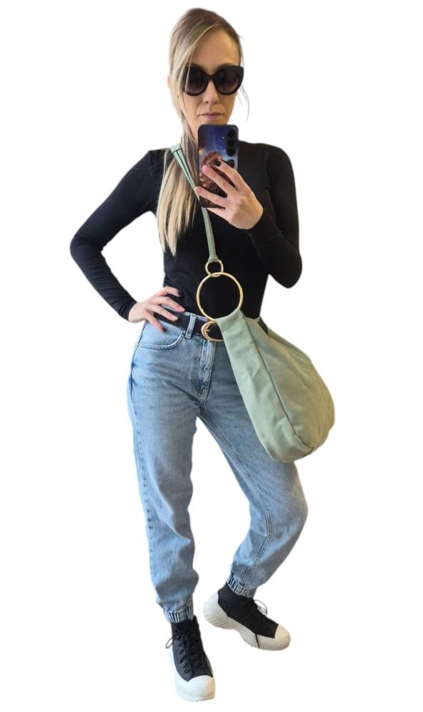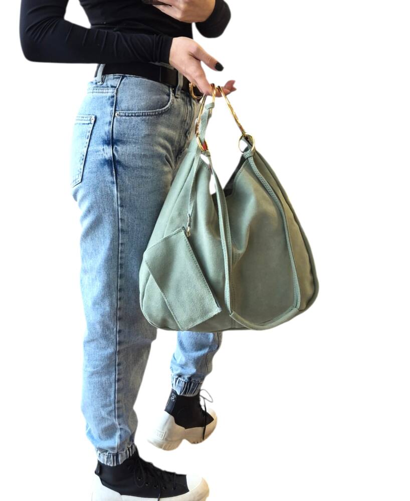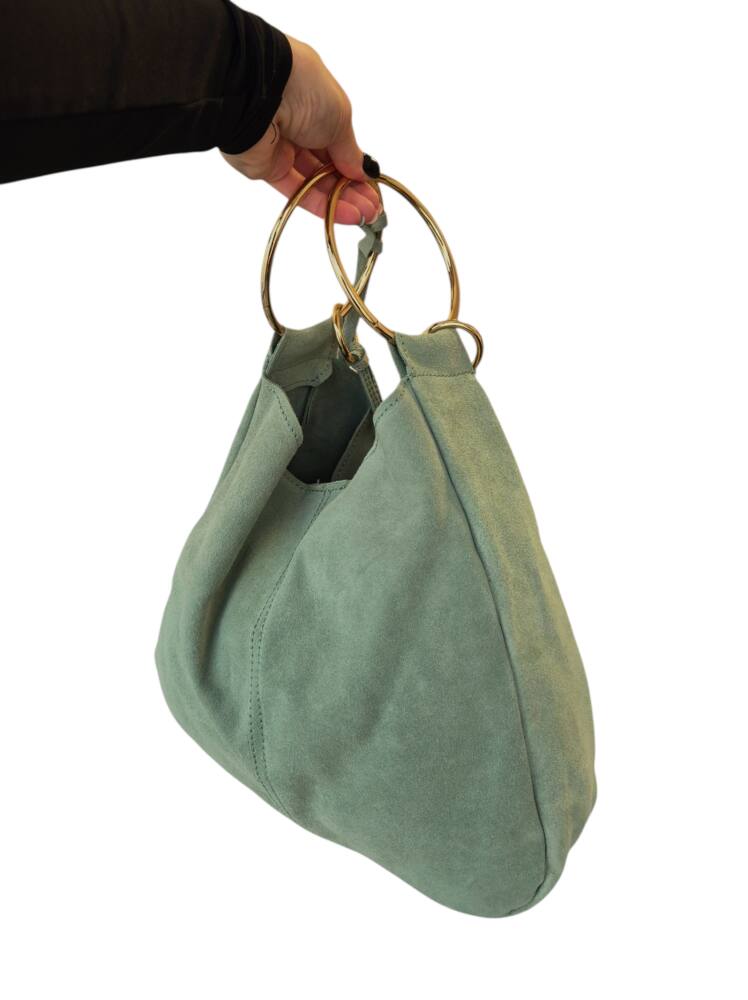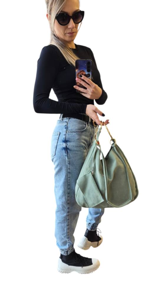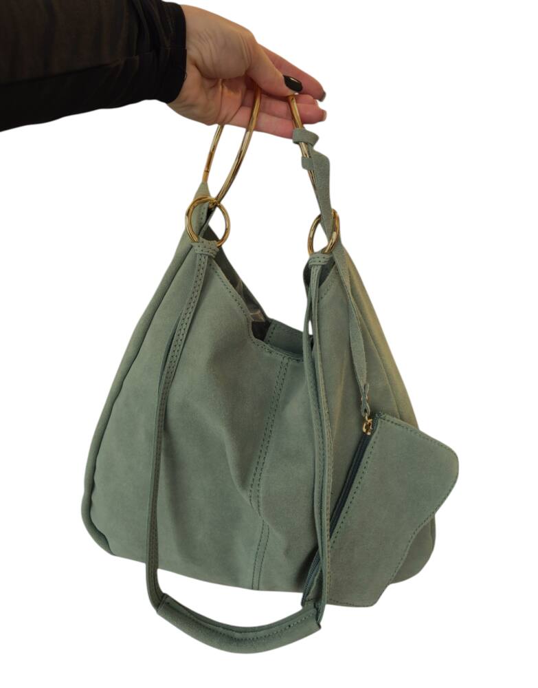 Praktická, športovo elegantná taško-kabelka v jemnej zelenej farbe z brúsenej kože s veľkými kovovými kruhmi – ušami. Kabelka väčšej veľkosti s dlhým ramienkom na rameno či krížom cez plece. Kabelka obsahuje aj malú taštičku na drobnosti. Vhodná na každý deň do práce, na výlet či dovolenku. Kabelka k športovo elegantnému štýlu oblečenia. Moderný nadčasový dizajn a kvalitné spracovanie.