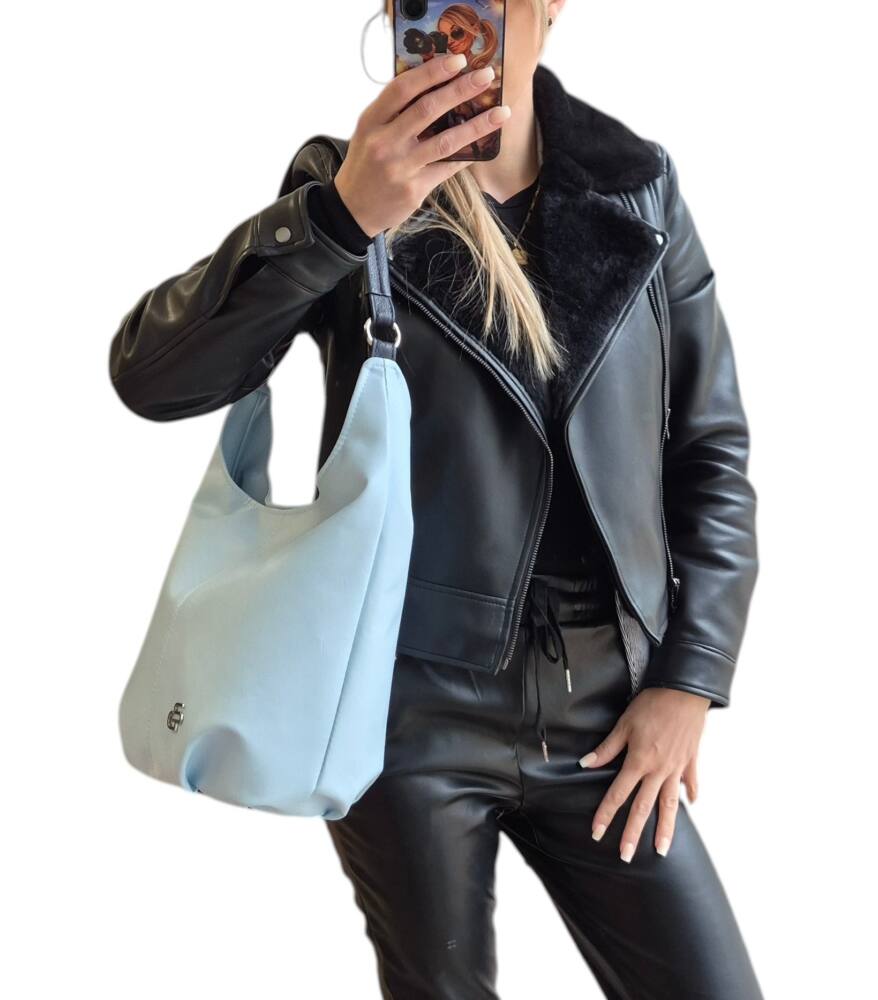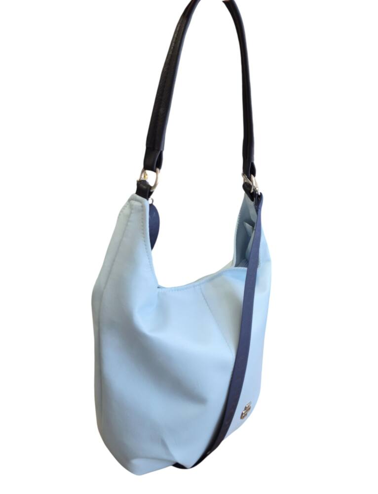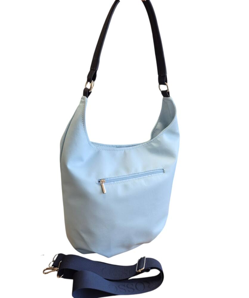 Väčšia dámska športovo elegantná kabelka do ruky na rameno v bledo modrej (baby blue) farbe s tmavo modrým ramienkom. Súčasťou kabelky je aj prídavné dlhé ramienko na pohodlné nosenie krížom cez telo ako crossbody. Vhodná na každý deň do práce či na výlet k rôznemu štýlu oblečenia. Moderný dizajn s dlhým crossbody ramienkom s množstvom úložného priestoru a vreckami na drobnosti. Kvalitné spracovanie od značky GROSSO šitej na Slovensku.