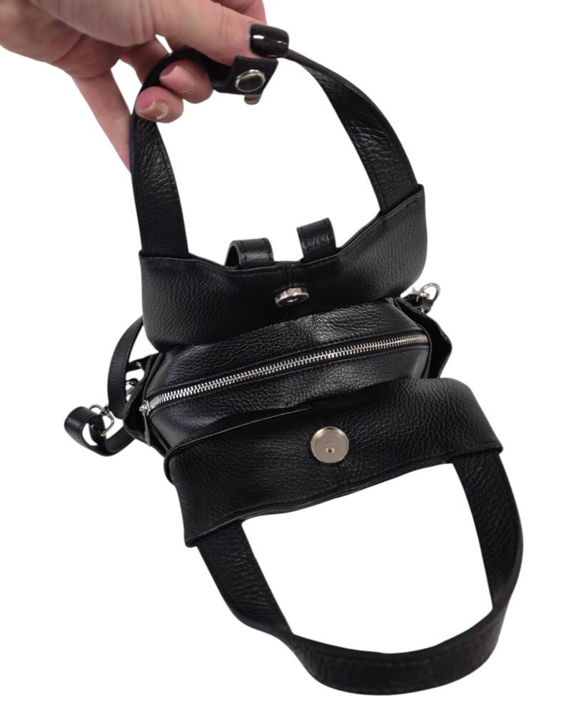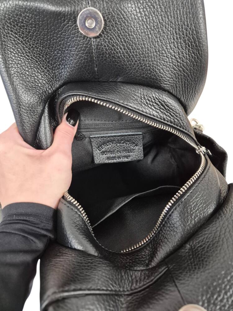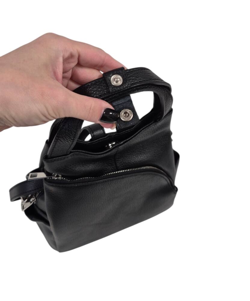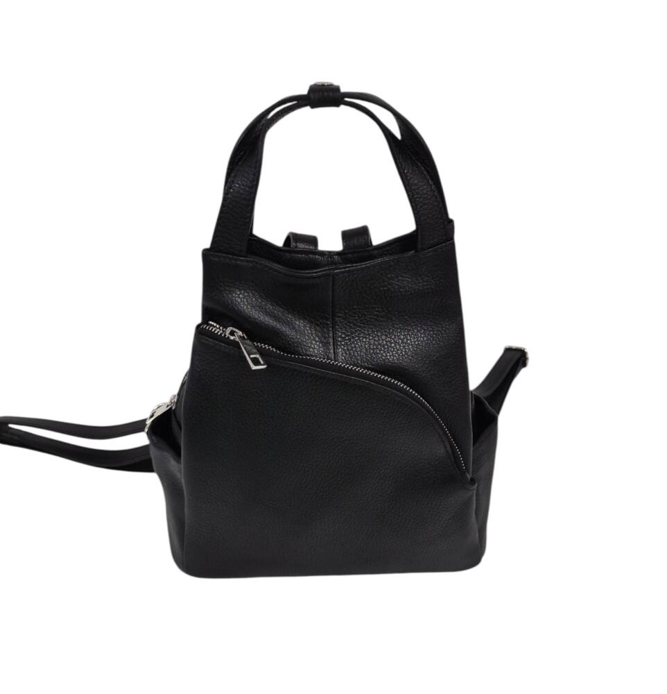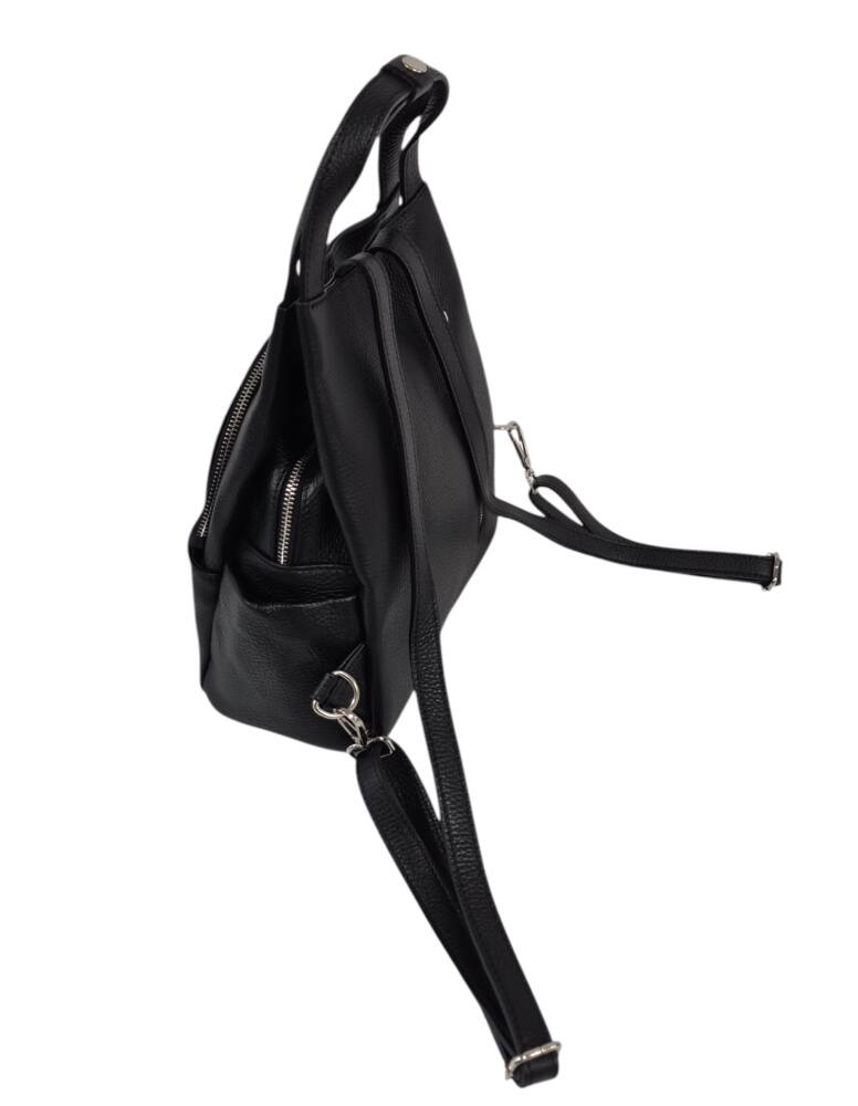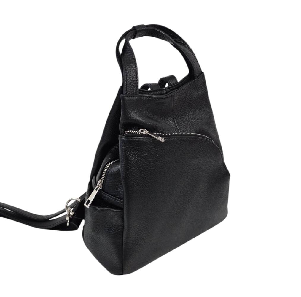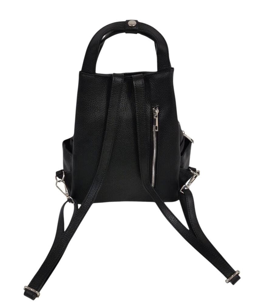 Praktický, štýlový dámsky ruksak v čiernej farbe. Stredná veľkosť batohu, ktorú môžete nosiť aj ako kabelku do ruky, vďaka dvom kratším uškám. Vhodné na každodenné nosenie k rôznemu štýlu oblečenia. Množstvo úložného priestoru na drobnosti, vrecká aj z bokov. Moderný dizajn a kvalitné spracovanie z Talianskej dielne.