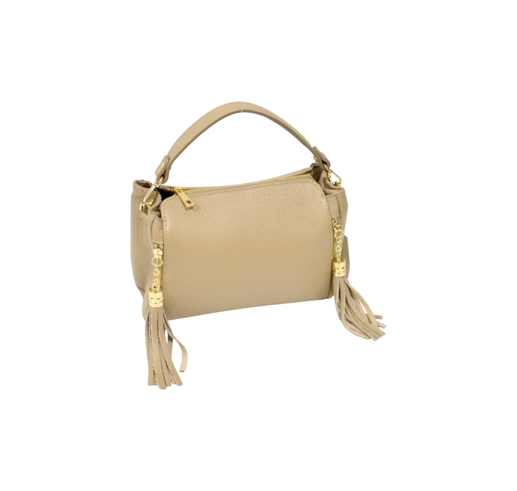 Elegantná kožená dámska kabelka v krásnej krémovo cappuccino farbe. Kabelka má dve odnímateľné ramienka, jedno krátke do ruky ktoré je nenastaviteľné a jedno crossbody nastaviteľné ramienko. Z prednej časti kabelky sú dva ozdobné zipsy so strapcami. Vnútro kabelky obsahuje stredovú prepážku na zips. Moderný dizajn a kvalitné spracovanie.